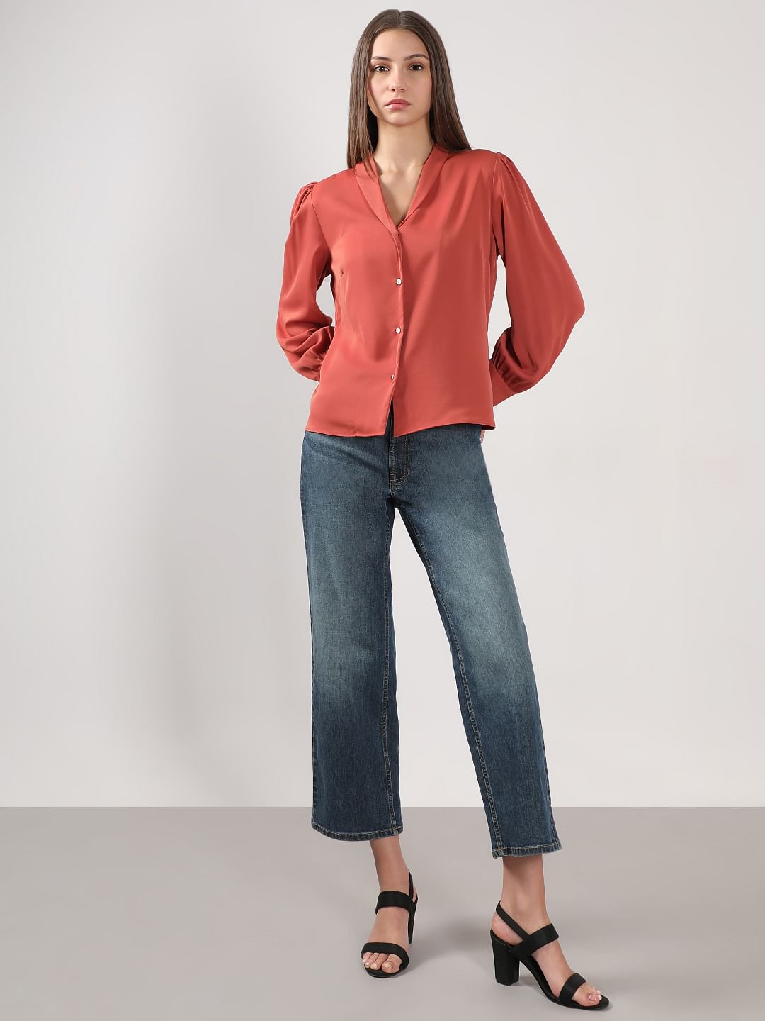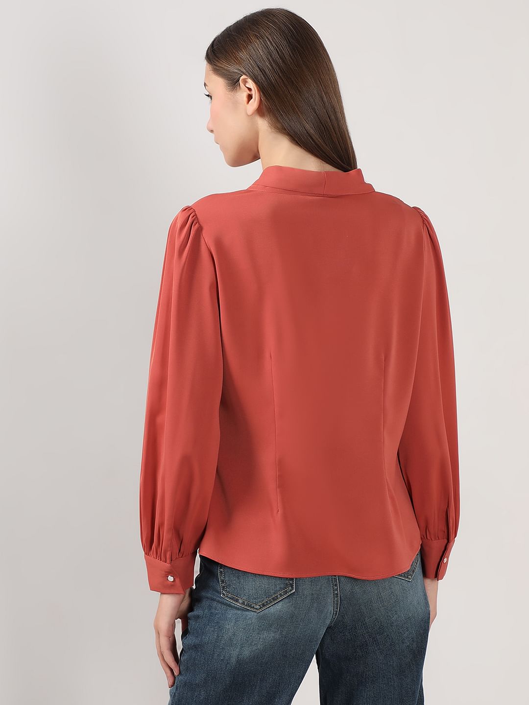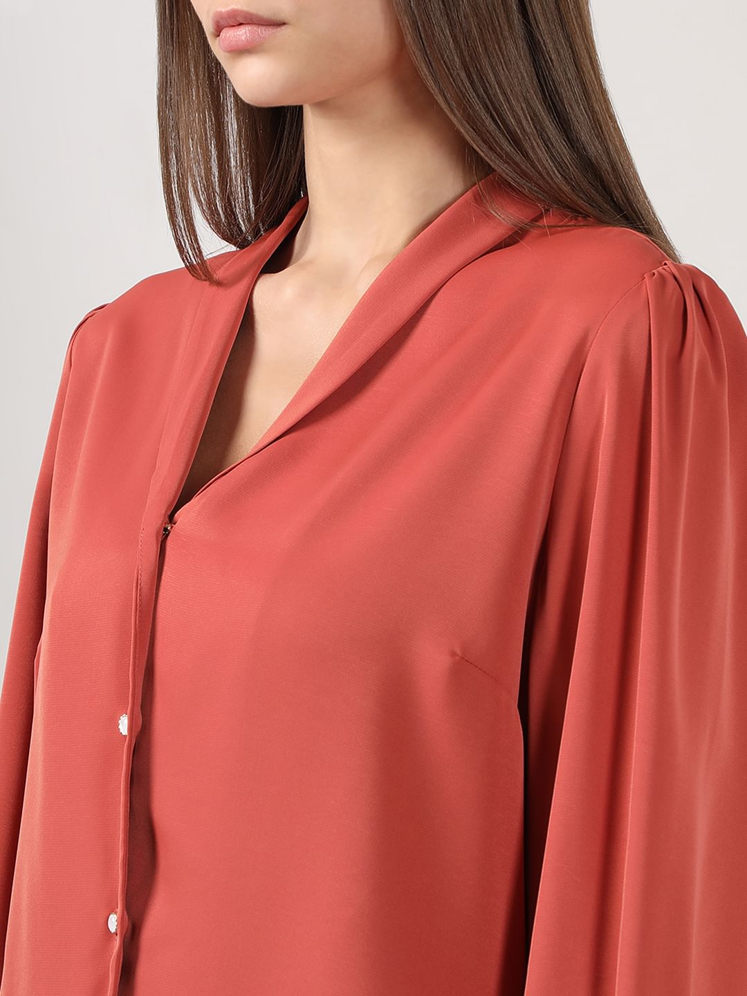Brighten up your wardrobe with this vibrant shirt. Designed with a chic V-neckline and notched collar, it features gathered full sleeves with cuff details for a stylish touch. The front button closure and back dart add structure, while the regular fit ensures all-day comfort. Falling just over the waist, it's a versatile pick for effortless styling.