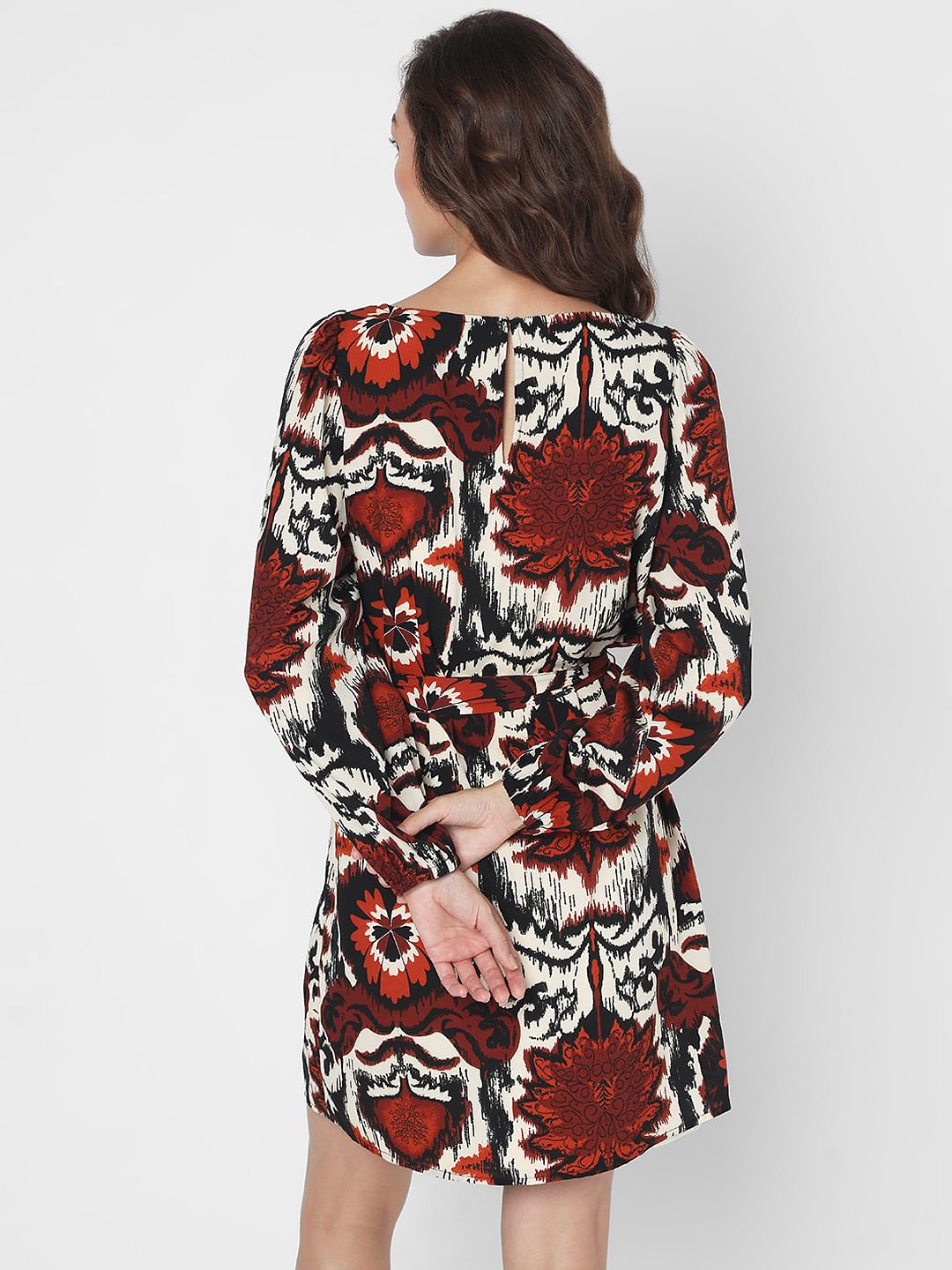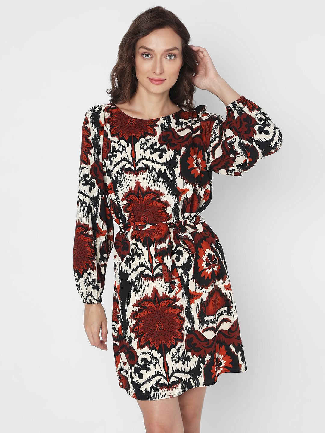 Women's abstract printed dress designed with a normal neck line, long puff sleeves, elasticated hem on sleeves, fit & flare silhouette and comes with a self-fabric tie up belt. Mini length dress and offers a regular fit.