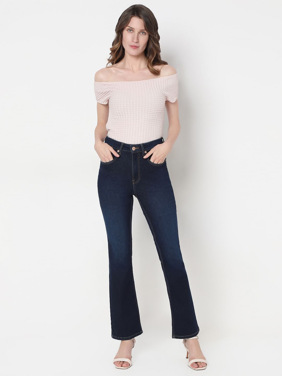These dark Blue high-Rise Flare Bootcut Jeans are a timeless addition to your wardrobe. Designed with a sleek zipper and button closure, they feature a flattering bootcut fit that elongates the legs, complemented by an ankle-length cut for a modern touch. The two front pockets and belt loops add functionality, making them both stylish and practical. A versatile pair that effortlessly blends comfort with sophistication.