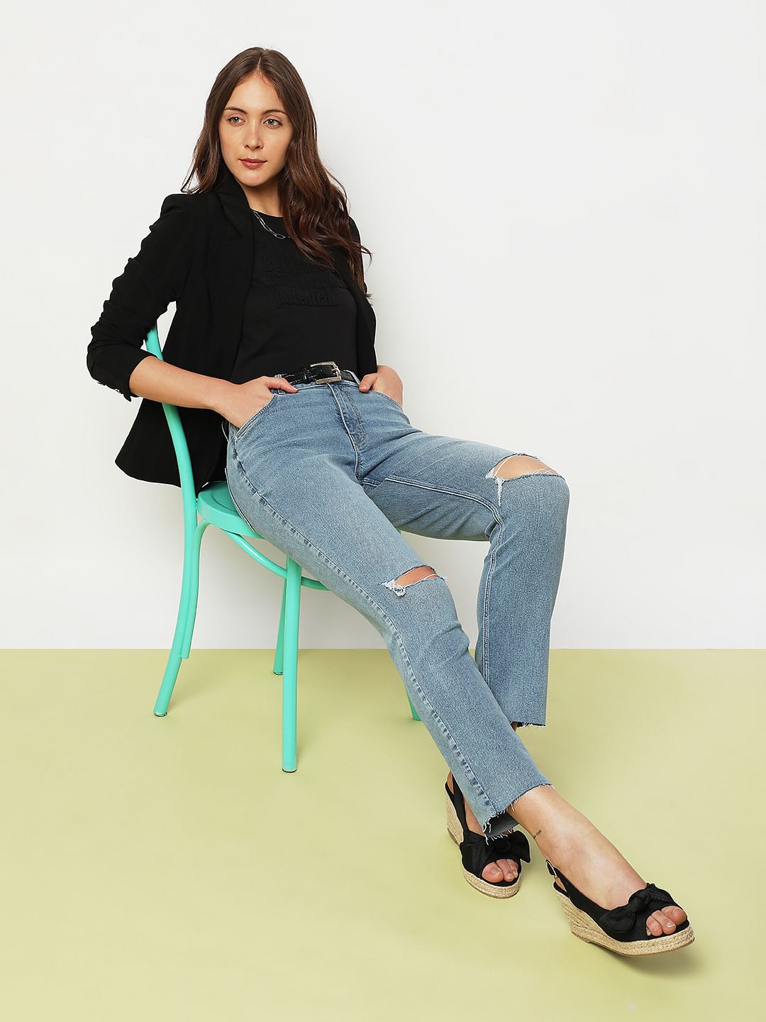 Black High Rise Frayed Hem Regular Fit Jeans Sale price₹1,999 Regular price₹3,999 50%OFF