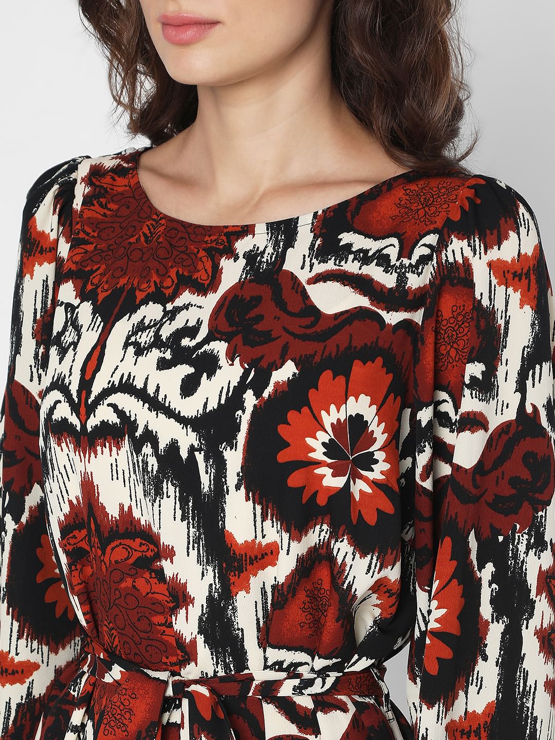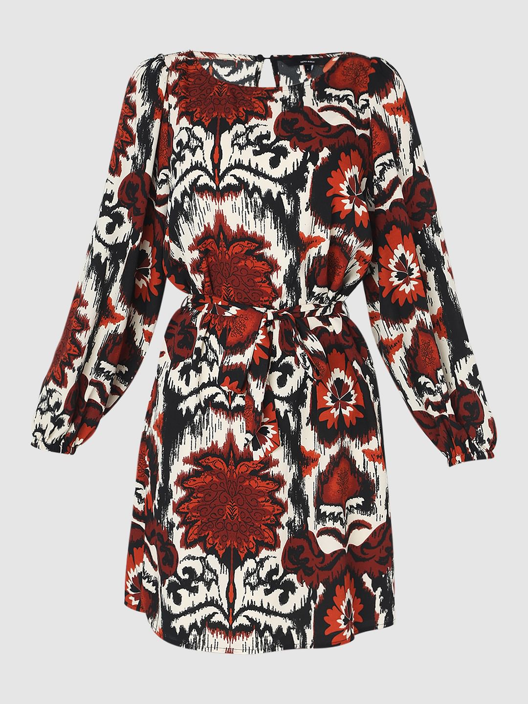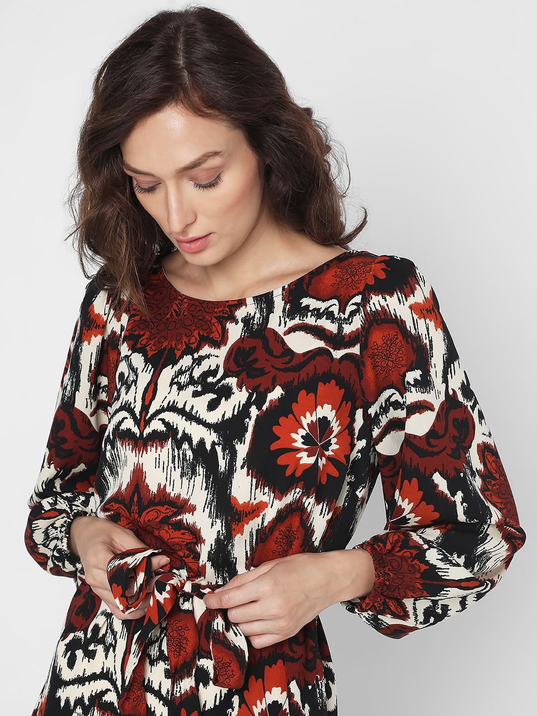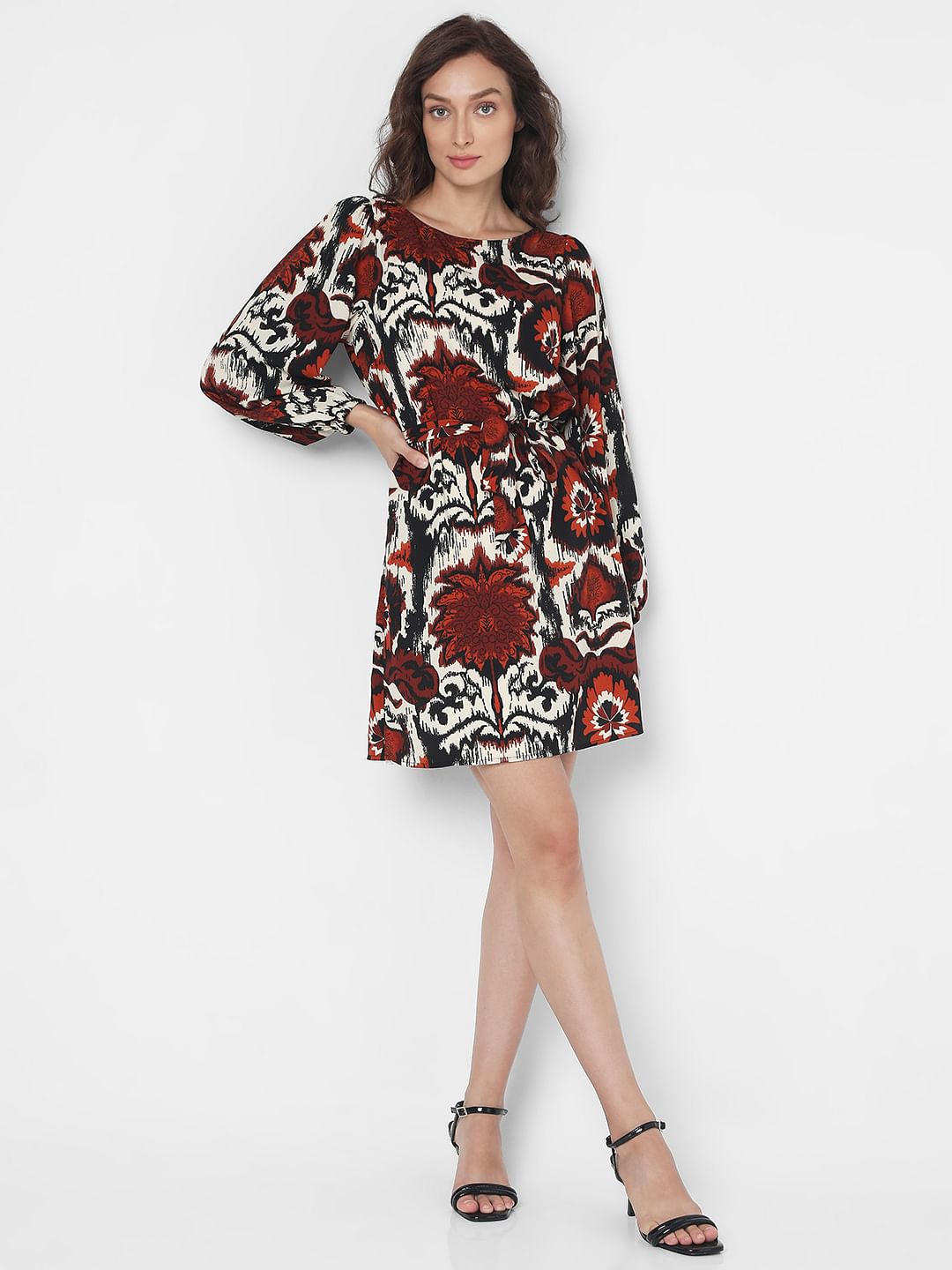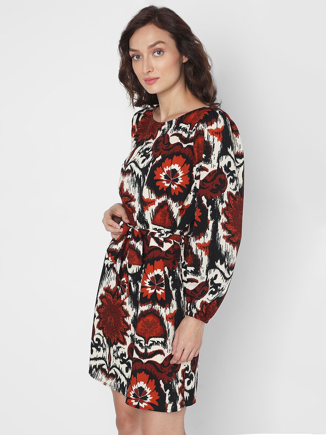 Women's abstract printed dress designed with a normal neck line, long puff sleeves, elasticated hem on sleeves, fit & flare silhouette and comes with a self-fabric tie up belt. Mini length dress and offers a regular fit.