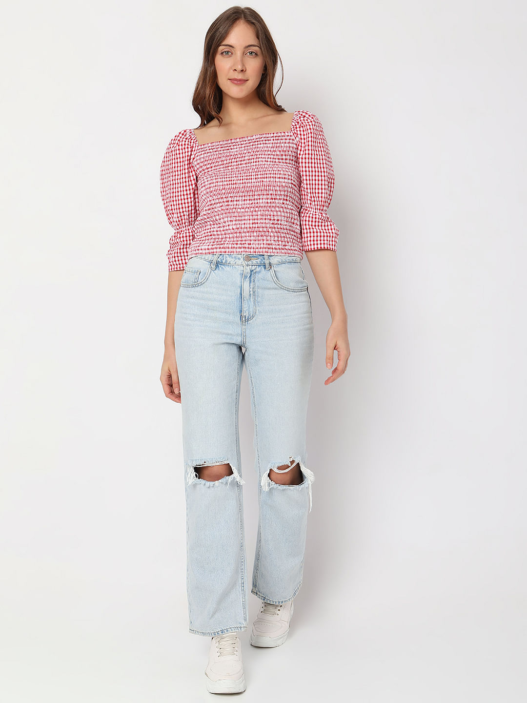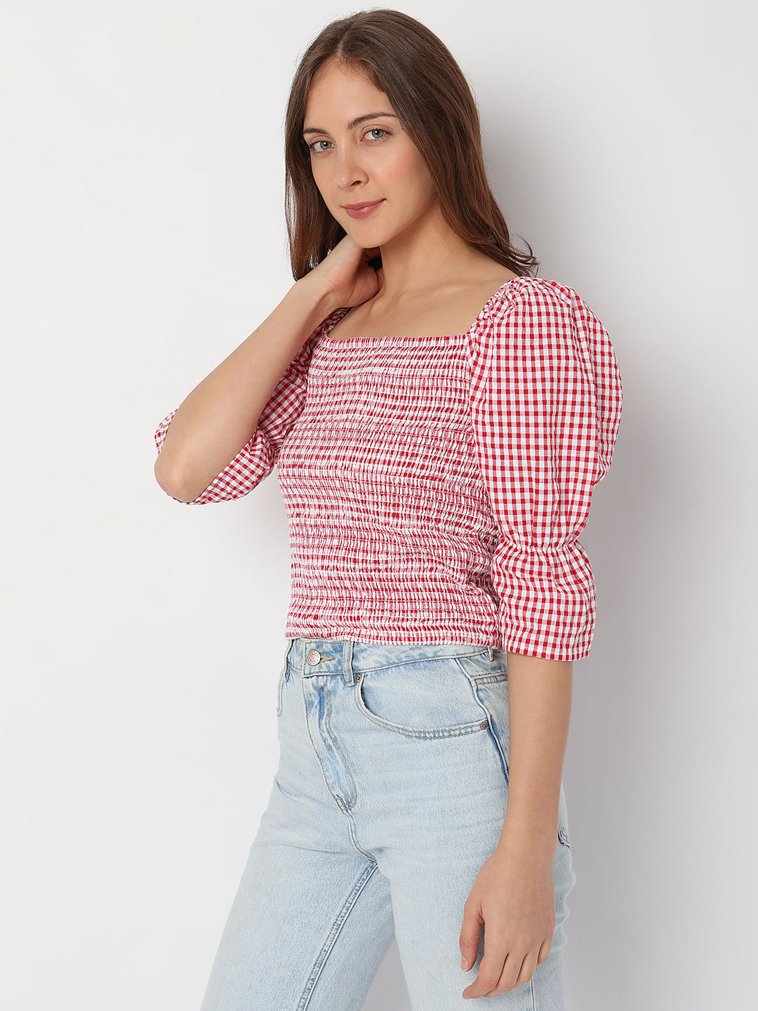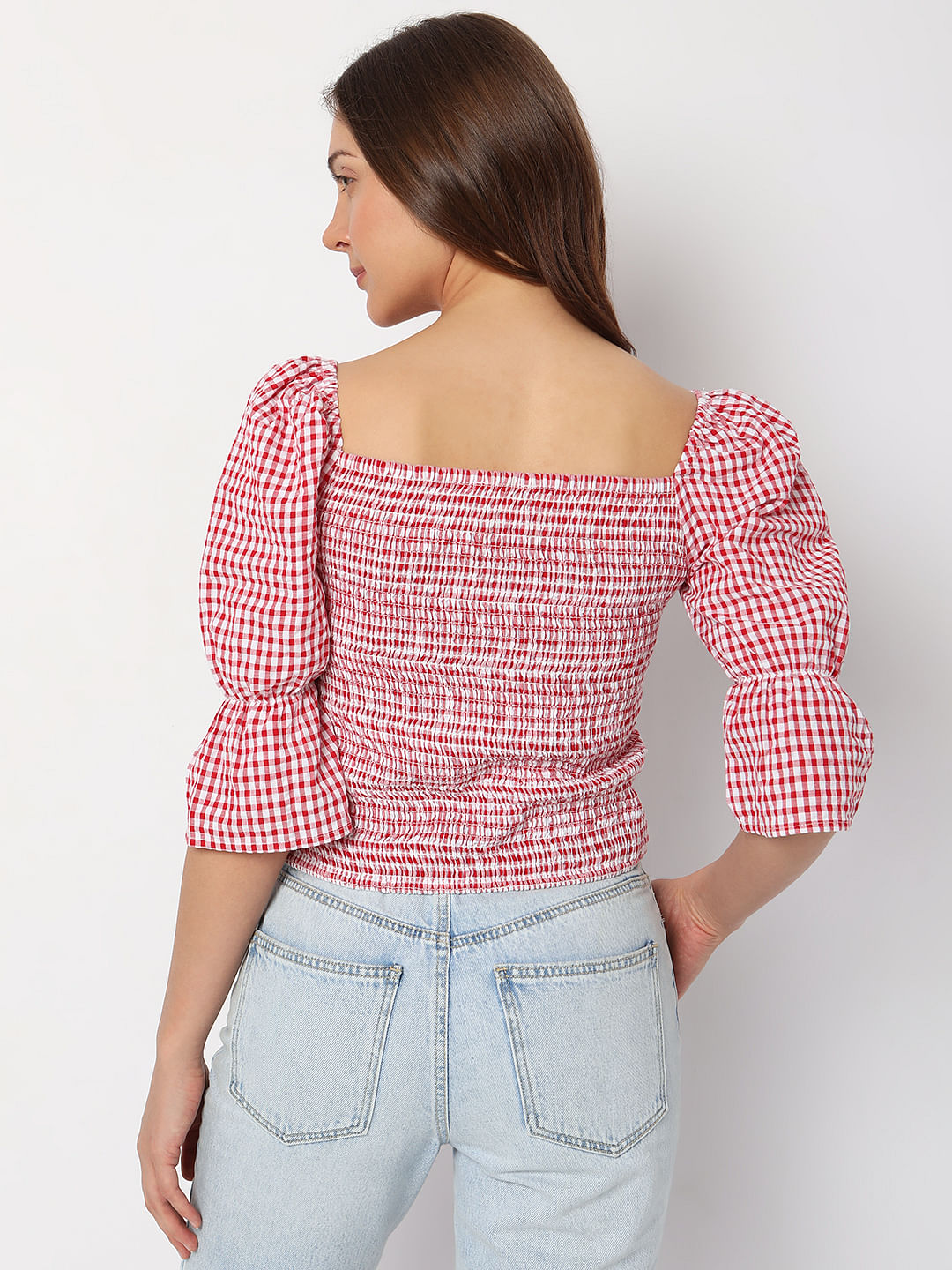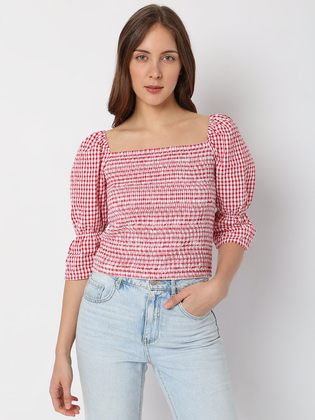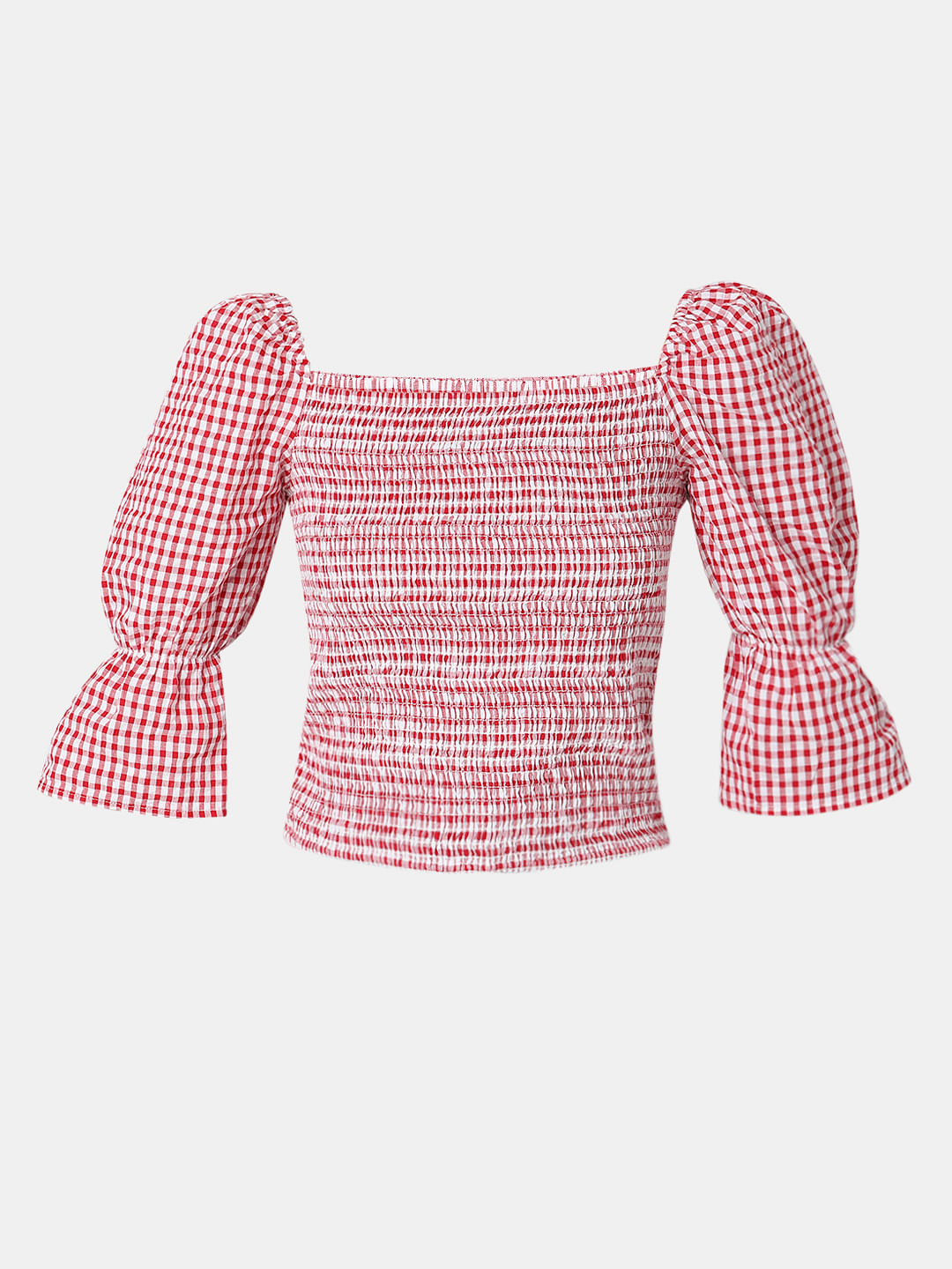 3/4th sleeves smocked top in a check print, puff sleeves, square neckline, elastic at shoulder, and falls at waist. Style with denims and sneakers for an effortlessly chic look.