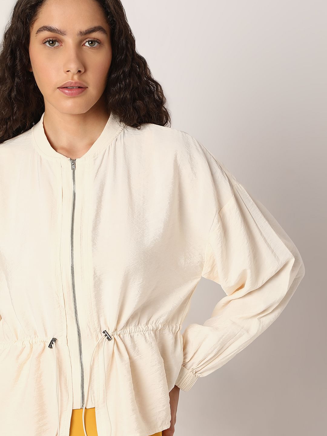 Elevate your wardrobe with this chic, solid cream top. Crafted with long sleeves and a sophisticated band collar, it features a subtle zip closure for an effortless finish. The design is accentuated by delicate drawstrings at the sides, adding a touch of modern elegance. Drop shoulders and elastic cuffs lend a relaxed yet refined silhouette, while the length falls gracefully below the hips, making it a versatile piece for any occasion.