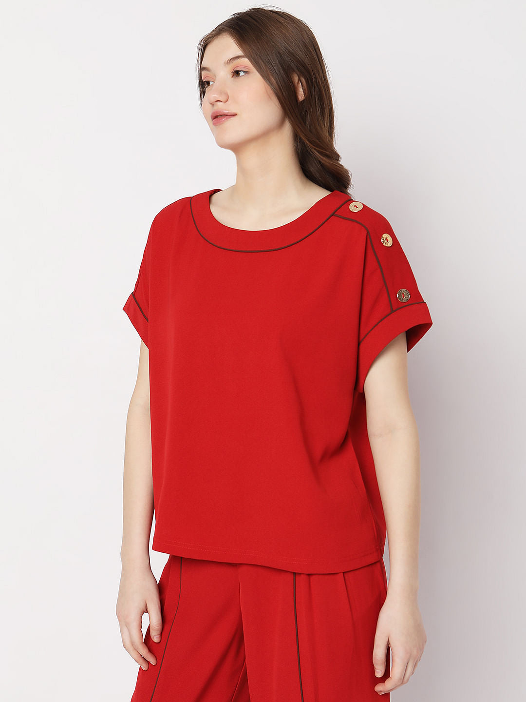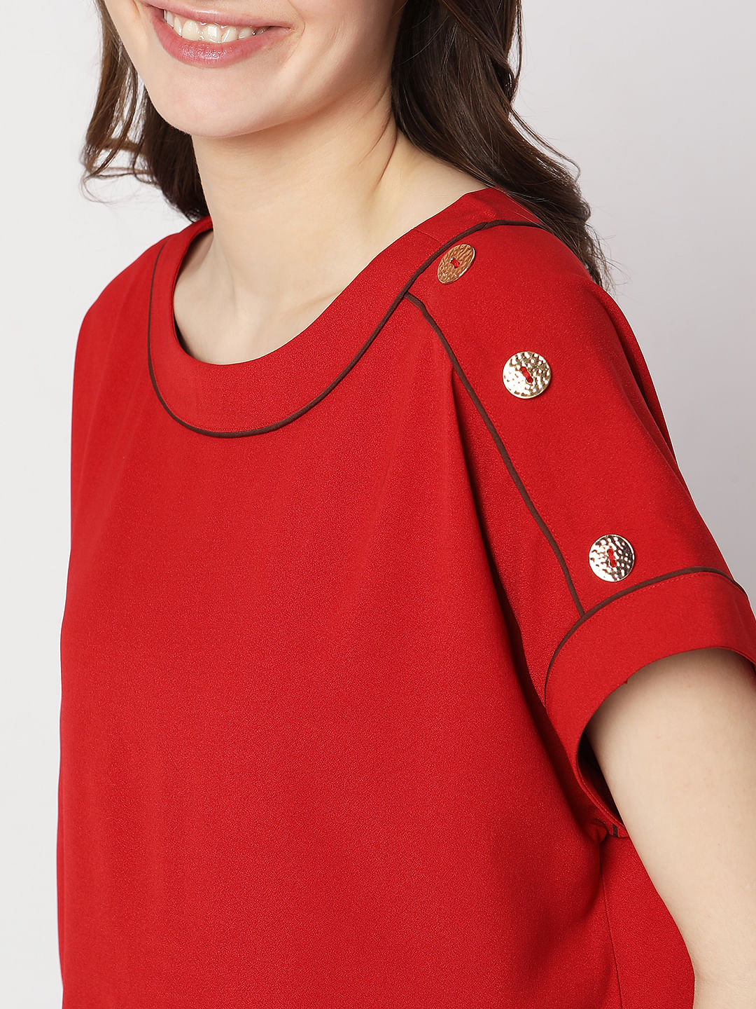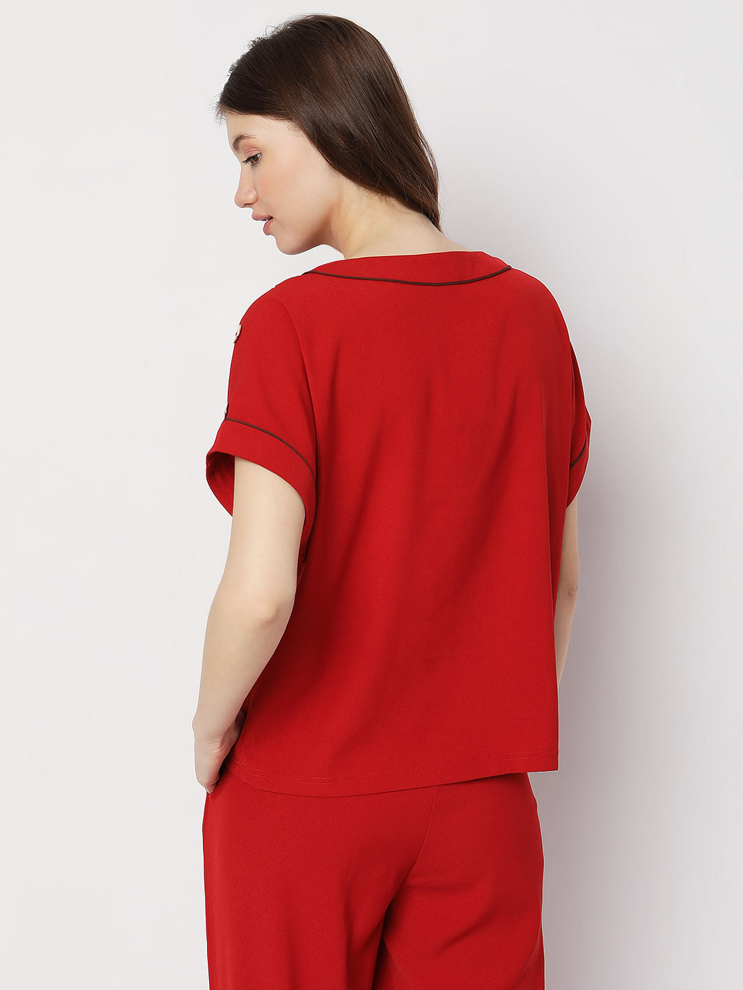 Red knit top with buttons on shoulders and contrast binding and regular length. Part of a co-ord set. Pair with our matching pants and golden heels.