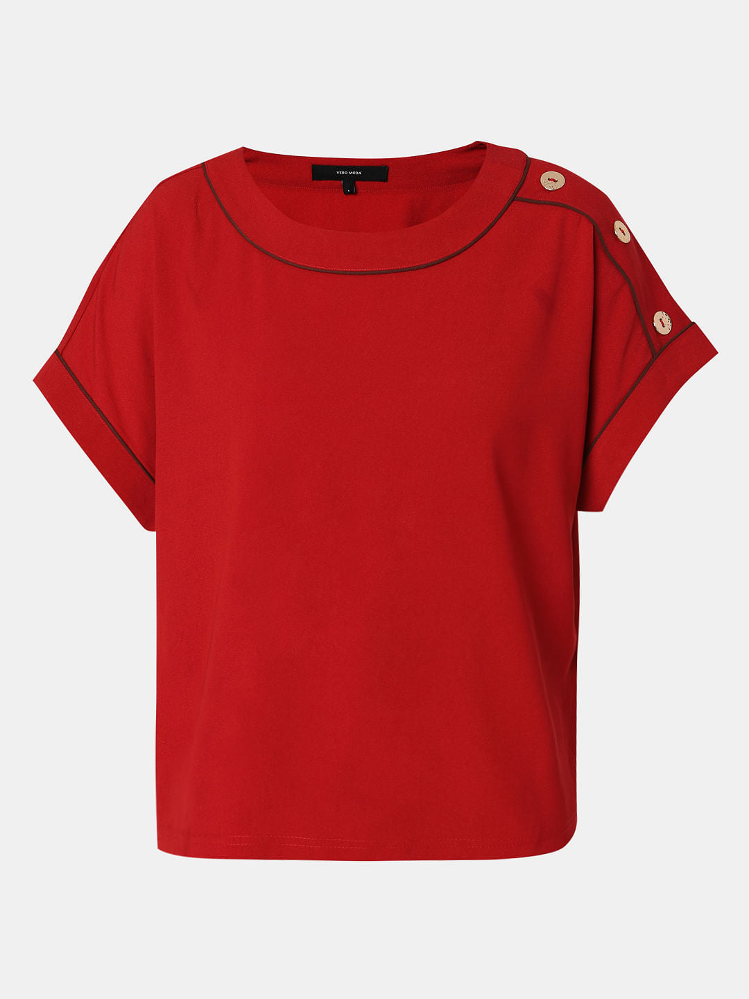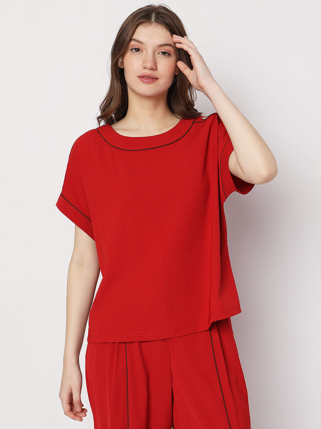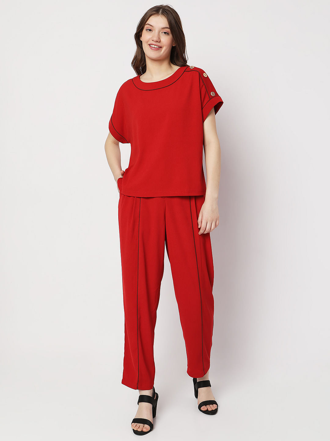 Red knit top with buttons on shoulders and contrast binding and regular length. Part of a co-ord set. Pair with our matching pants and golden heels.