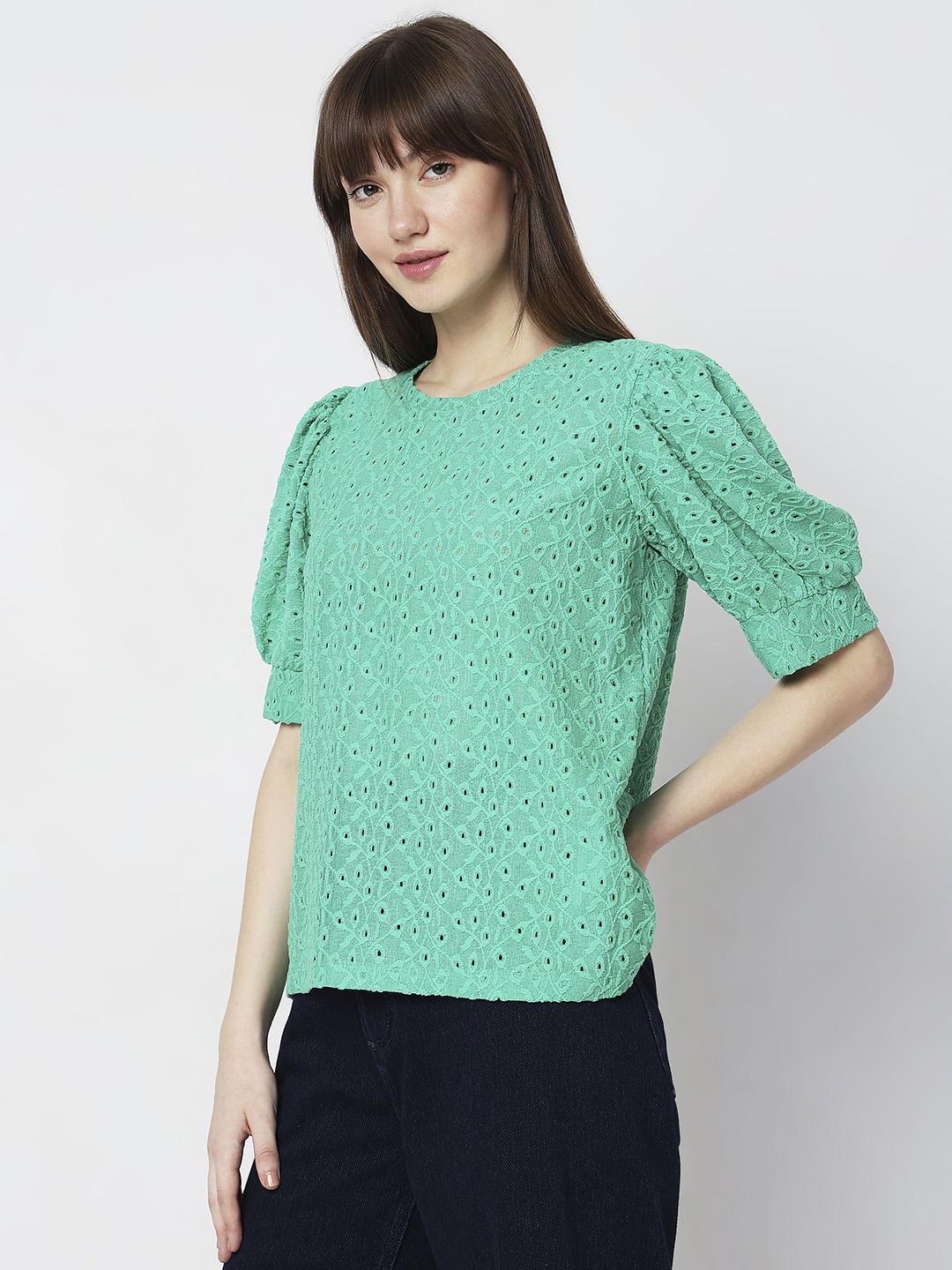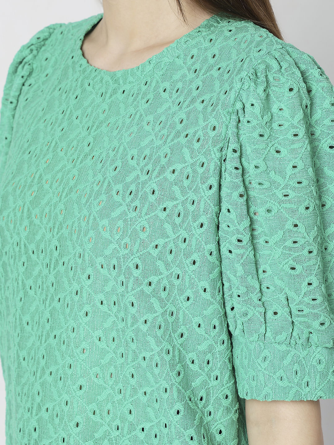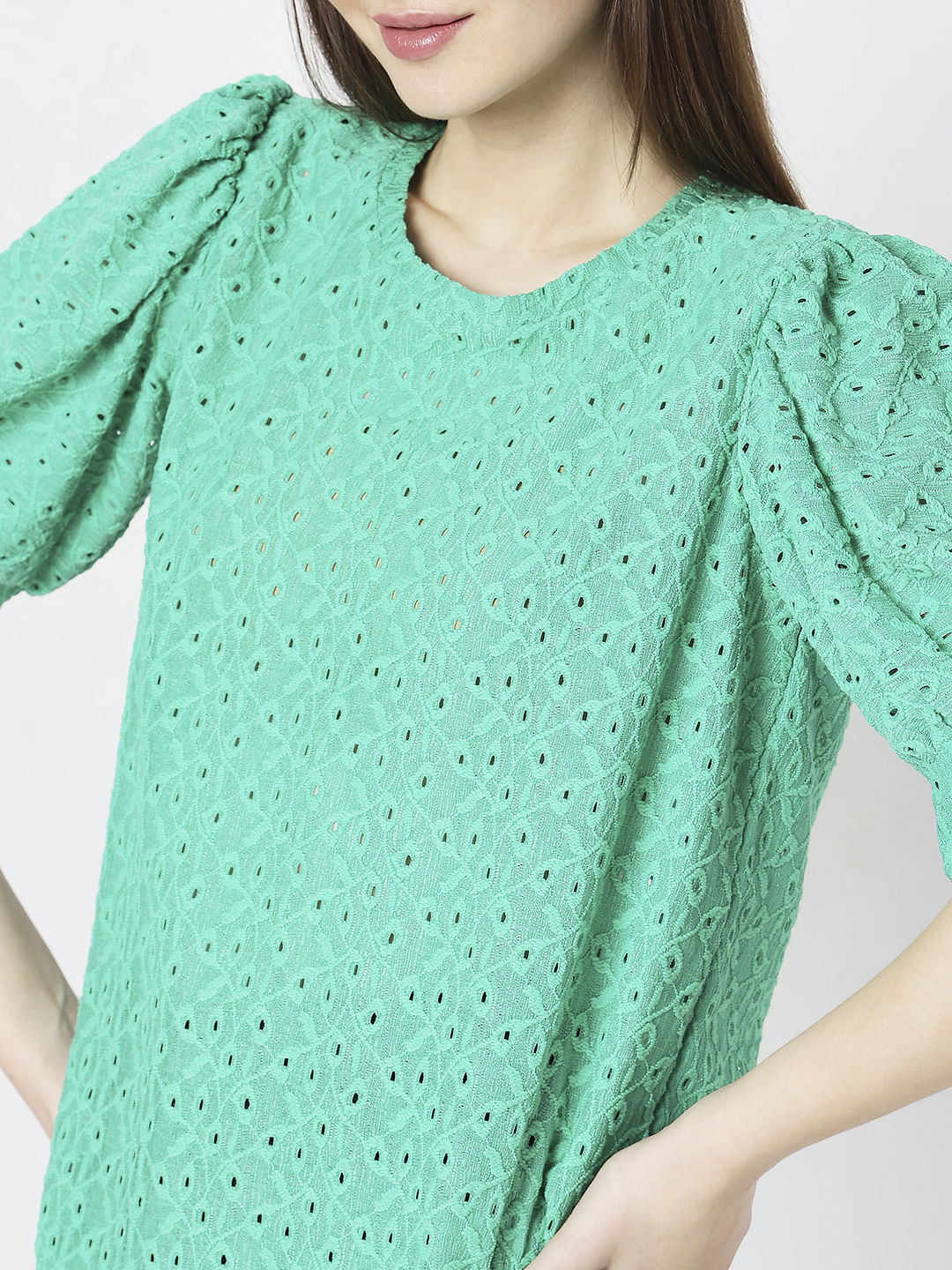 Solid green schiffli top designed with puff sleeves, round neck, and falls at hip. Style with beige trousers or jeans and flats for a laidback yet chic look.