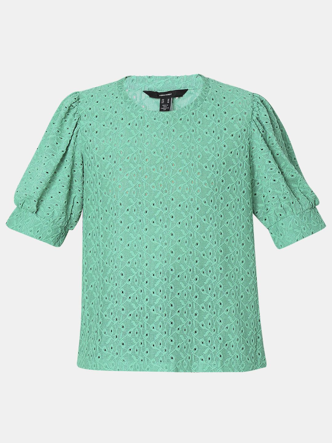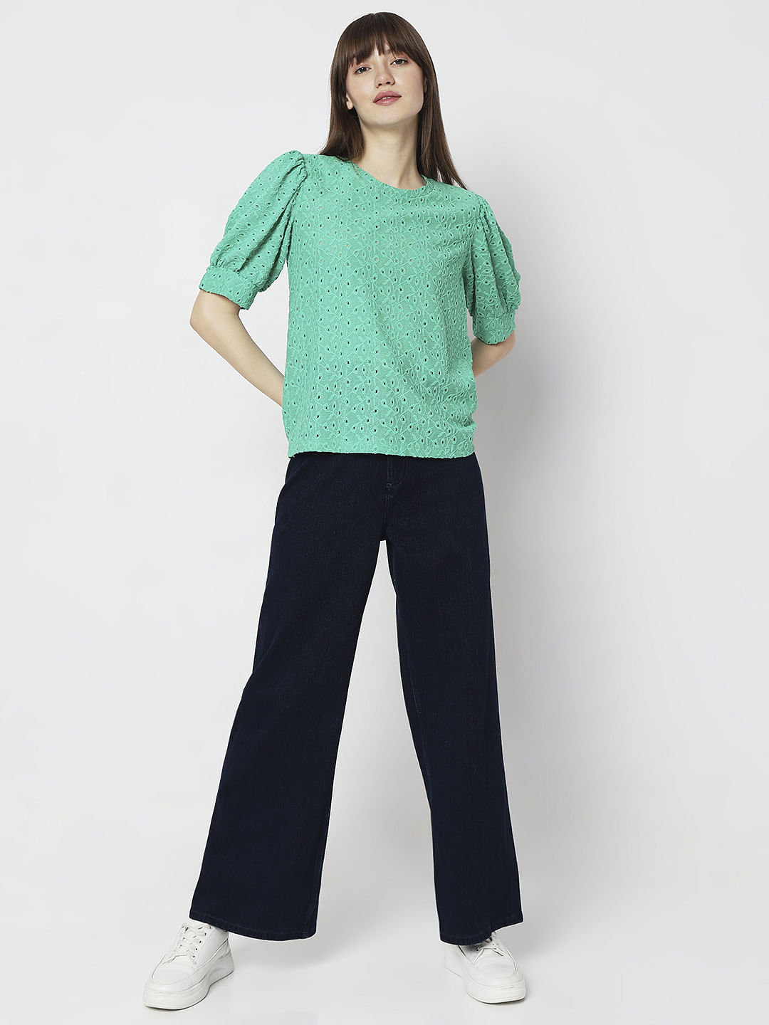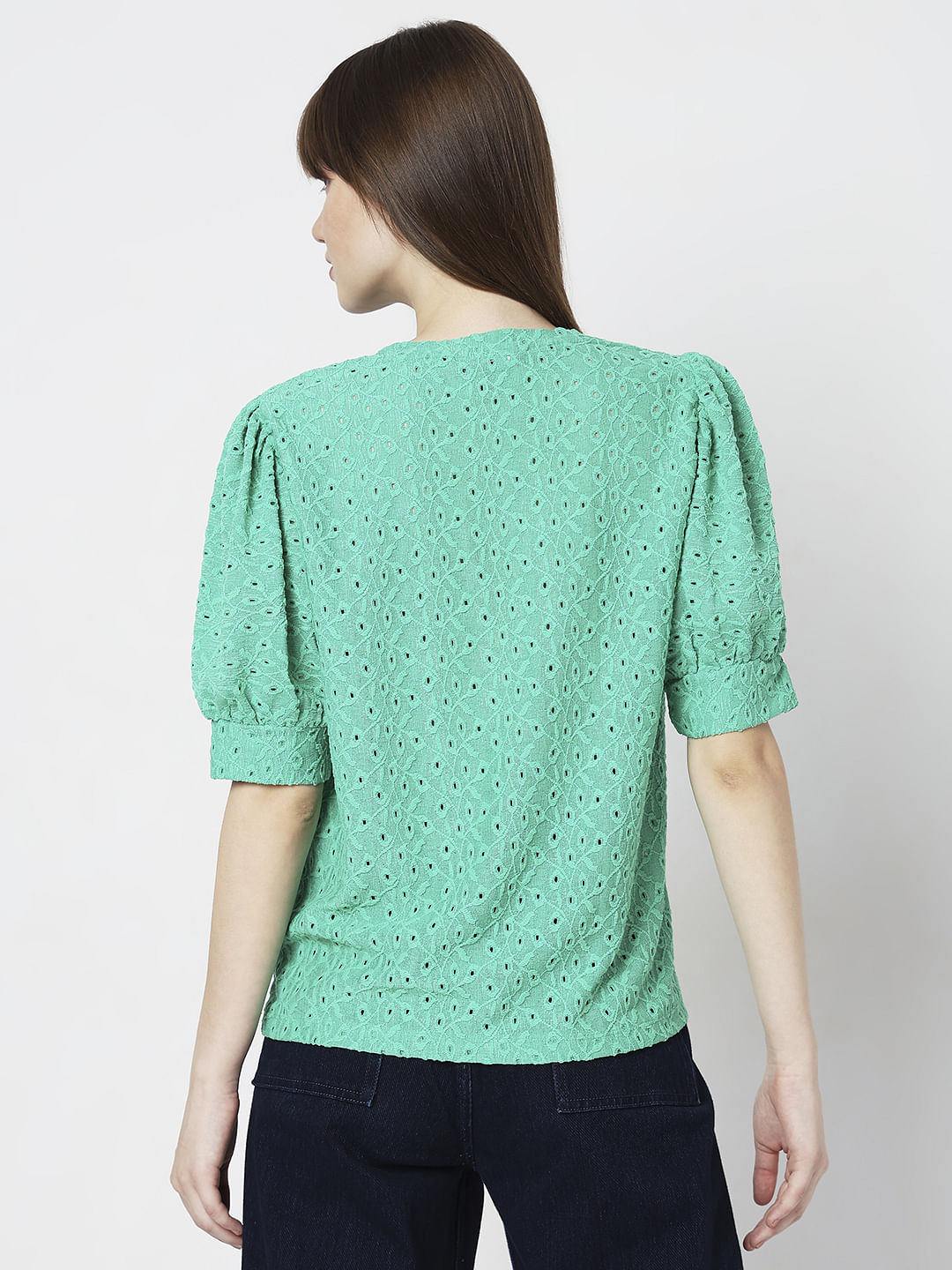 Solid green schiffli top designed with puff sleeves, round neck, and falls at hip. Style with beige trousers or jeans and flats for a laidback yet chic look.