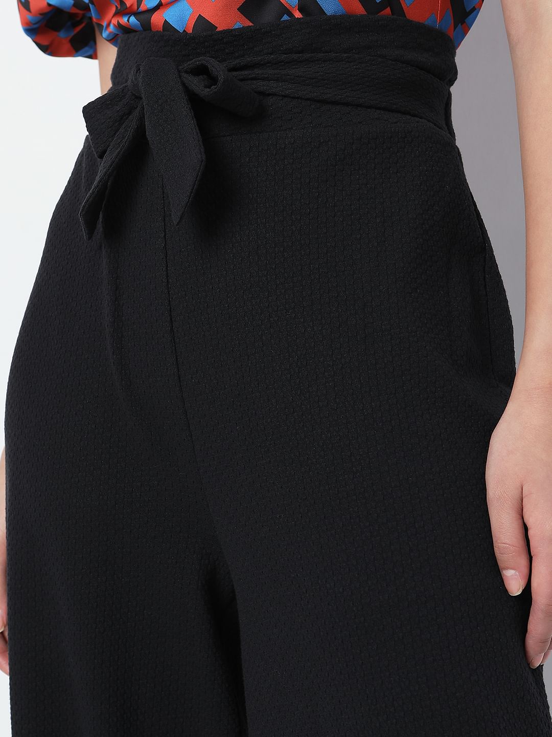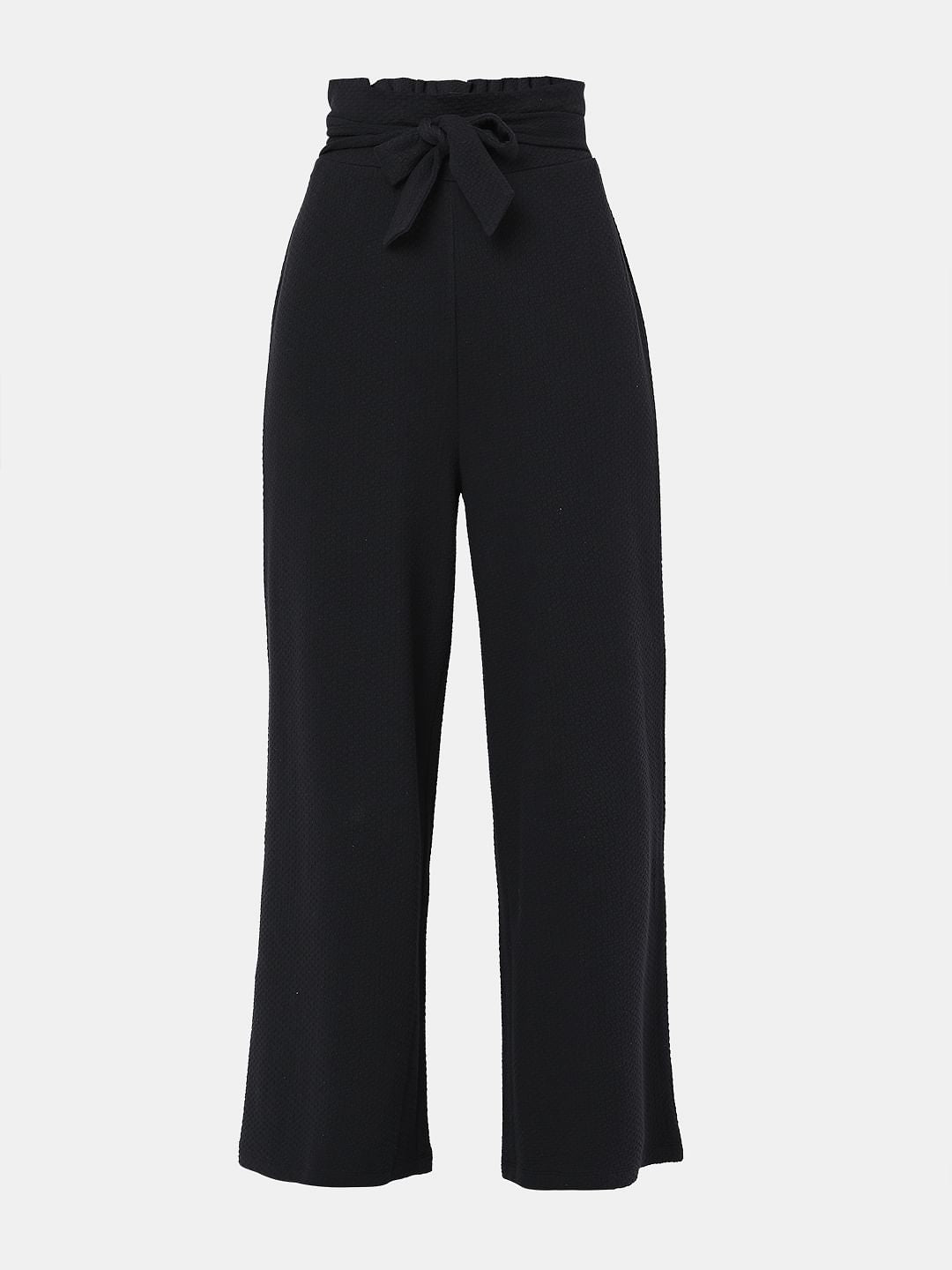 Black solid print high rise wide leg pants with a tie-up waist. Style with a top and heels for a chic dressy look.