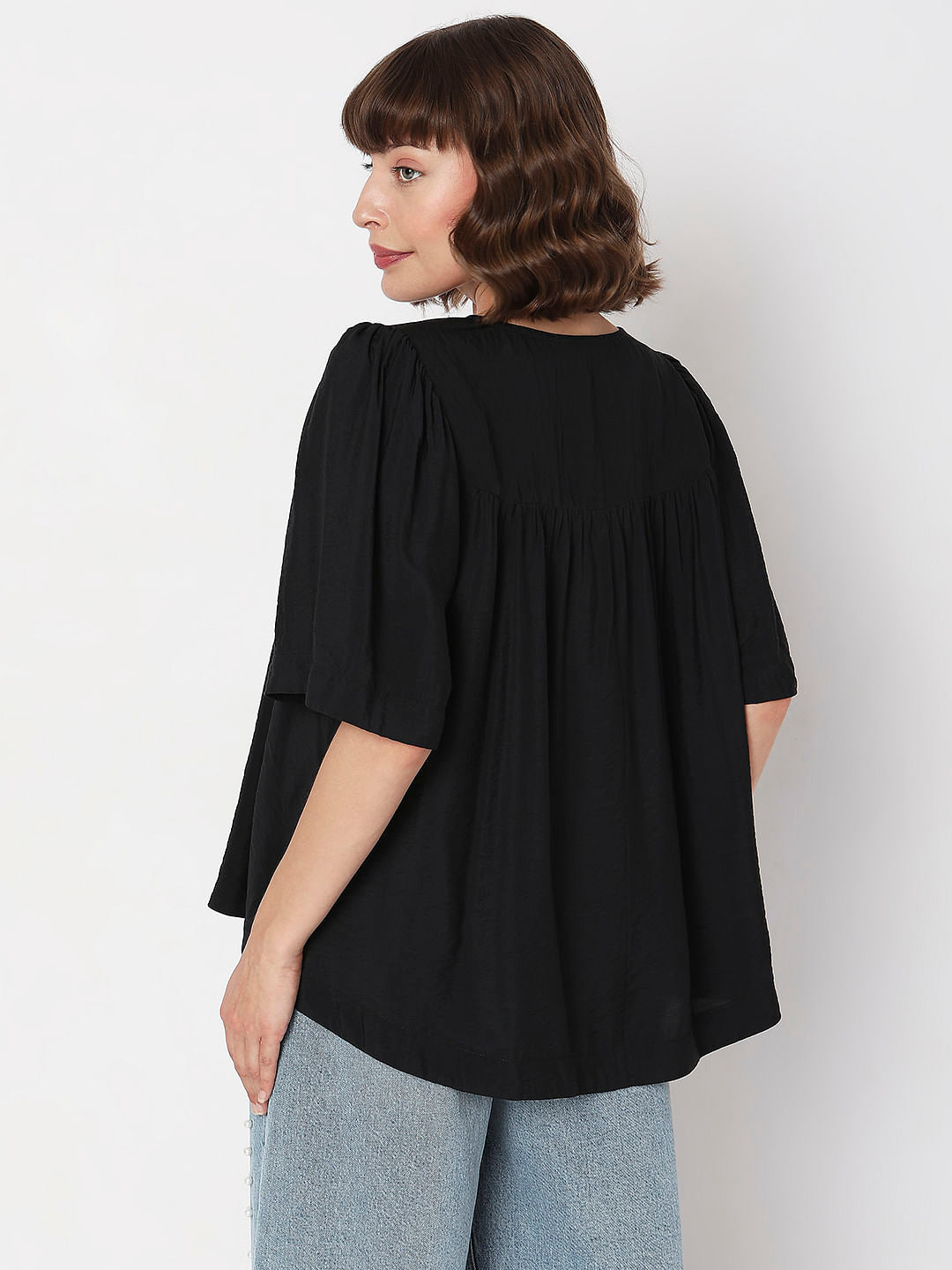 This Vero Moda top is the perfect choice for a stylish and comfortable look. This black, relaxed-fit top has a round neckline with a notch and puffed kimono short sleeves with gathers at the front neckline. The sleeve and bottom hems are folded and stitched wide, while the bottom is high in front and low in back. Style this versatile piece with jeans or shorts for an effortless yet chic everyday look.