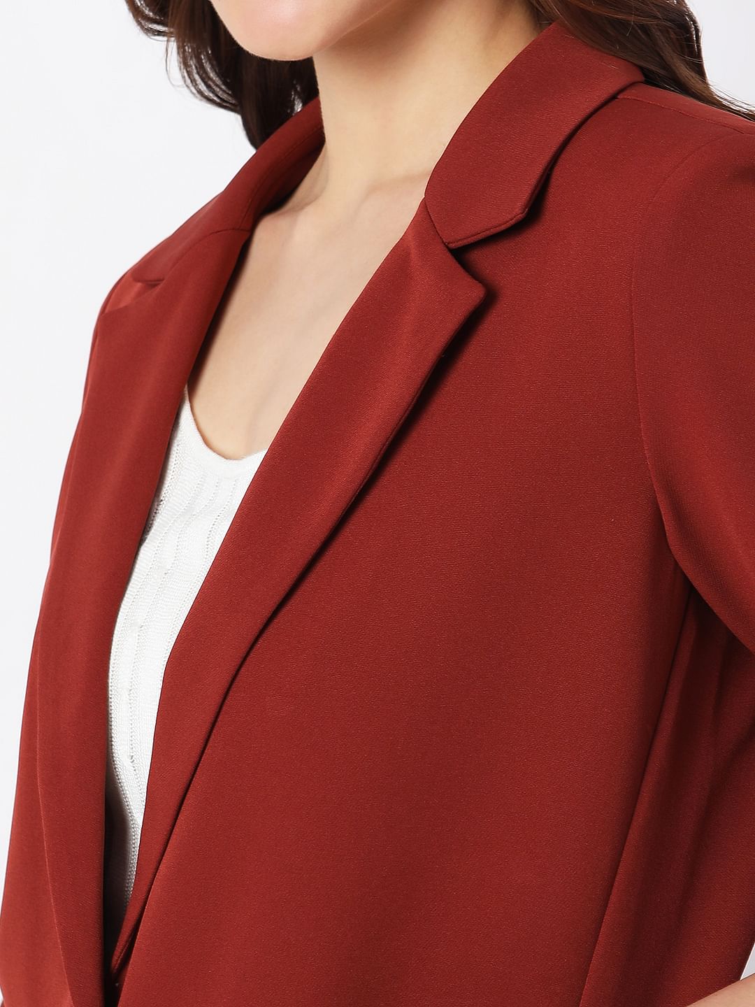 Solid brick red blazer designed with 3/4th sleeve with roll up, single breasted, front pockets, and falls at hips. Pair with matching trousers and layer over a black top.