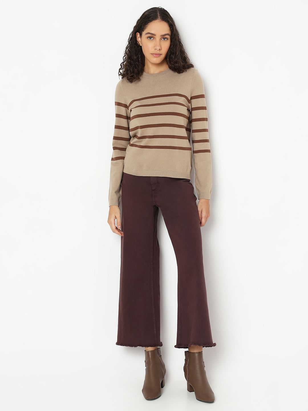 Beige striped flat knit pullover with long sleeves with round neckline and regular length, falls perfectly above hip.