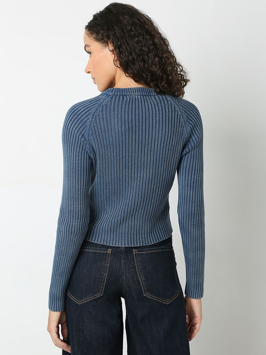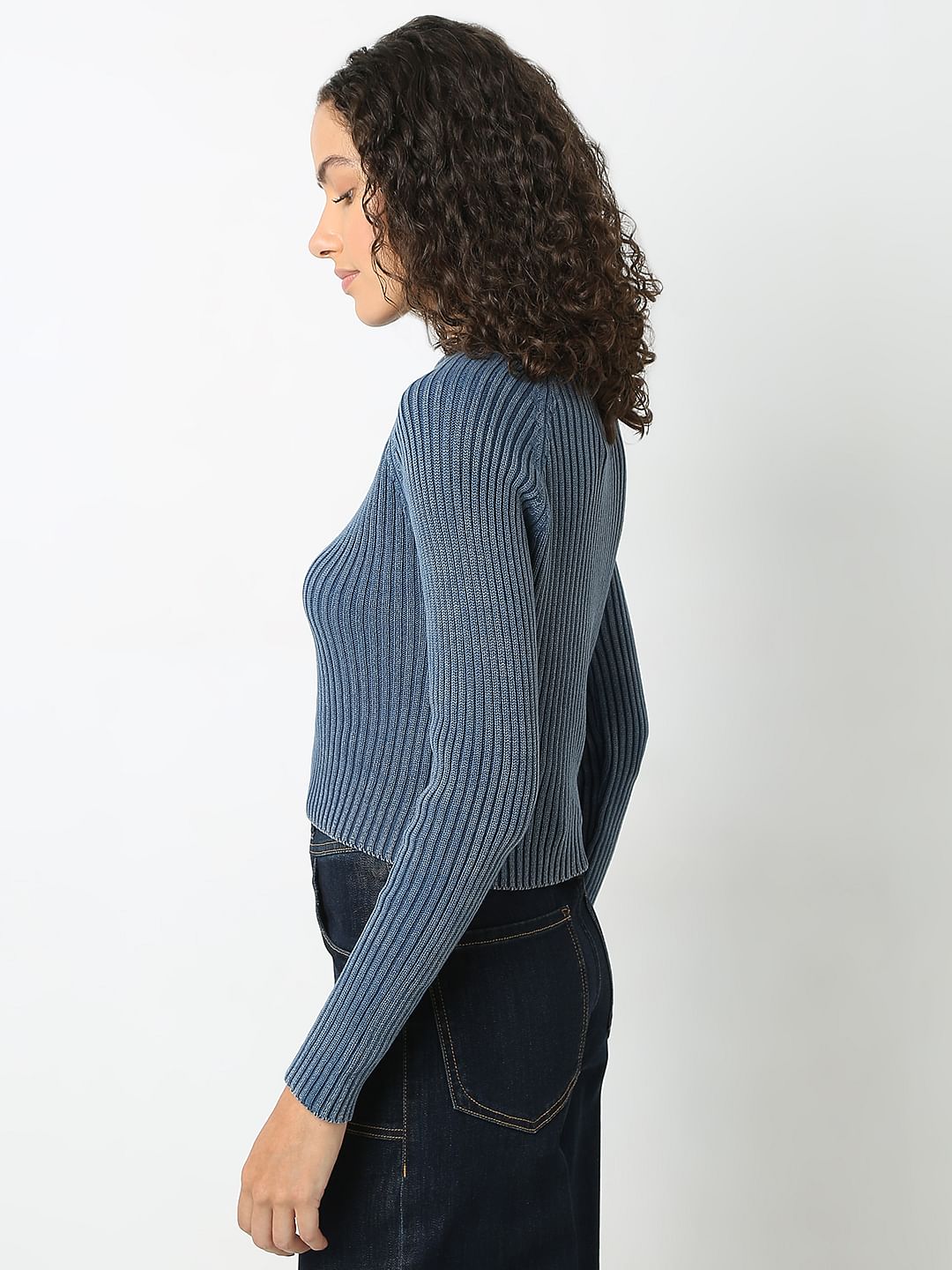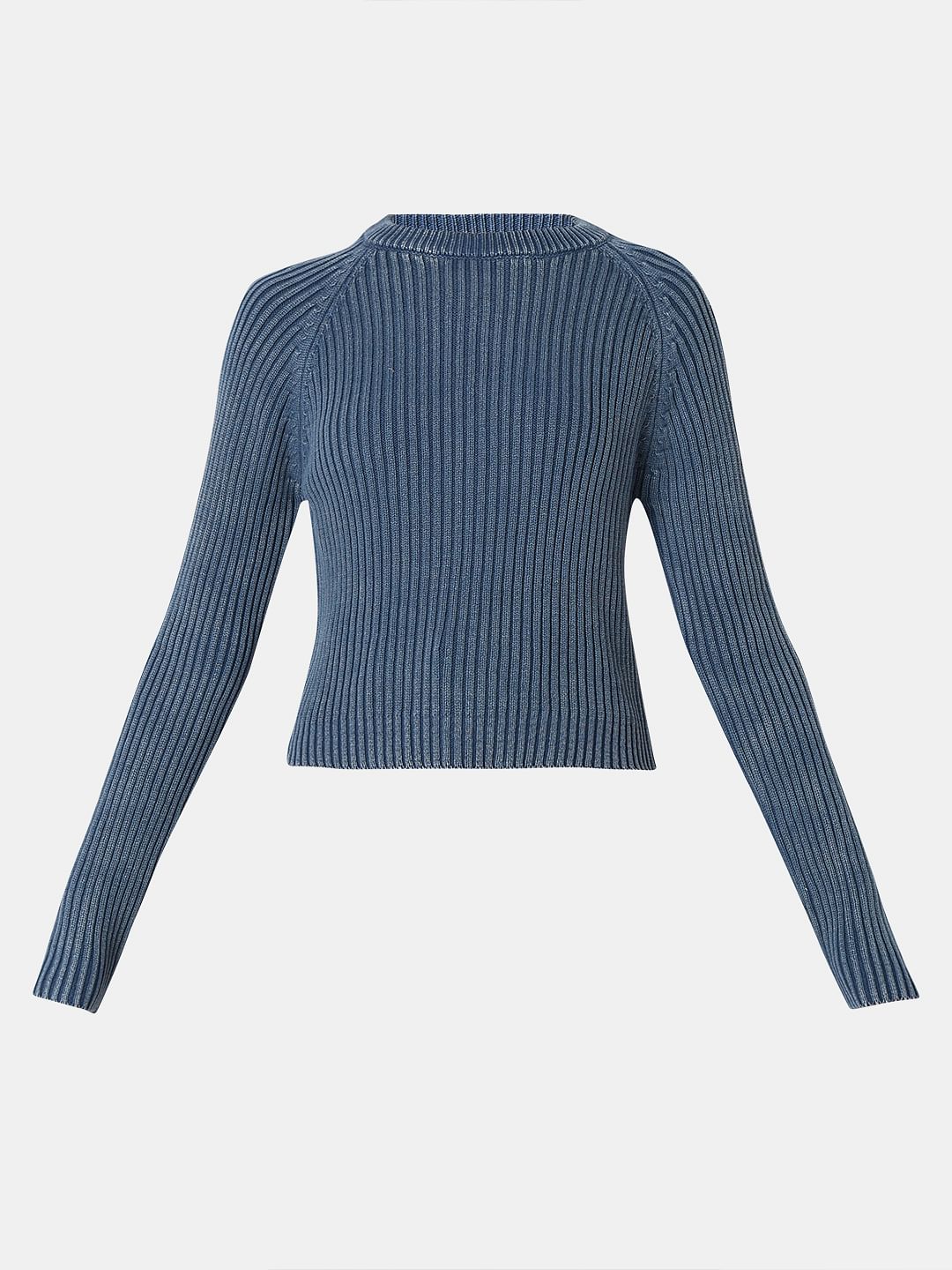 Embrace timeless cosiness with this solid dark blue long-sleeve pullover. Featuring a classic round neck and rib-knit detailing, it offers a comfortable and flattering regular fit that falls gracefully at the hips. The absence of closures ensures a smooth, seamless silhouette, making it a versatile addition to your wardrobe. Perfect for any occasion, this pullover effortlessly combines sophistication and ease.
