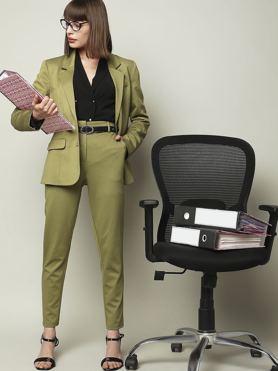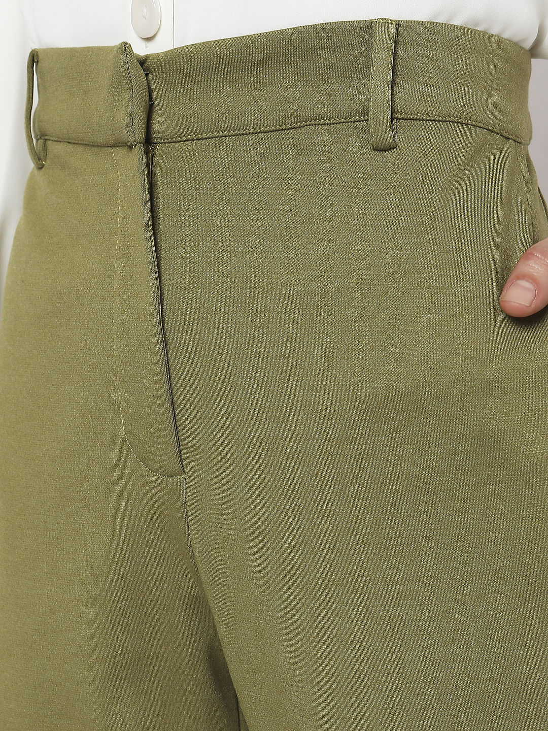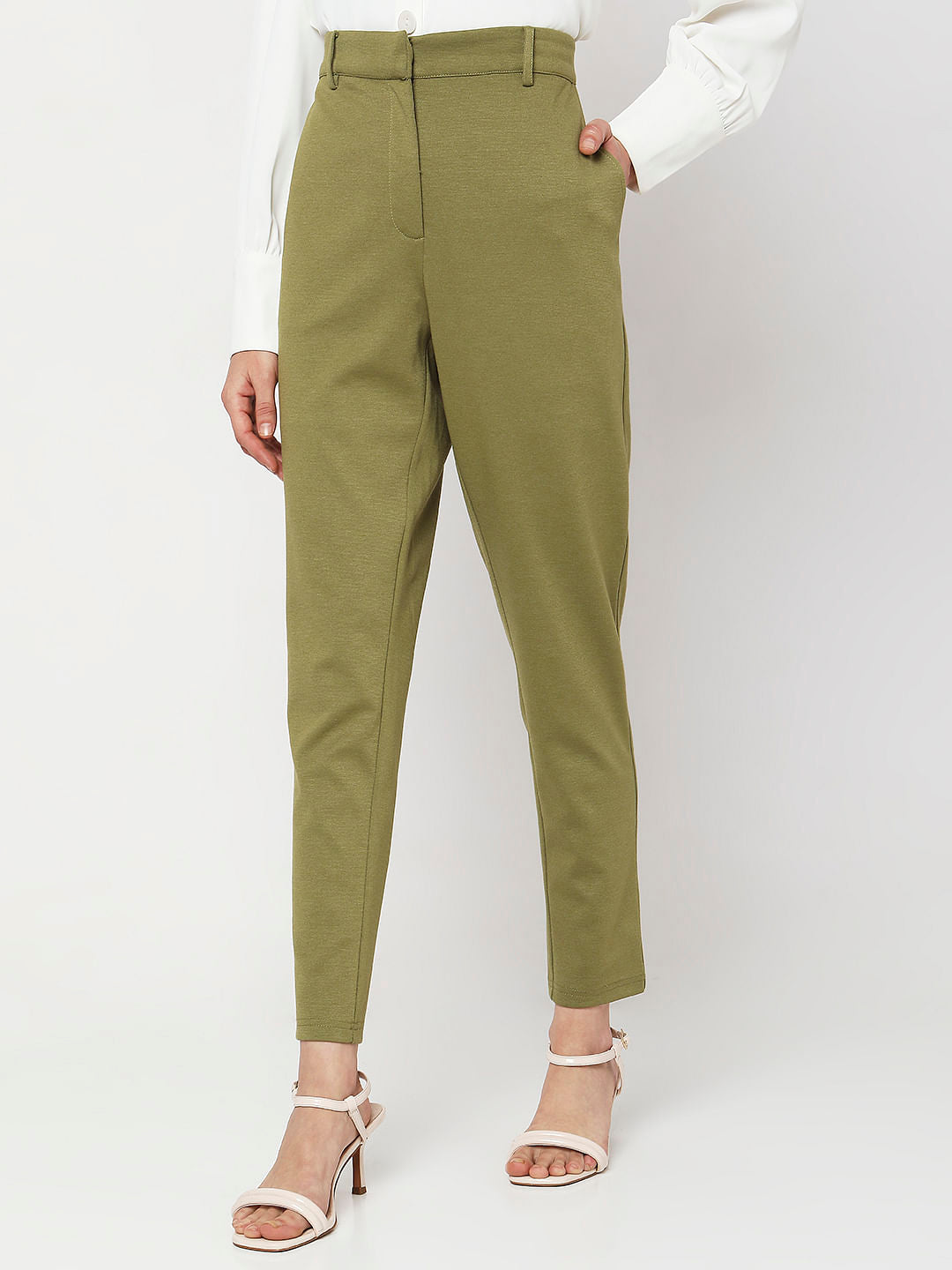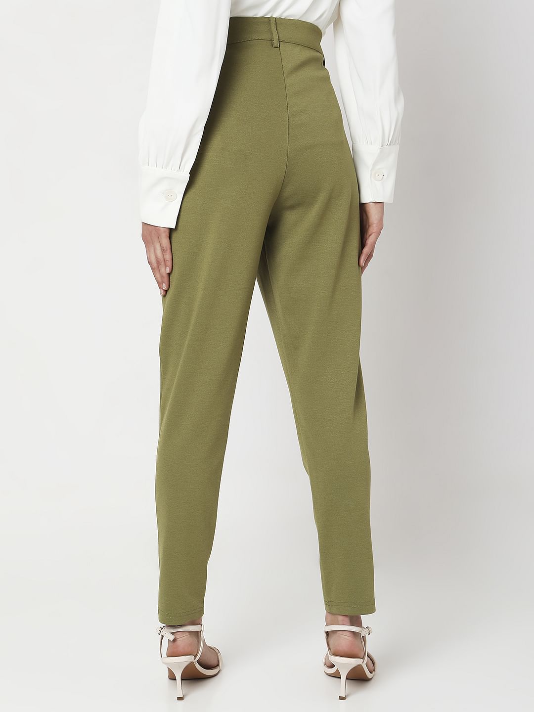 Ankle length solid skinny fit pants in a olive green hue. Can be paired with our matching olive green blazer and a black singlet along with heels for a boss-babe look.