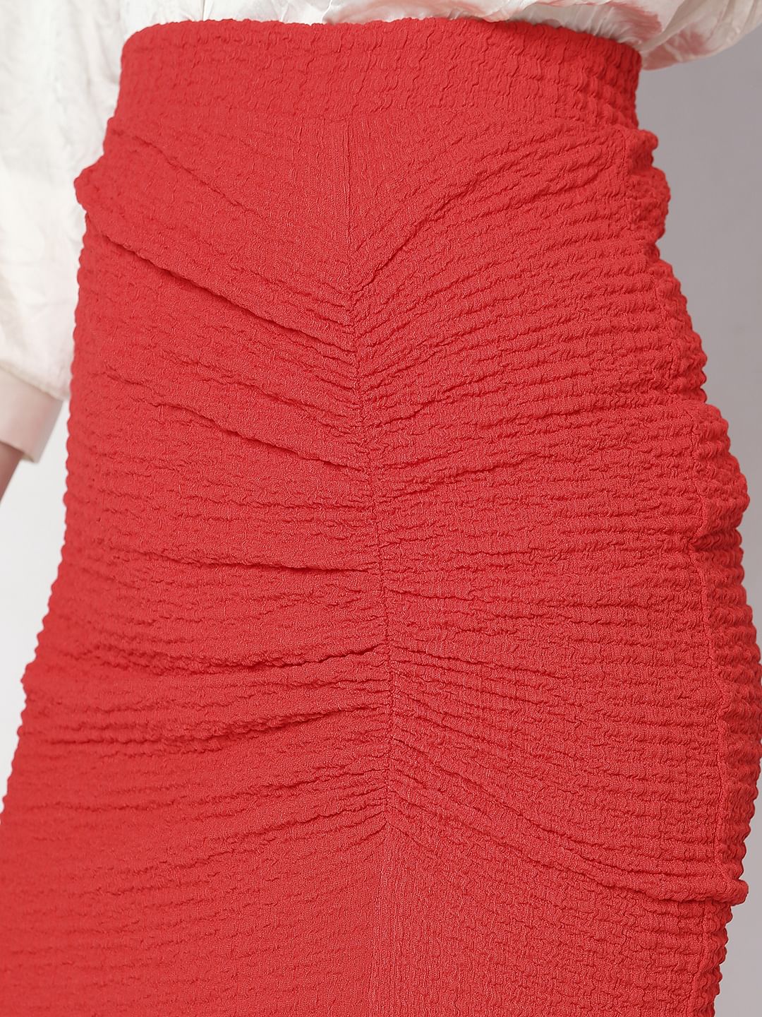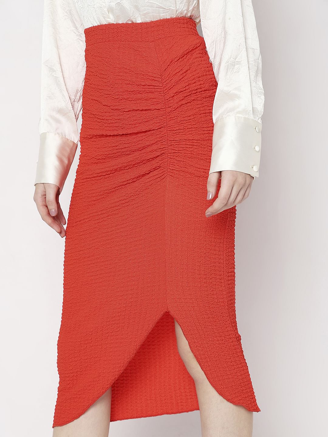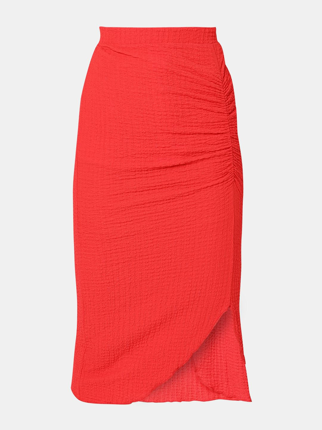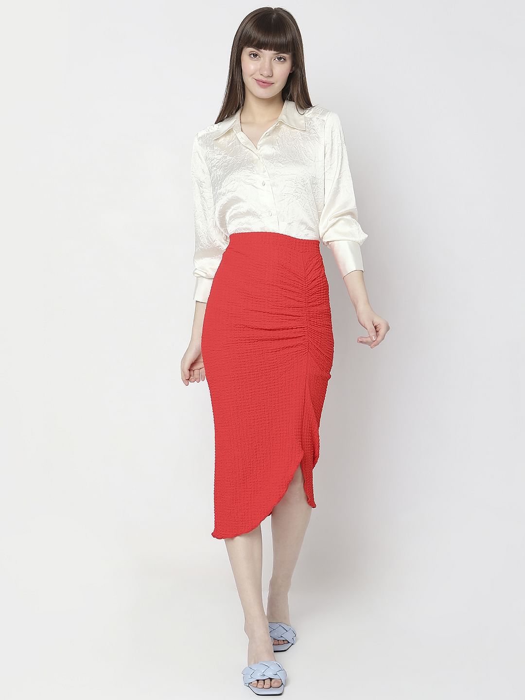 This Vero Moda skirt is the perfect way to add a bold splash of colour to any outfit. Crafted from textured fabric in a solid coral red hue, this high-waisted pencil skirt features a regular elastic waistband and ruching on the left front. The asymmetrical skirt hemline falls above and below the knee for an interesting finish. Style this eye-catching piece with a tucked-in blouse and strappy sandals for an effortless day look.
