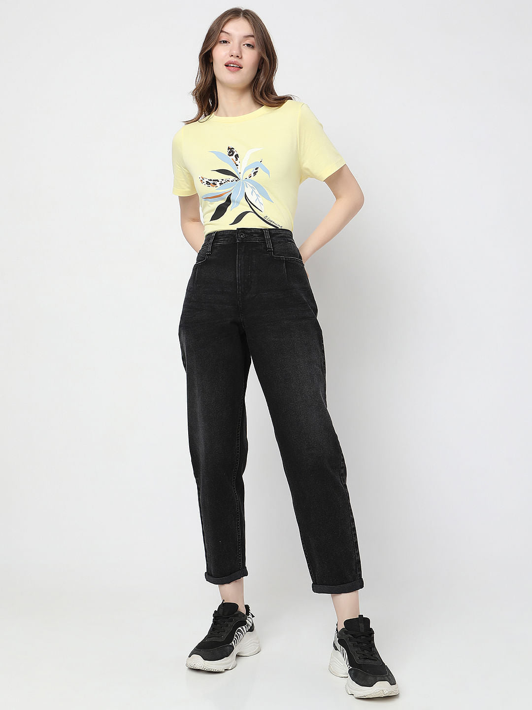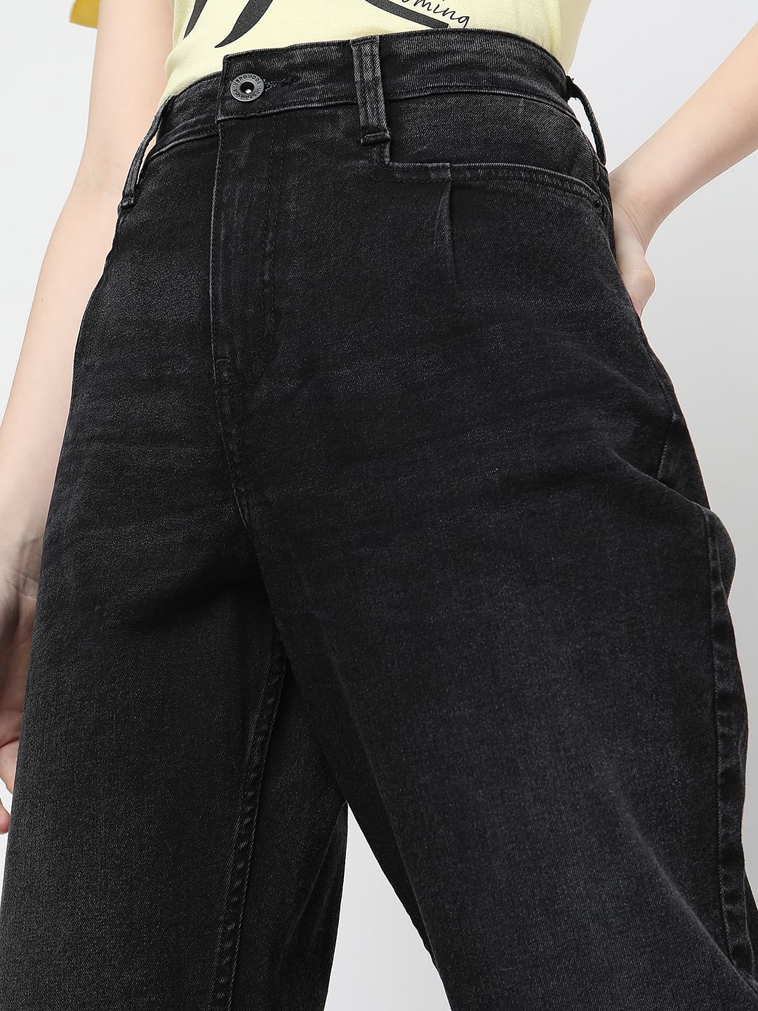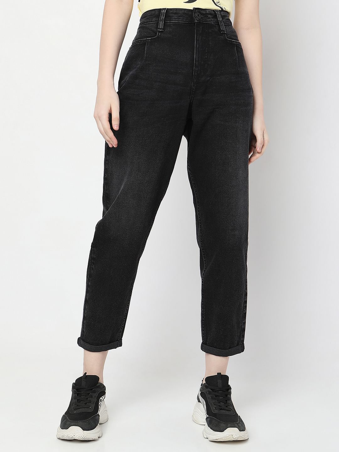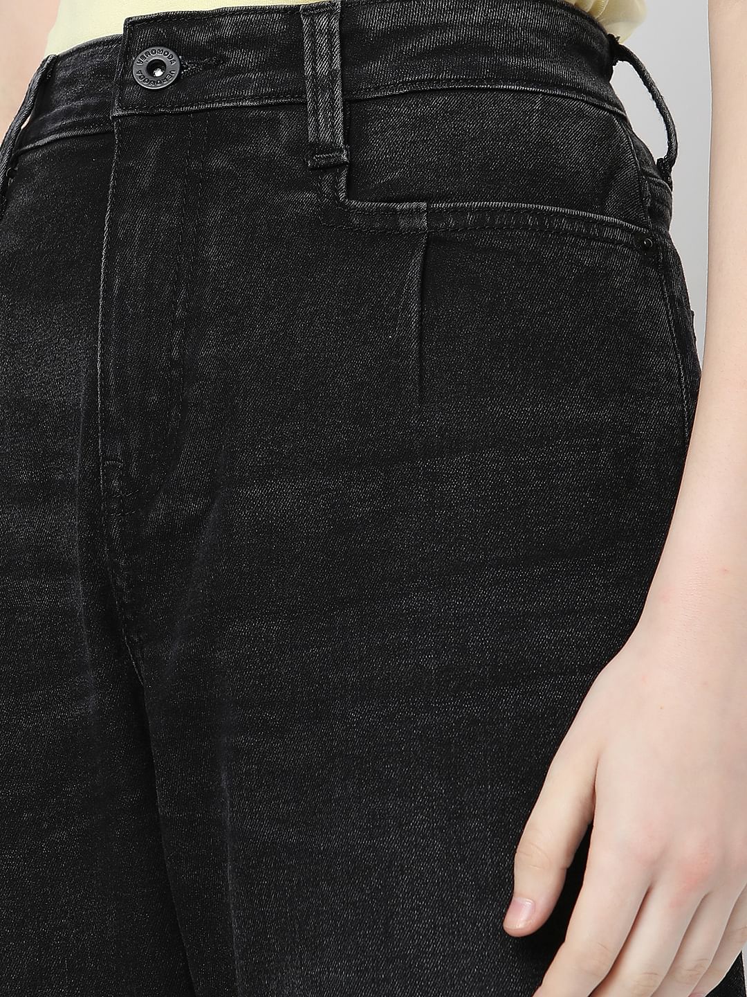 Black girlfriend fit jeans with high waist, side and back pockets with ankle length, and a washed effect.