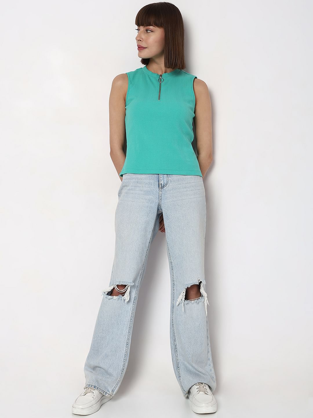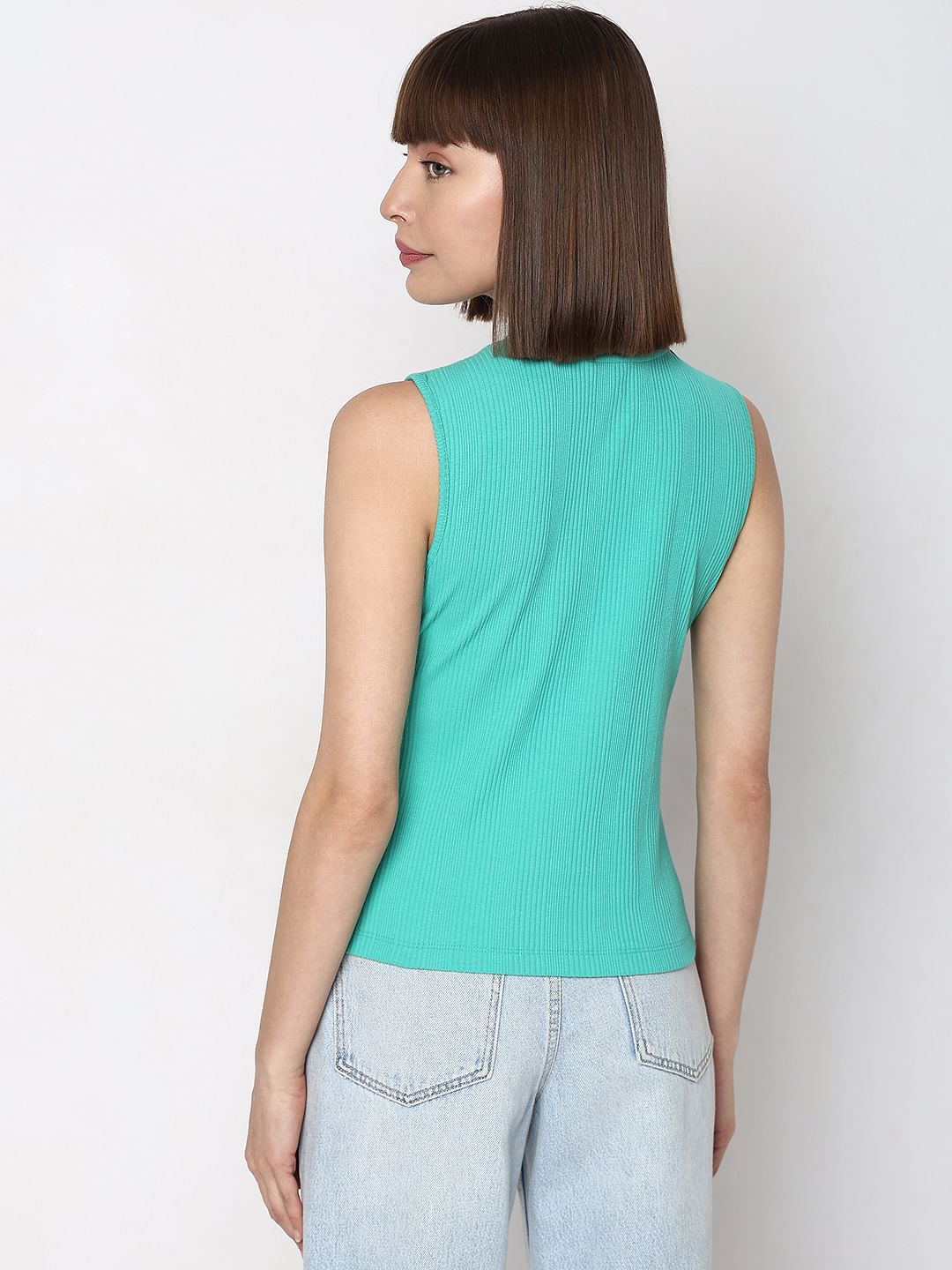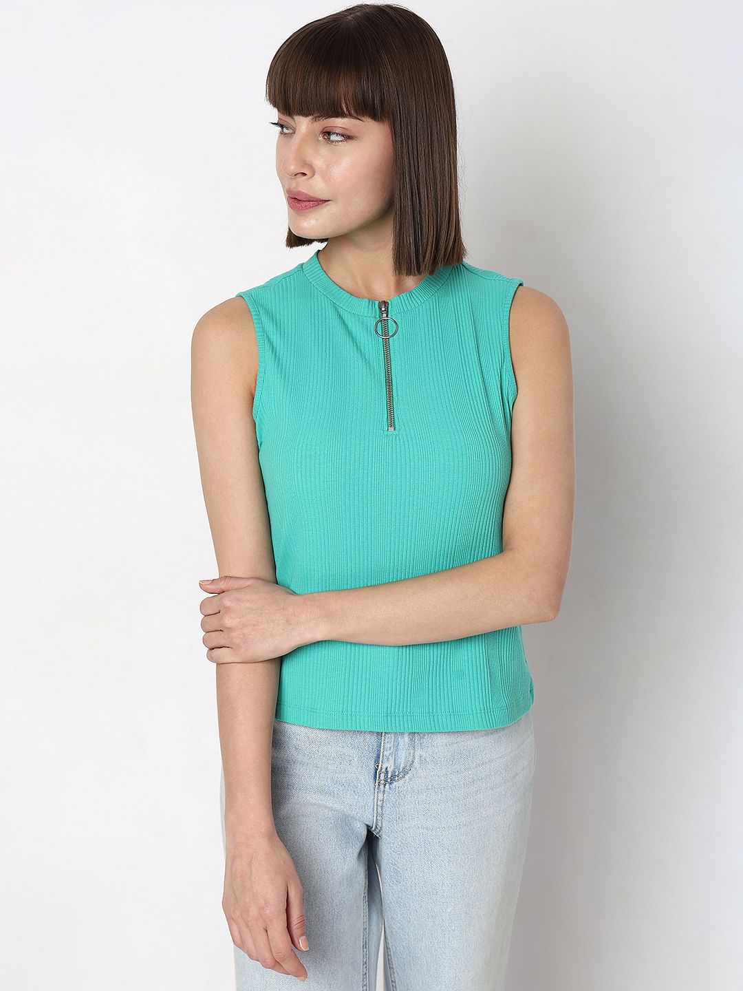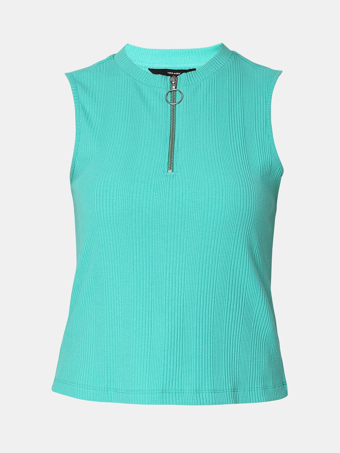 Green knit sleeveless top with front zipper detail. Cut in a regular fit and fall on hips. Style with leggings, jeans or shorts!