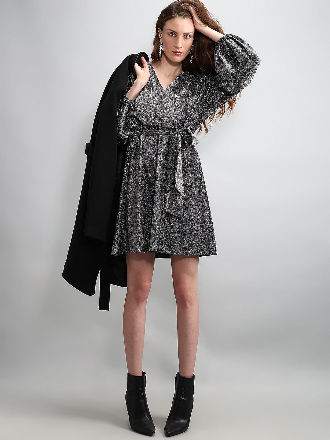 This dress from VERO MODA is a timeless classic. The solid black lurex fabric catches the light beautifully, and the front wrap silhouette and extended sleeve makes for a stunning look. The waist tie-up and v neckline gives you a flattering shape, while the length of the dress falls just above your knee. Style this piece with a pair of sleek ankle boots, some statement earrings, and an oversized blazer for an effortless evening look.