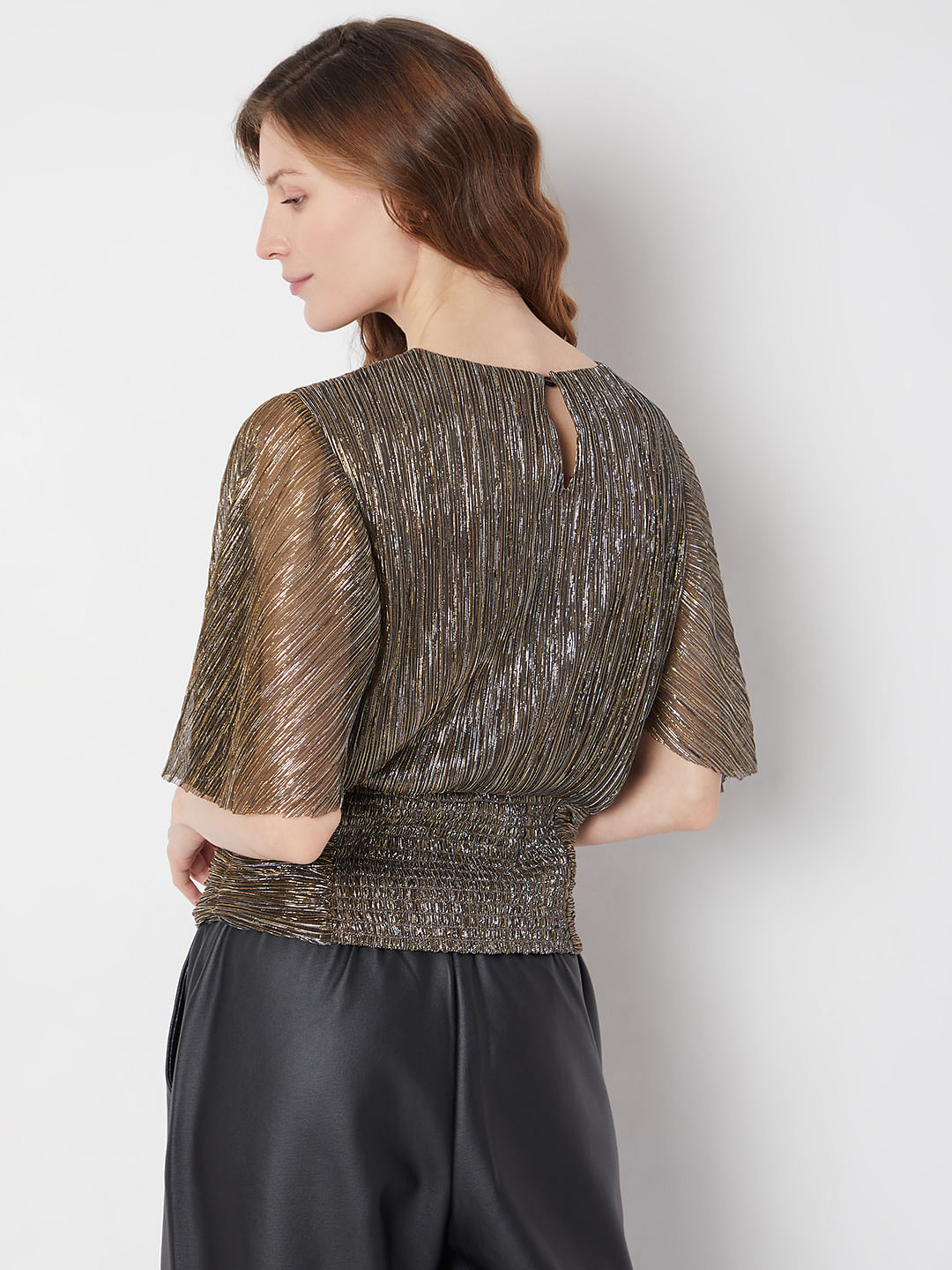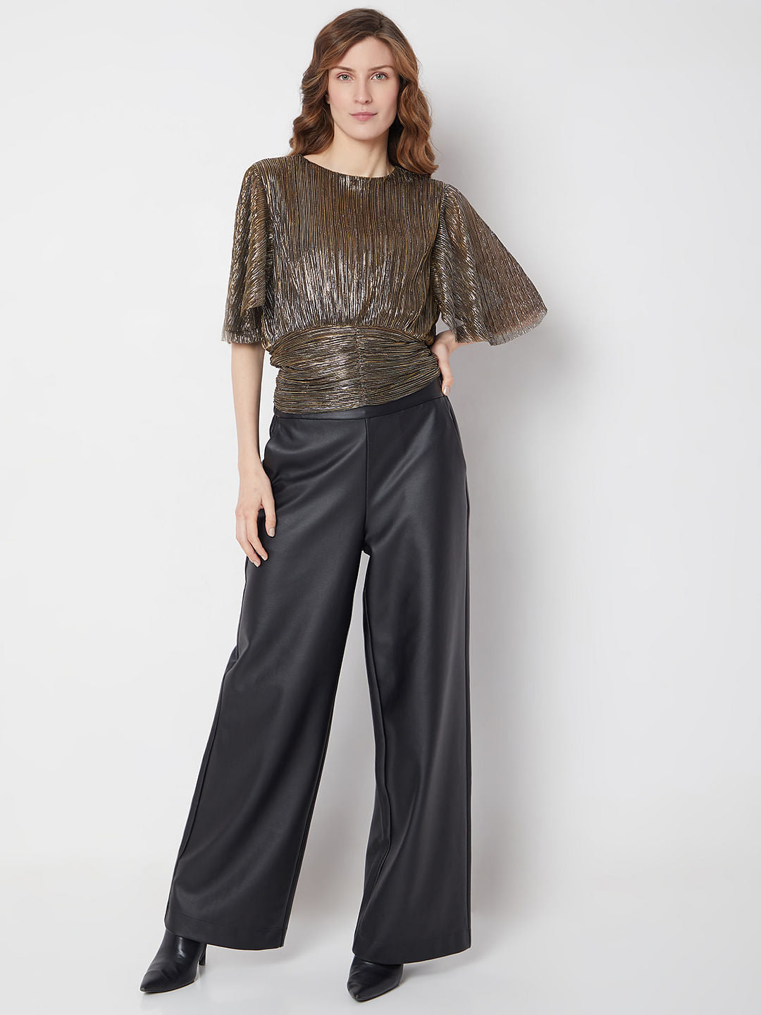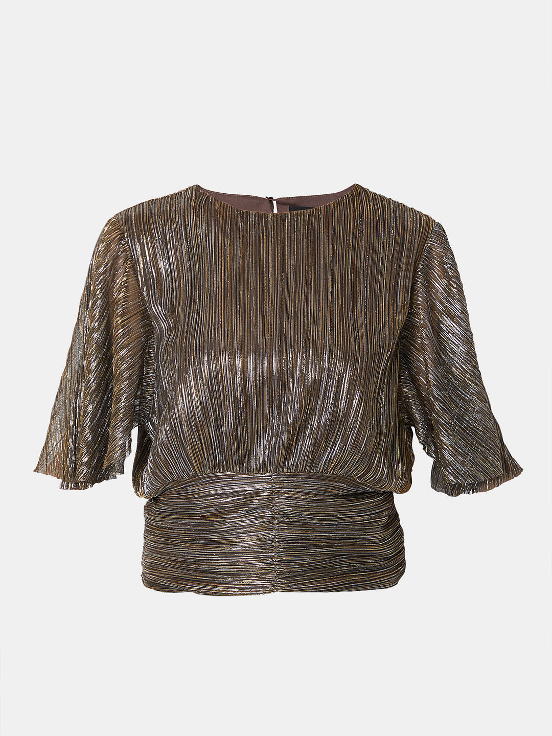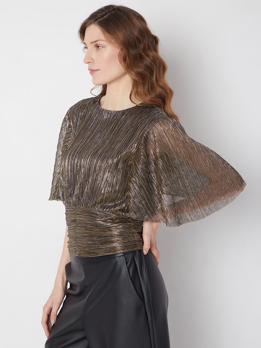 This stunning Vero Moda top is a must-have for your wardrobe. Crafted from a luxurious metallic brown lurex fabric, it features stylish ruching at the waist and half length flared sleeves. The length of the top falls at the waist, creating a flattering silhouette. Style with black solid flared pants for an on-trend look that will take you from day to night.