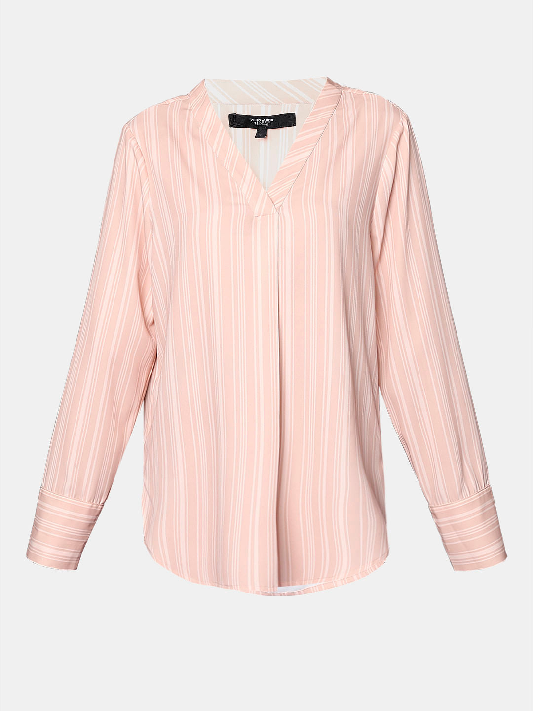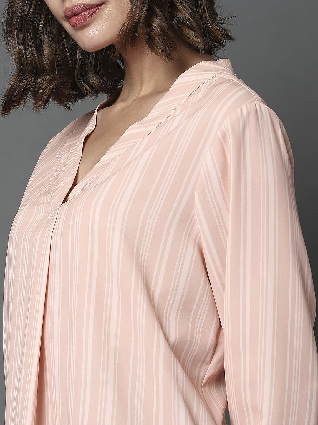 Pink striped V-neck top designed with a single pleat, full sleeves, wide cuff, curved hem, and has a length that falls at hips. Perfect to style with trousers and heels for a chic 9 to 5.