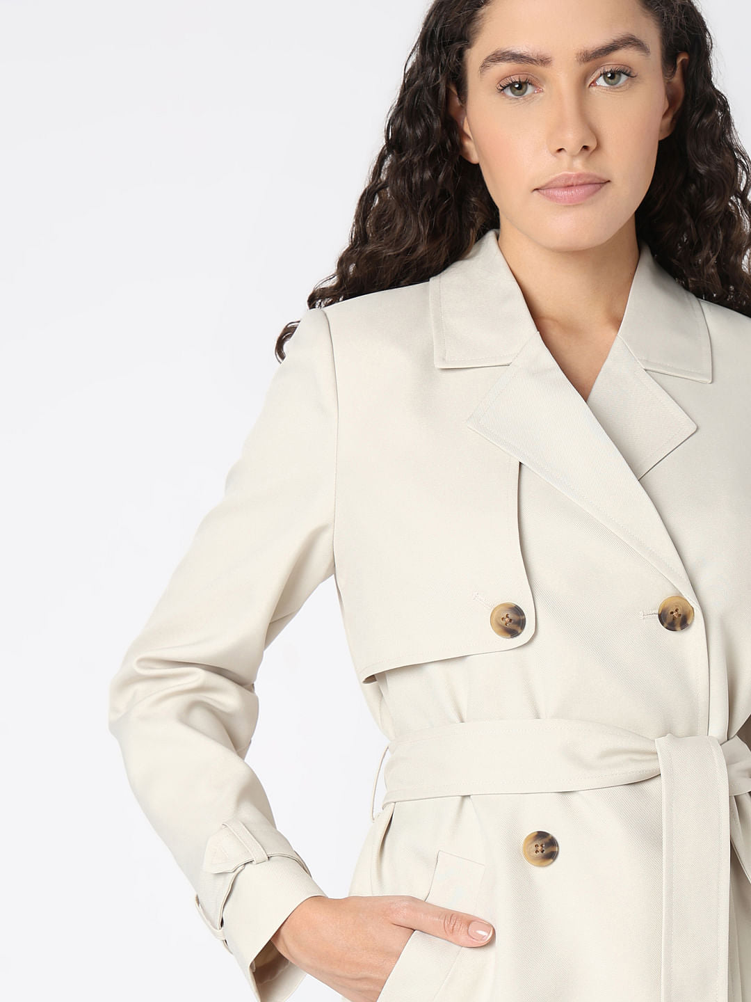 Wrap yourself in timeless elegance with this beige trench coat. Featuring a notched lapel collar and flap button details on the chest, this classic piece offers a refined touch to any look. It has a button closure at the front, cinched with a fabric belt to accentuate the waist. With long sleeves and two front pockets, it combines practicality with style. Falling at mid-thigh length, this regular-fit trench is the perfect finishing layer for a polished appearance.