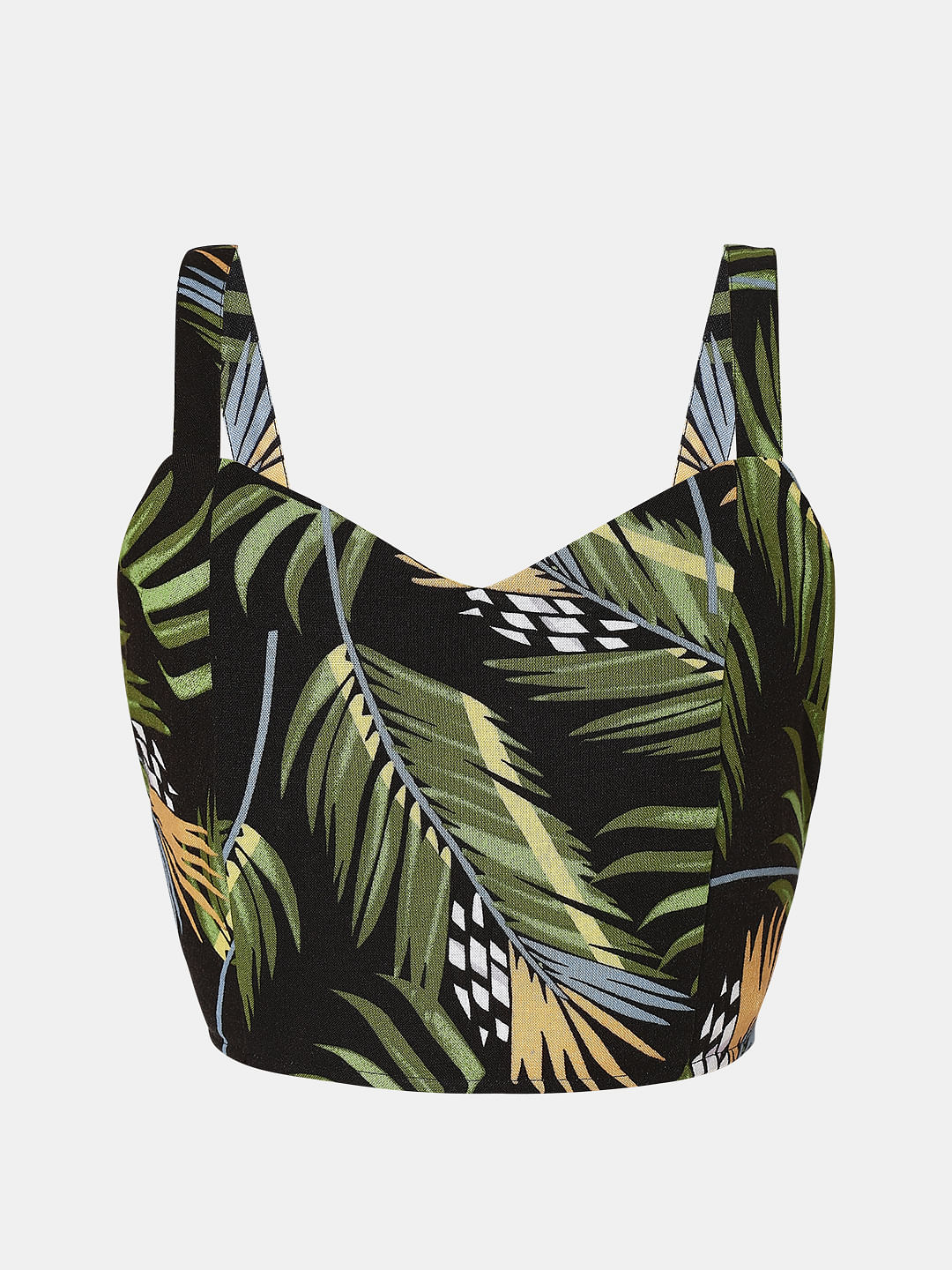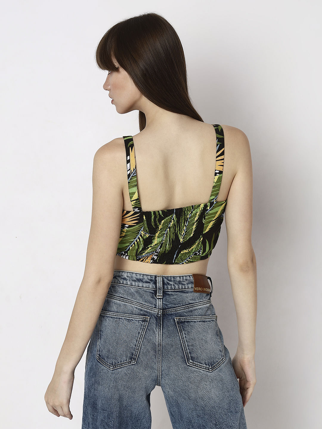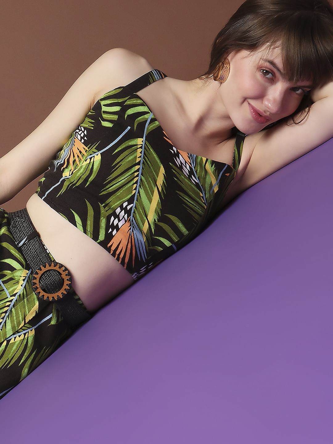 Tropical print crop top in a sleeveless styles. Has thick shoulder straps and a smocked back. Style with high-rise pants and sneakers or heels for a perfect off-duty look.