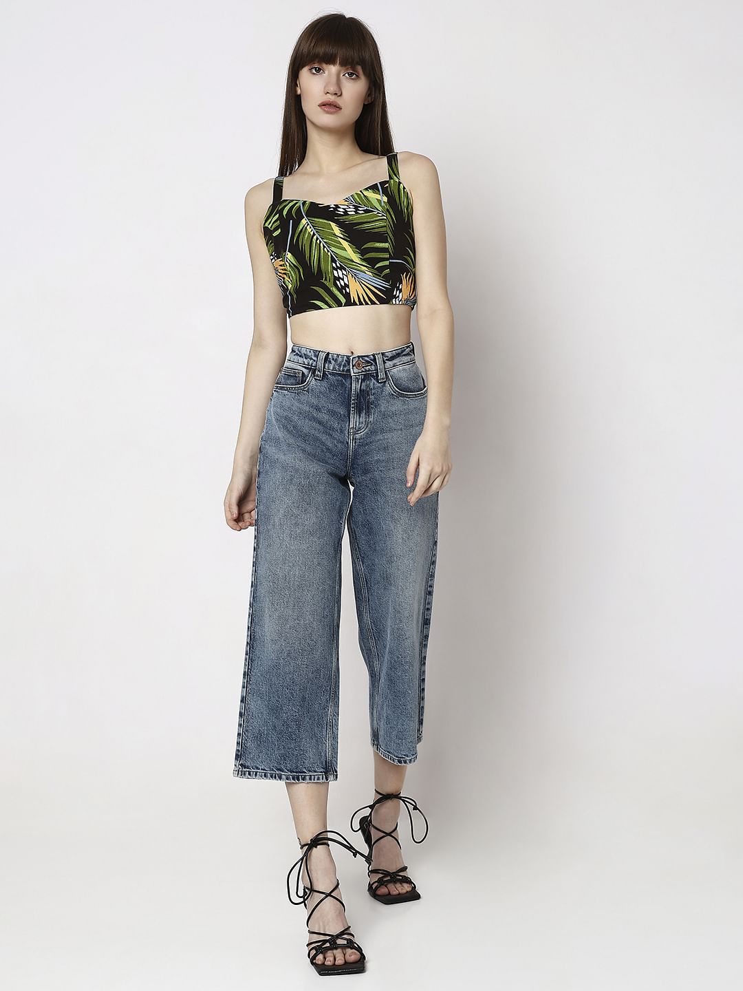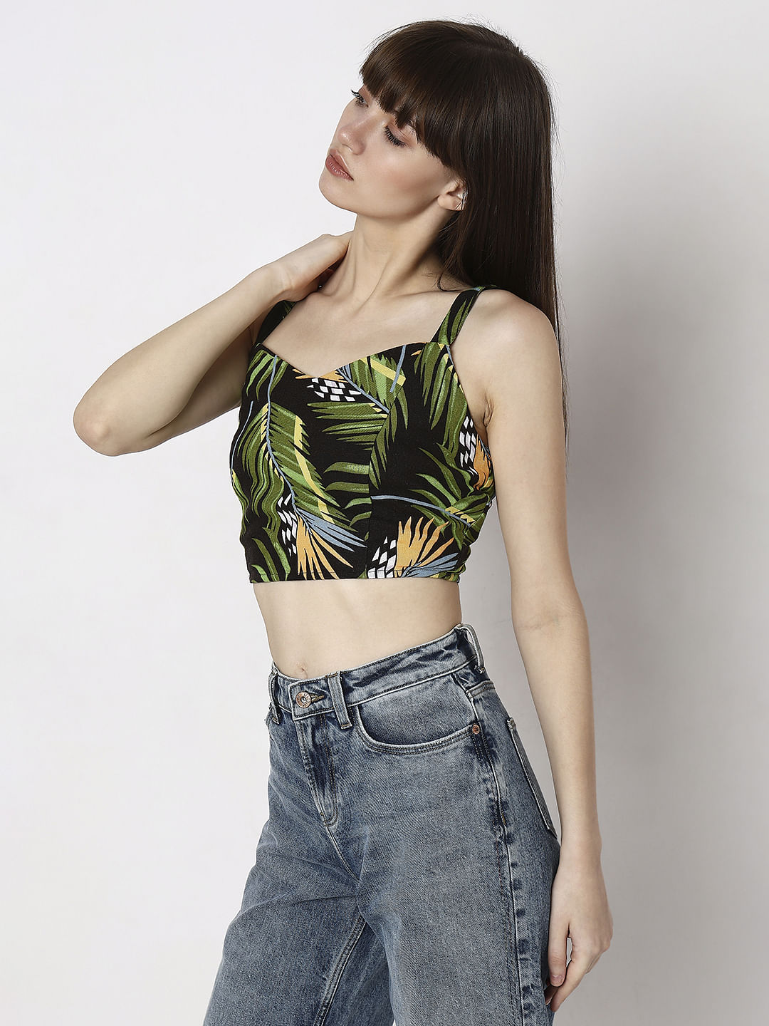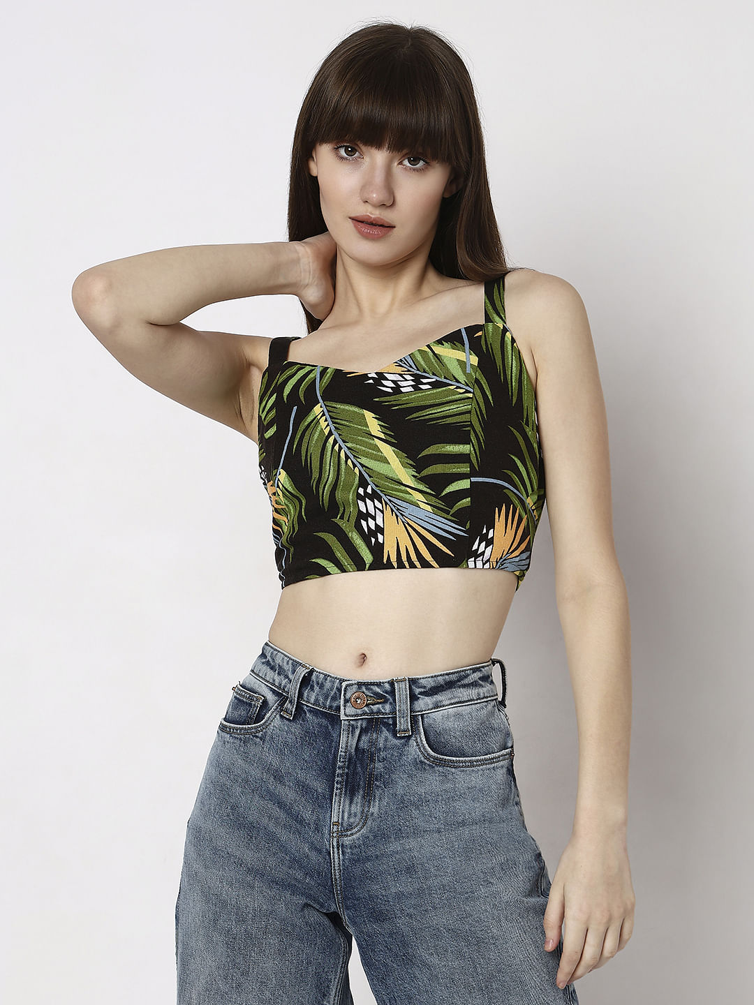 Tropical print crop top in a sleeveless styles. Has thick shoulder straps and a smocked back. Style with high-rise pants and sneakers or heels for a perfect off-duty look.