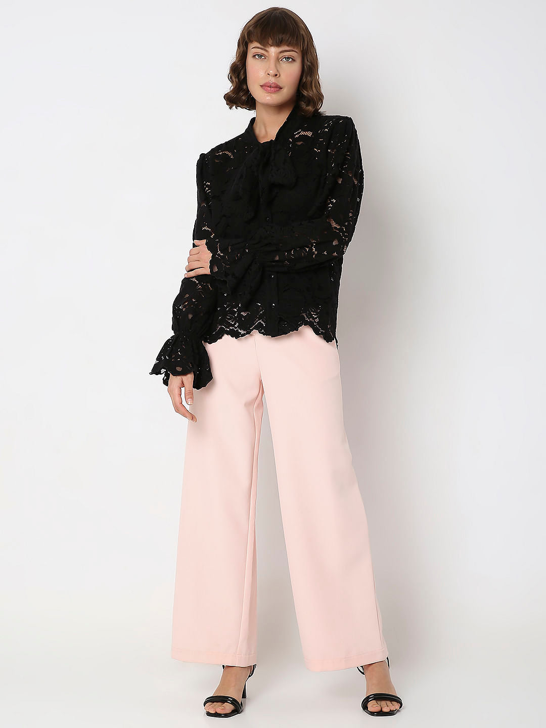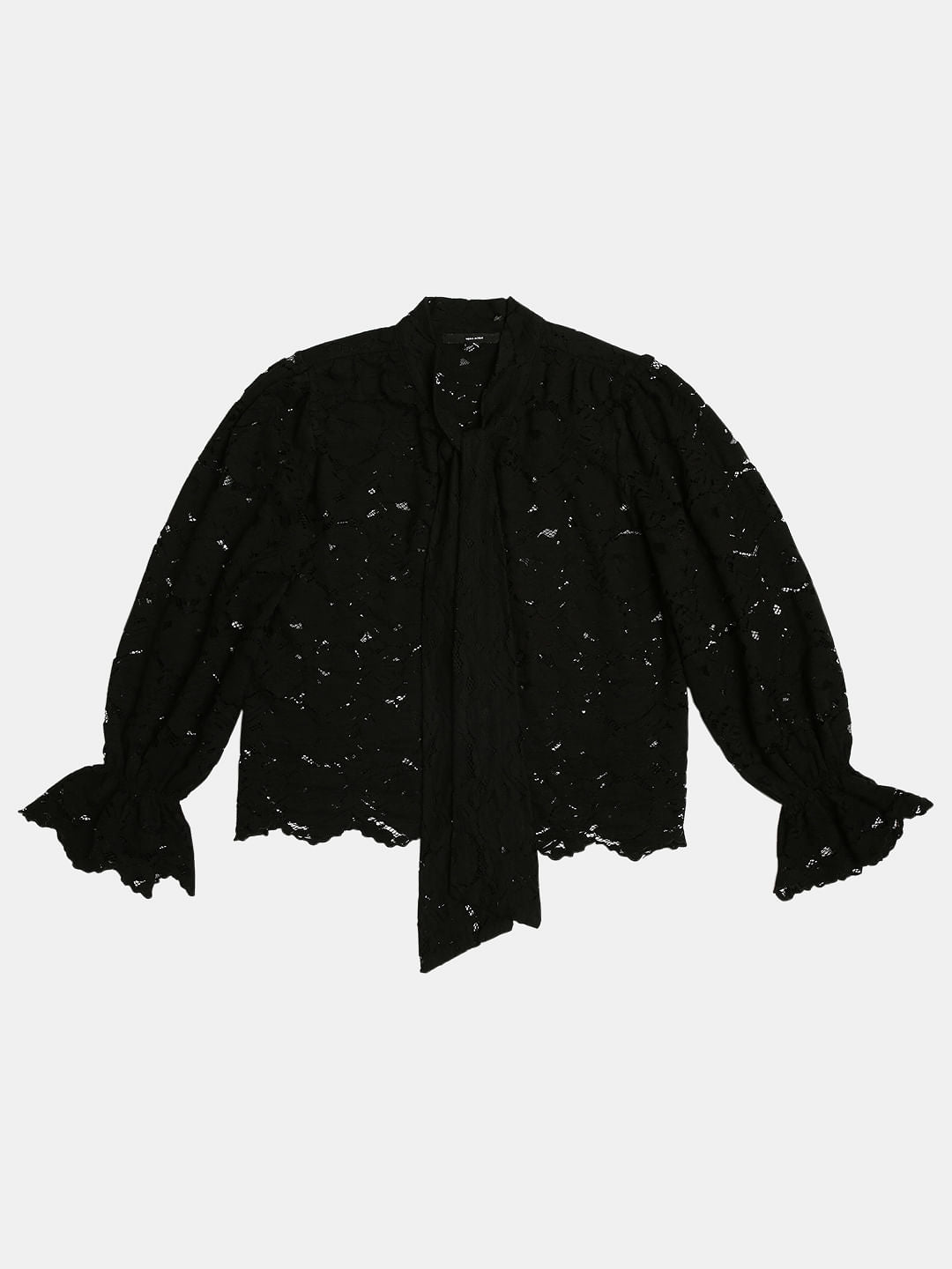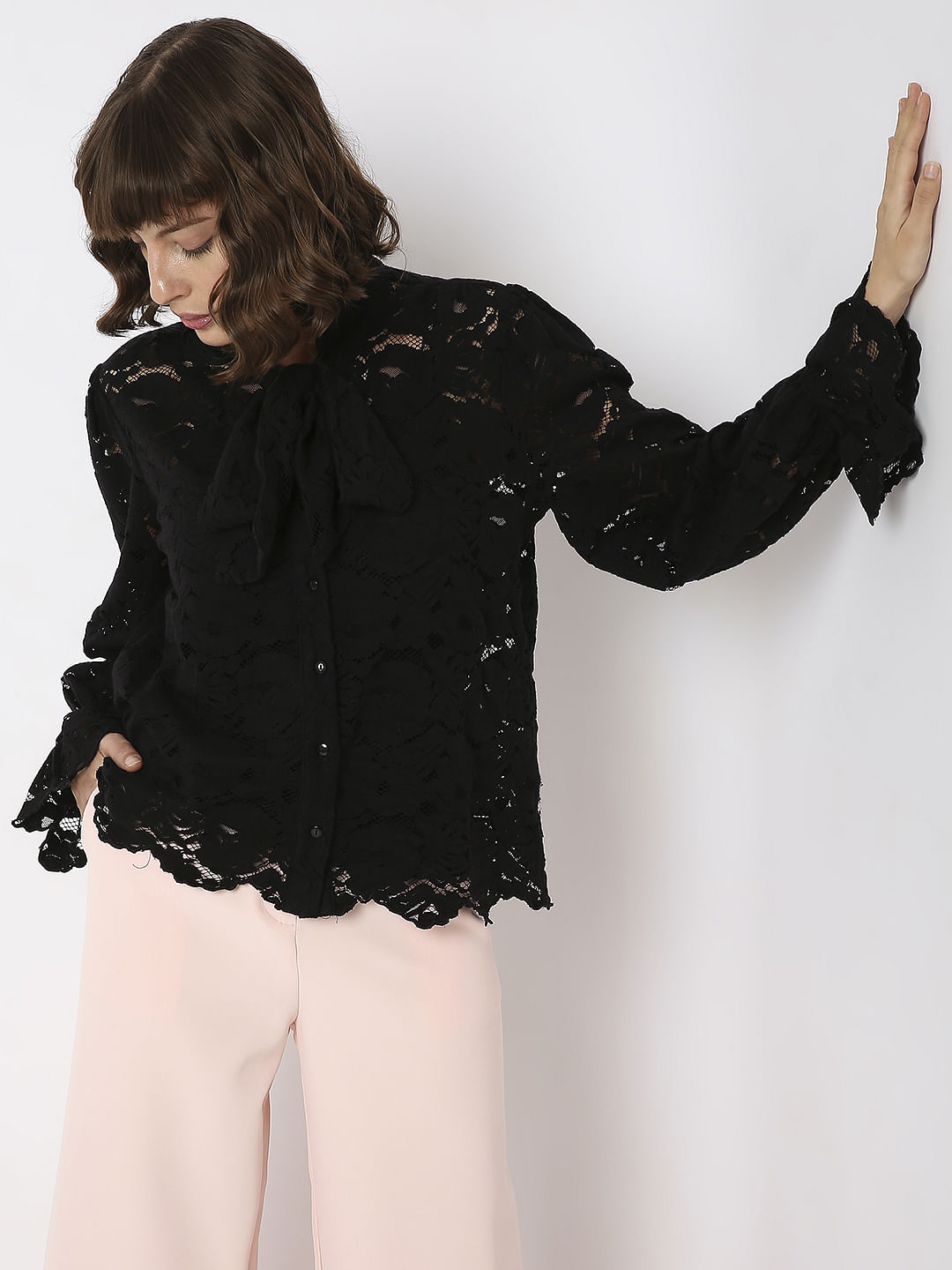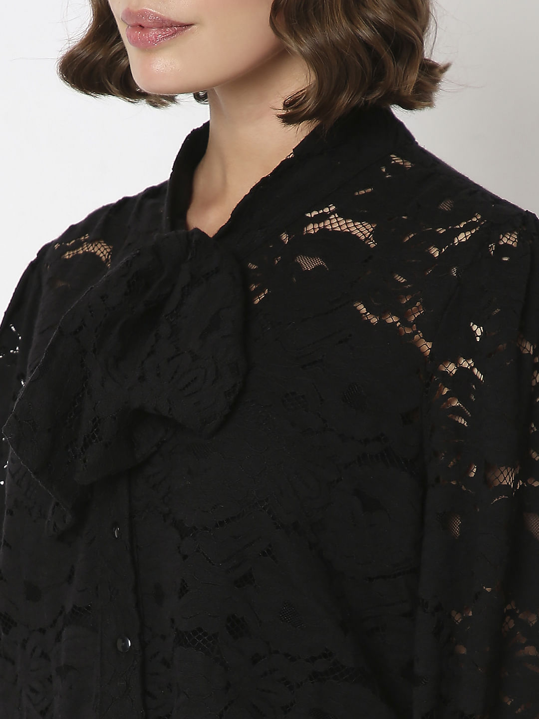 Look effortlessly chic in this Vero Moda Solid Black Lace Top. This timeless top is designed with a front neck tie-up, full sleeves and an elasticated sleeve hem for a comfortable fit. The frill detail along the neckline and length of the top that falls at hip add extra sophistication. Style it with high-waisted jeans and pointed toe heels for a timeless evening look.