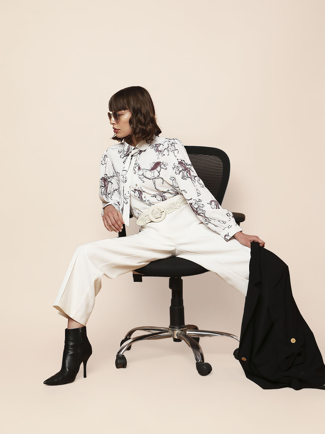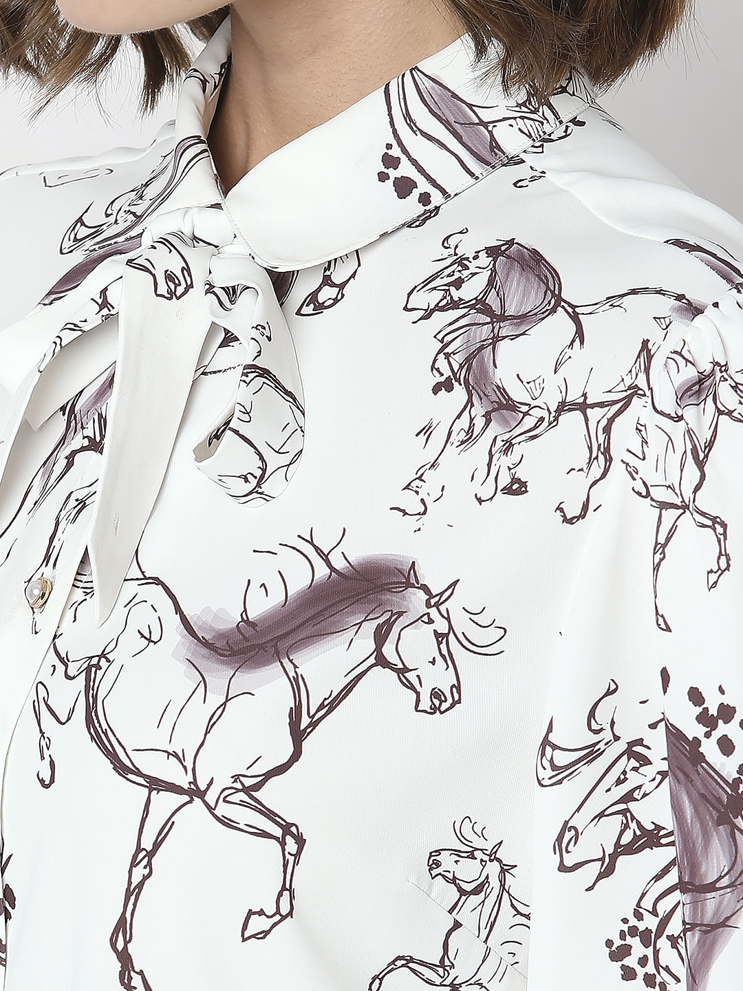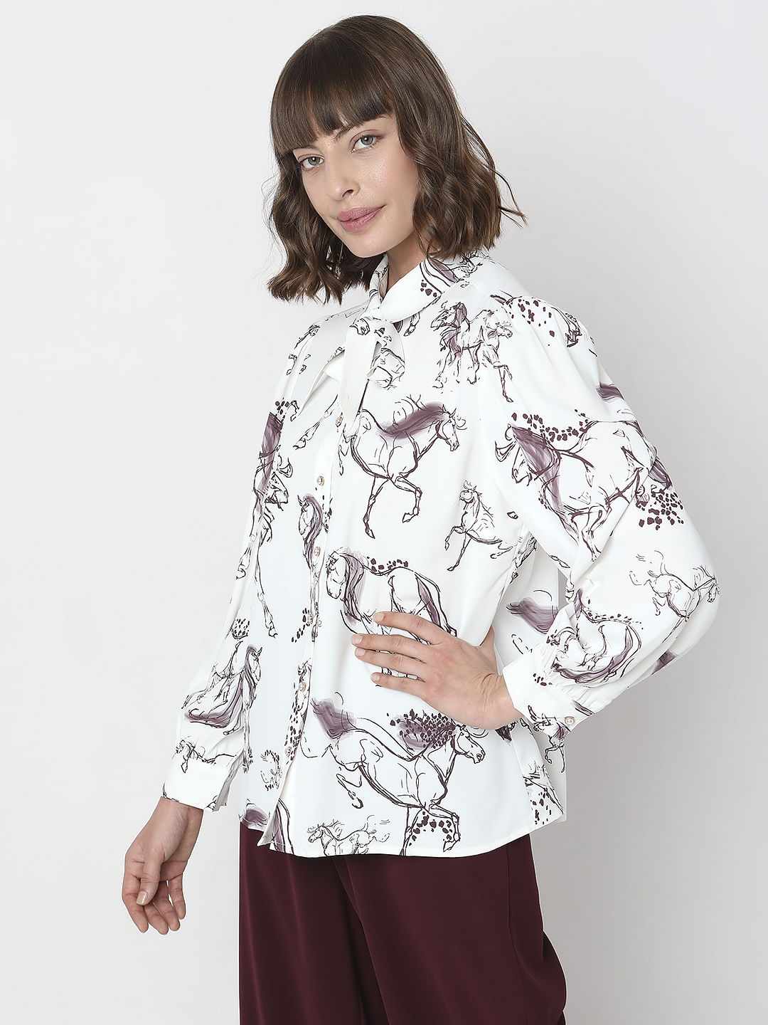Printed regular fit full sleeves shirt with blouson sleeve detailing and neck tie-up. Length of the shirt falls at hips. Perfect to wear with trousers or wide leg pants and heels.