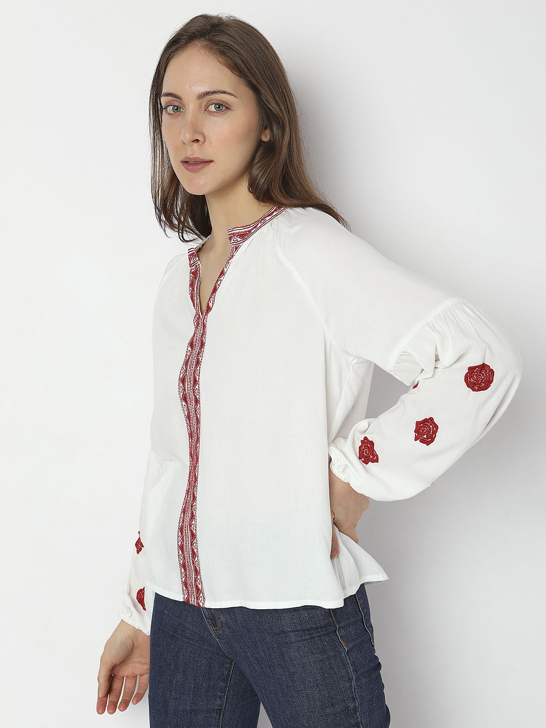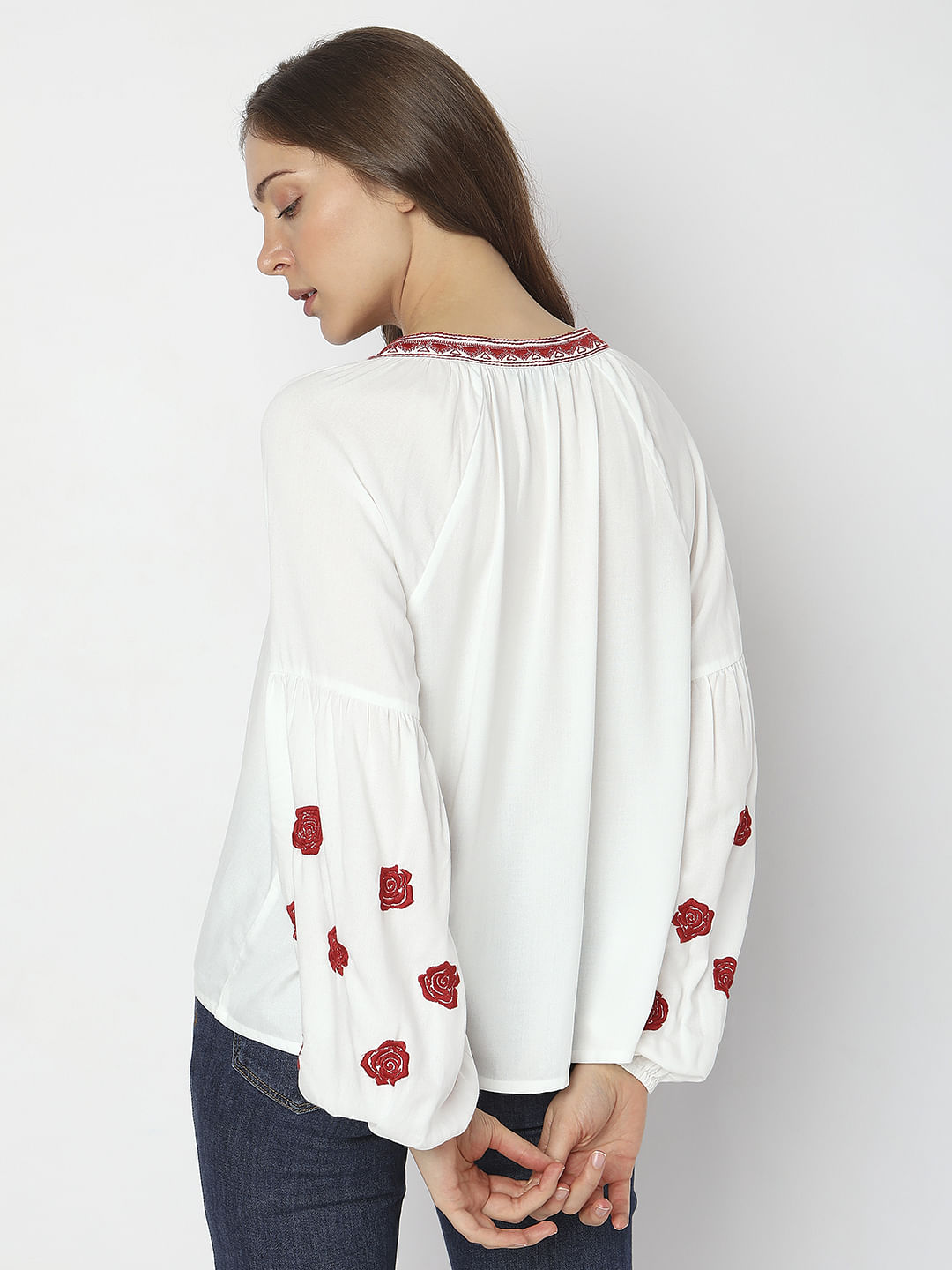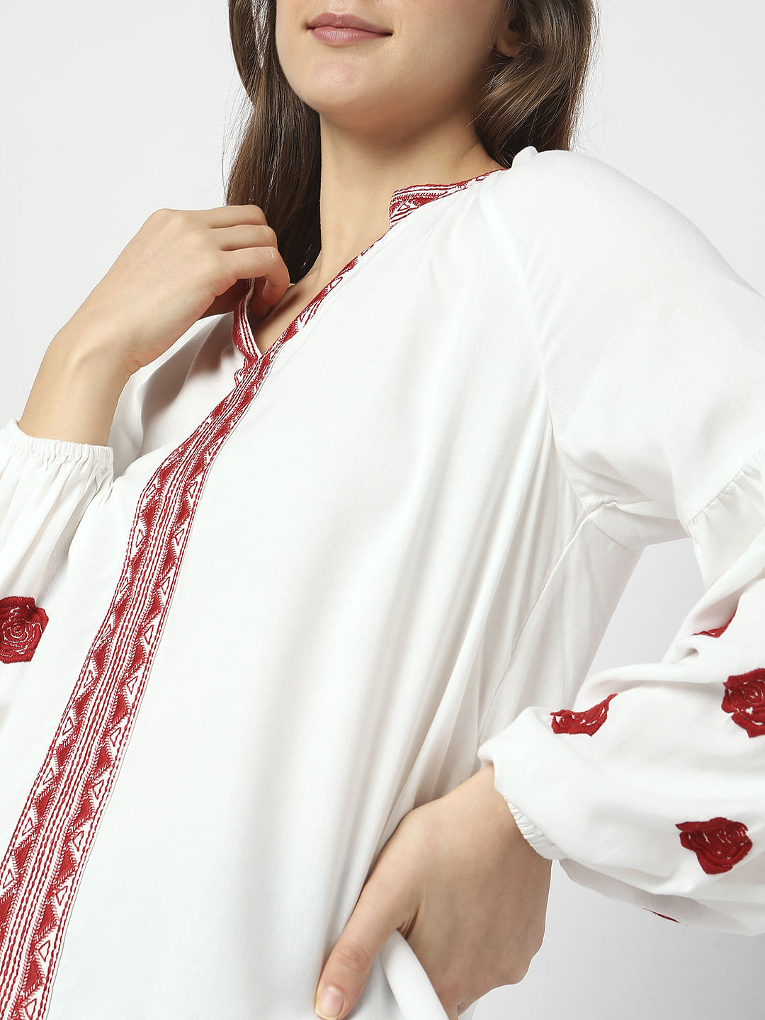 White long puff sleeves top with red embroidery in front and on sleeve hem, drop shoulder, and regular fit.