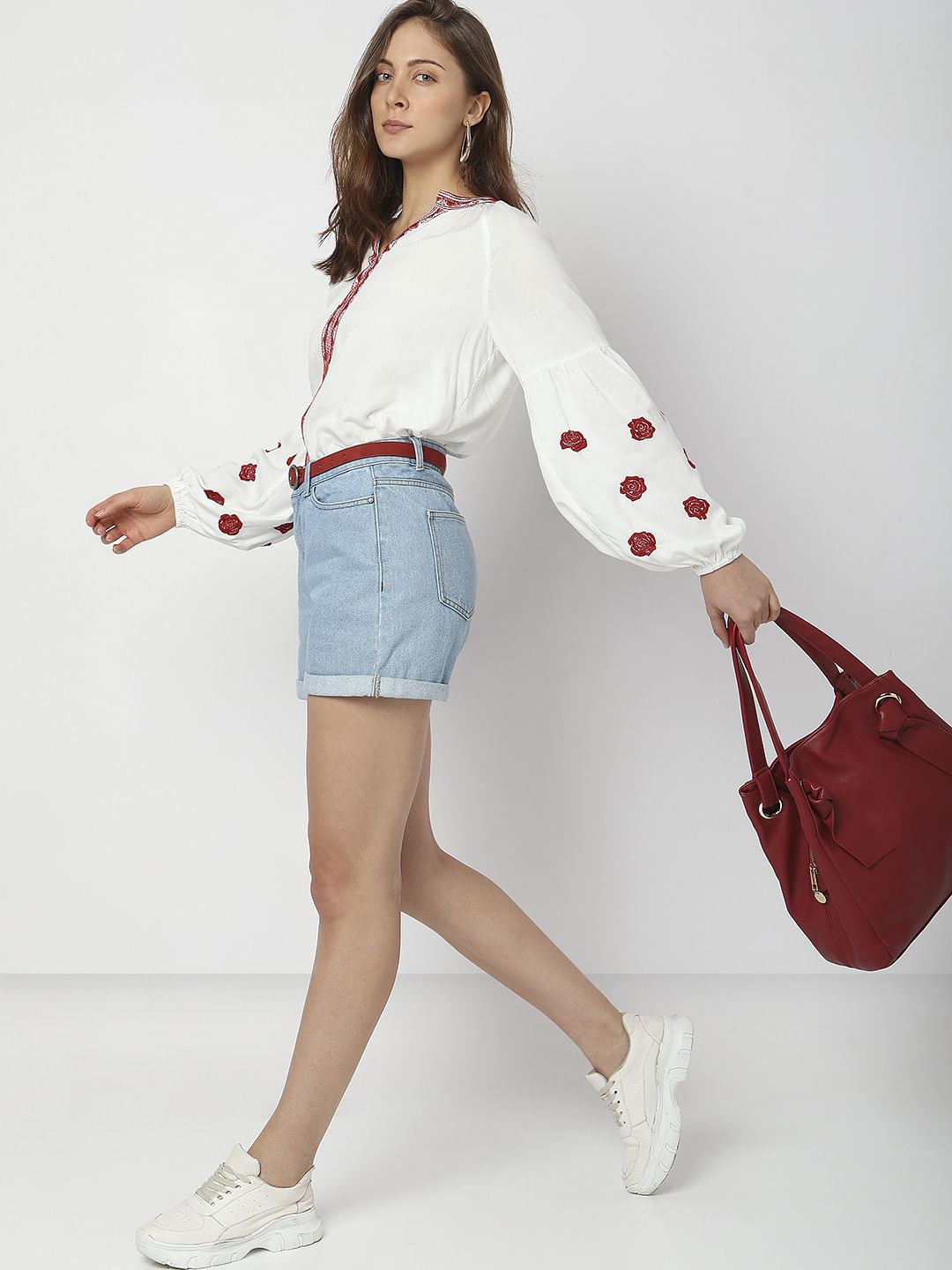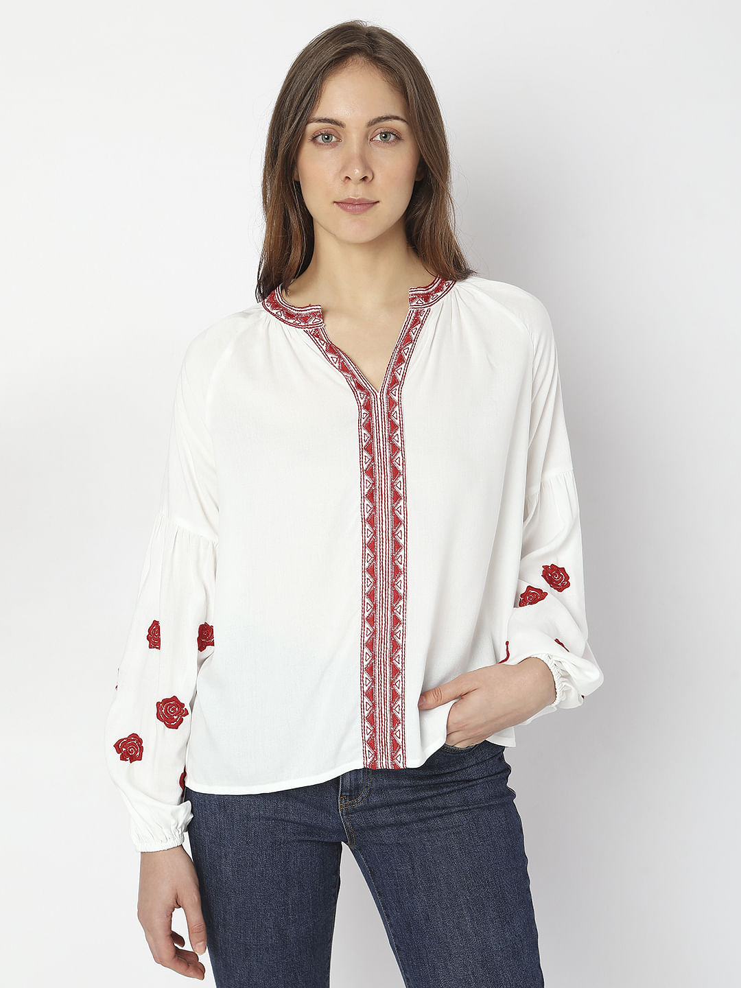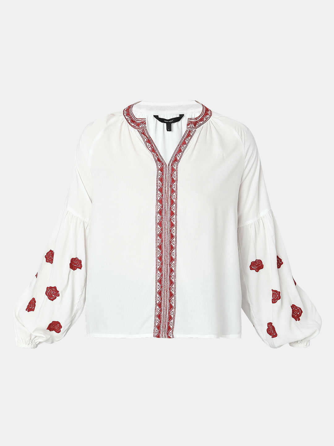 White long puff sleeves top with red embroidery in front and on sleeve hem, drop shoulder, and regular fit.