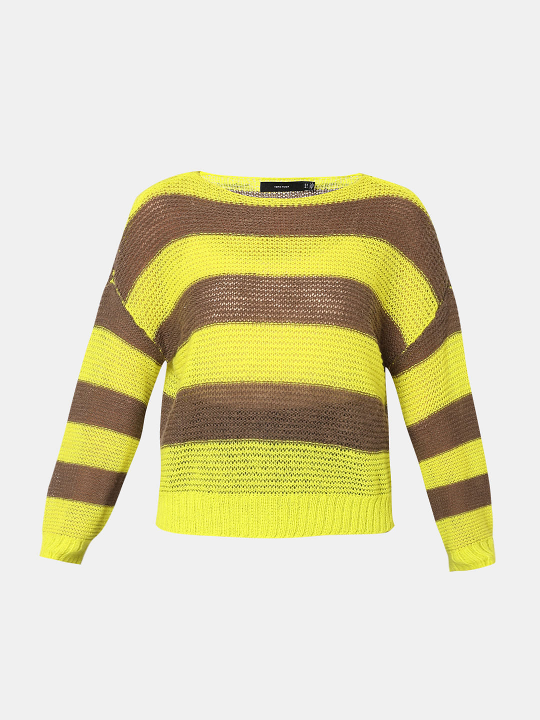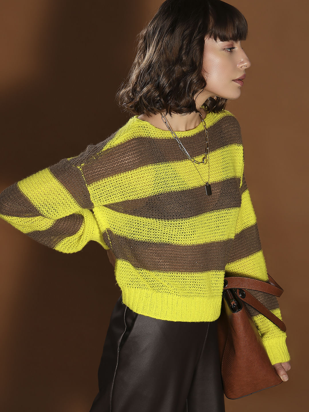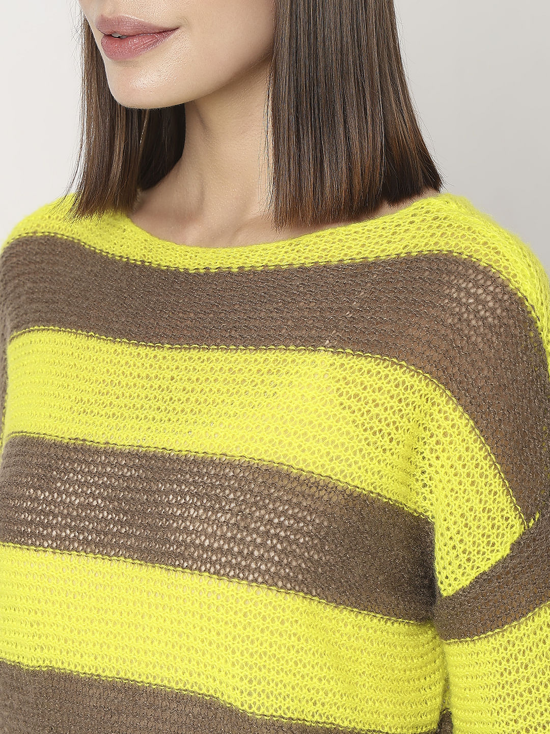 Striped Green and Brown boatneck pullover made from recycled polyester fabric. Designed with a round neck, long sleeve, drop shoulder, and falls at hips. Style it with jeans and sneakers.