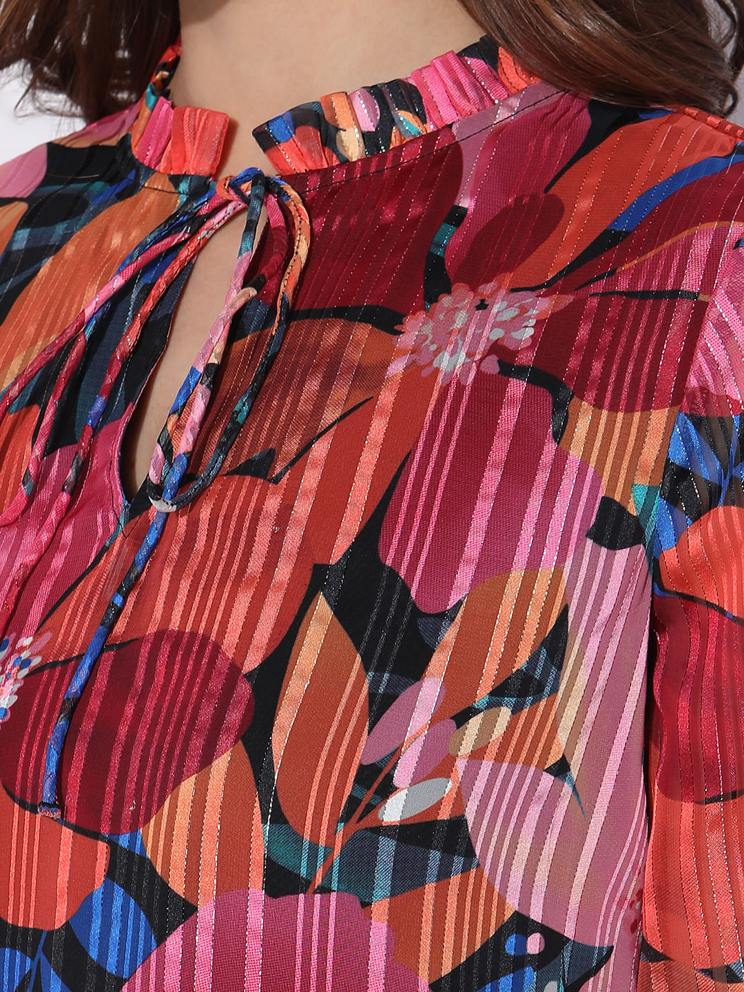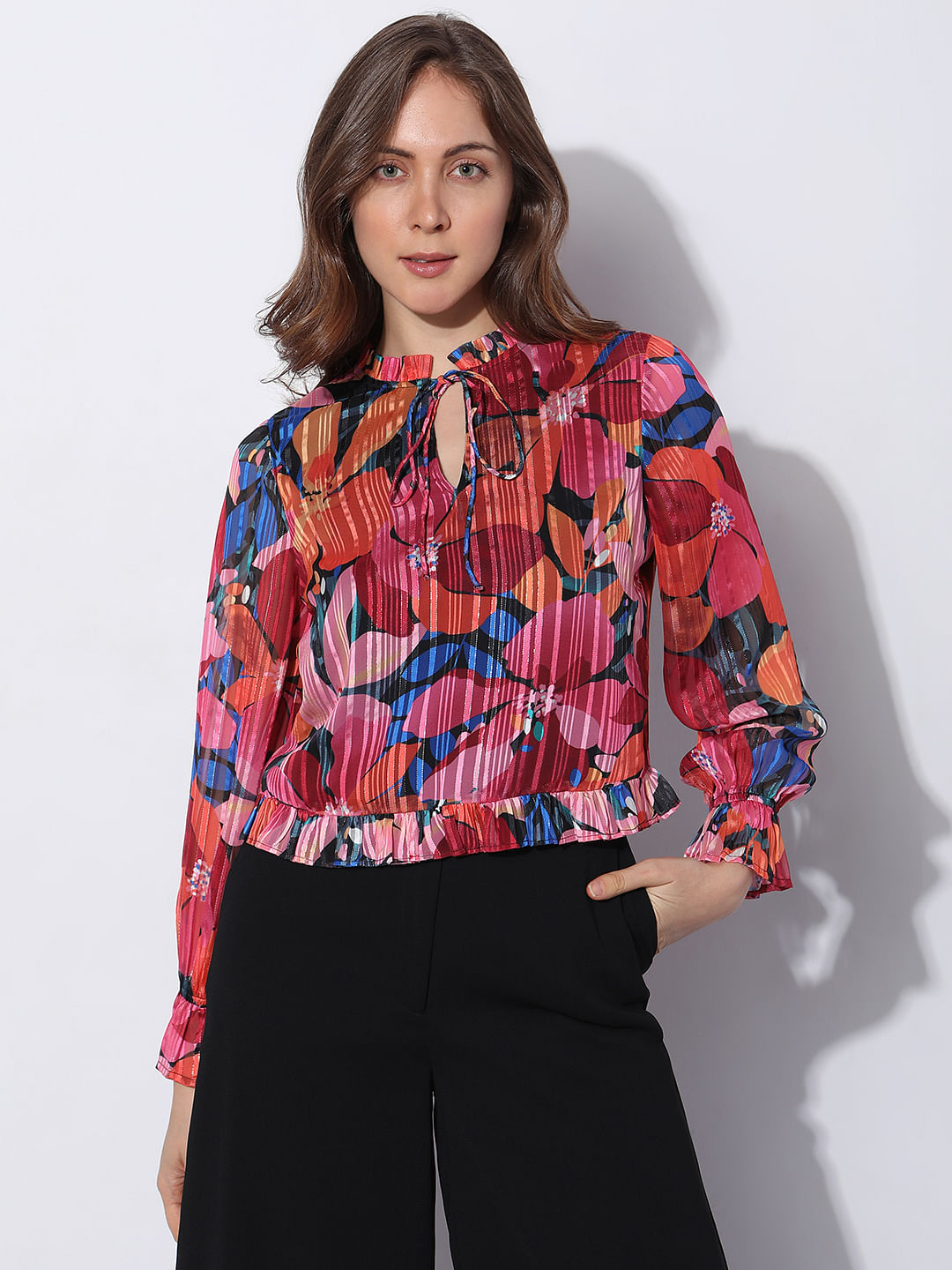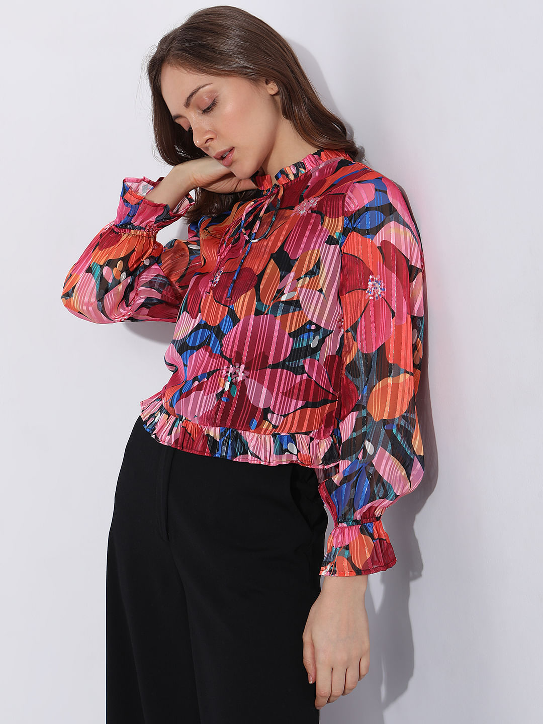 All over floral printed top with subtle frill detailing, tie-up at the neck, self-design stripes, and cinching at sleeves. Style with strappy heels and trousers.