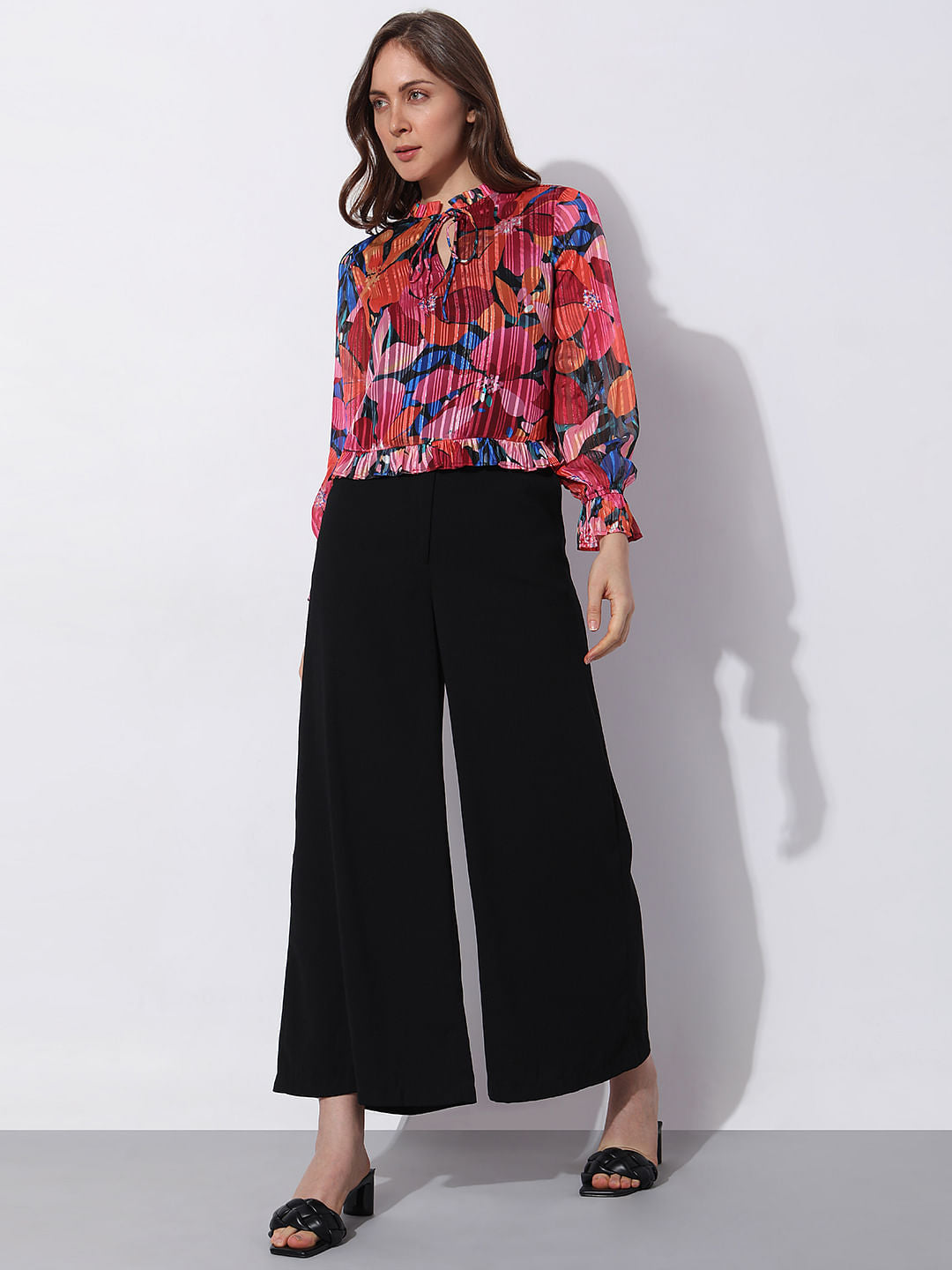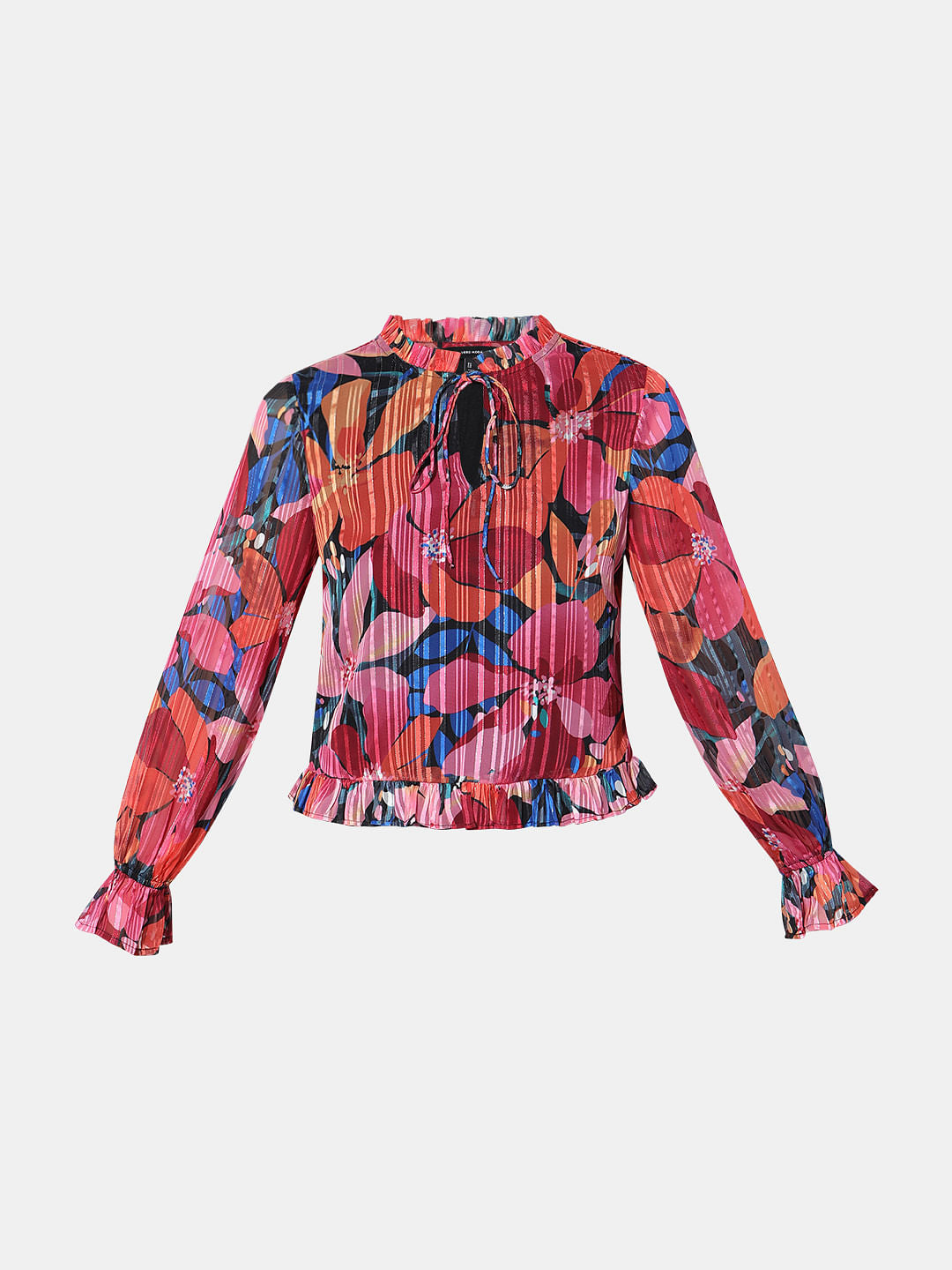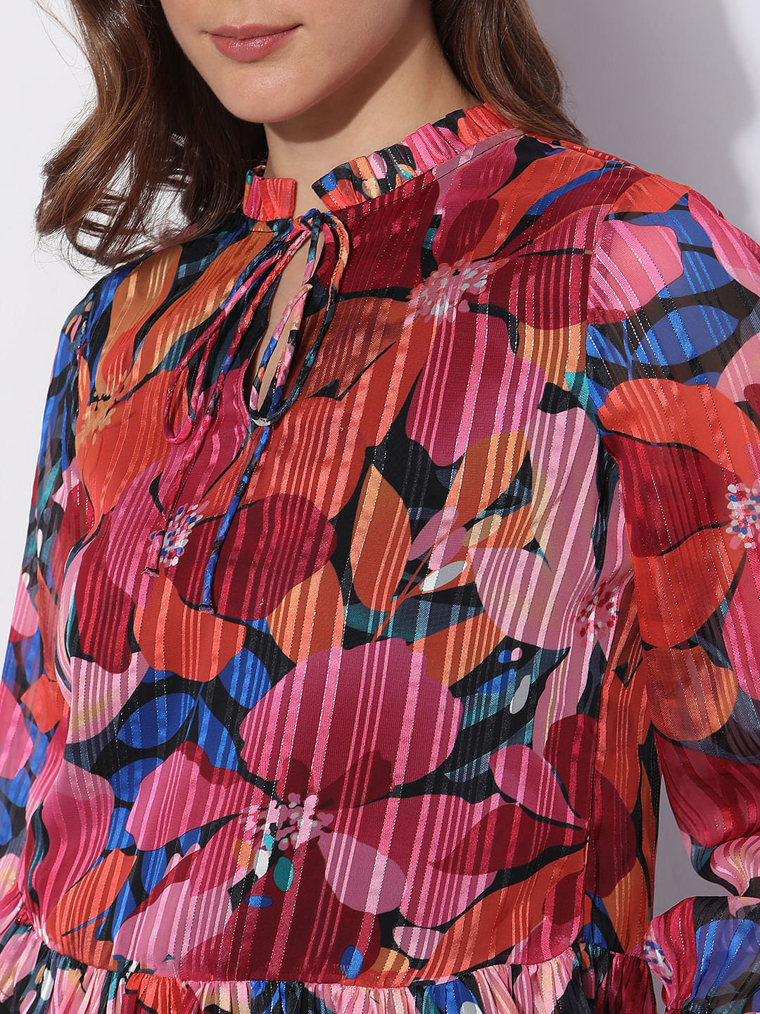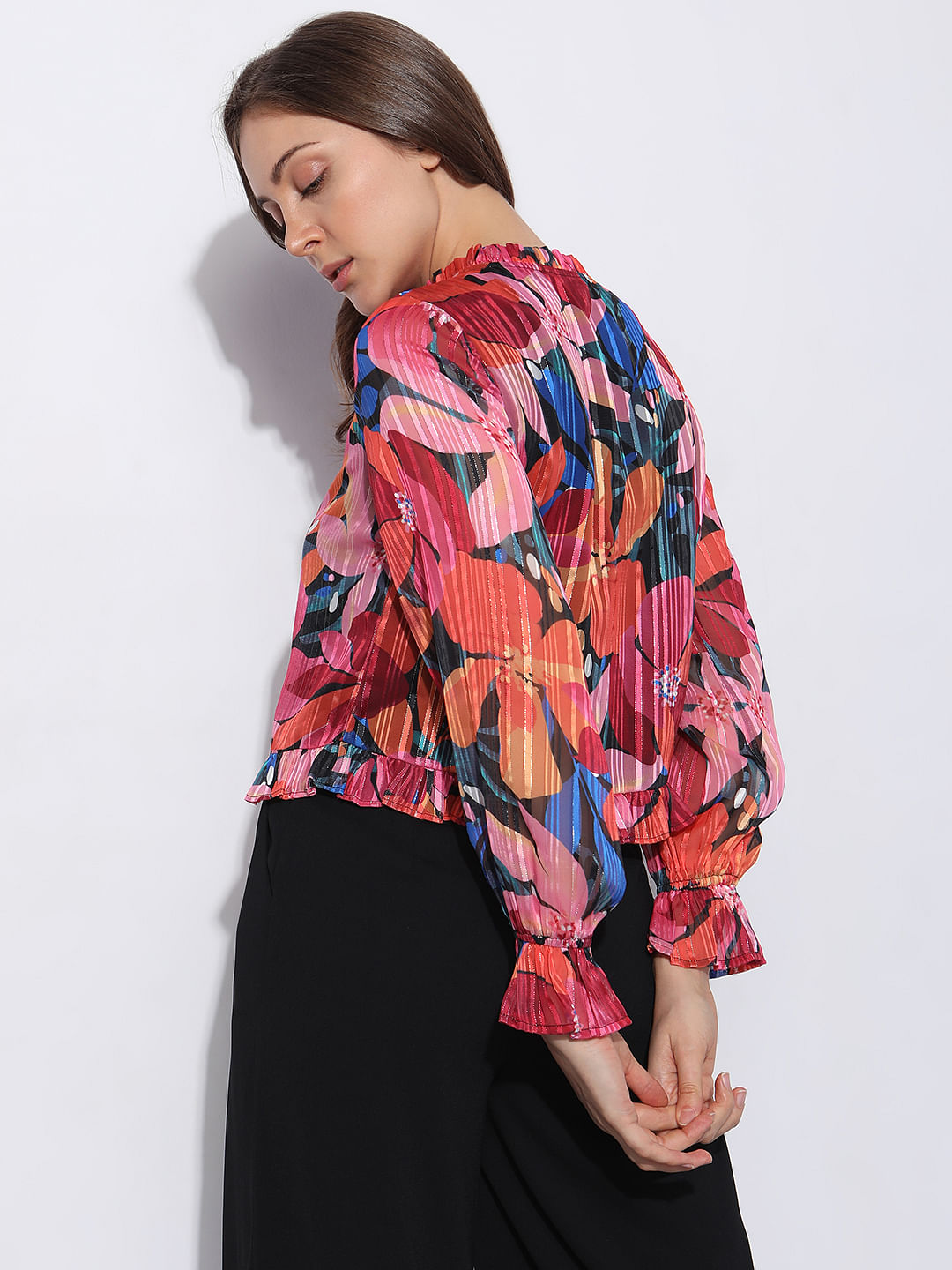 All over floral printed top with subtle frill detailing, tie-up at the neck, self-design stripes, and cinching at sleeves. Style with strappy heels and trousers.