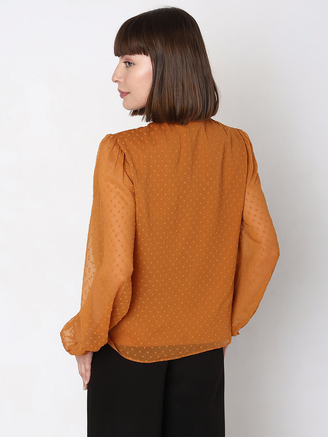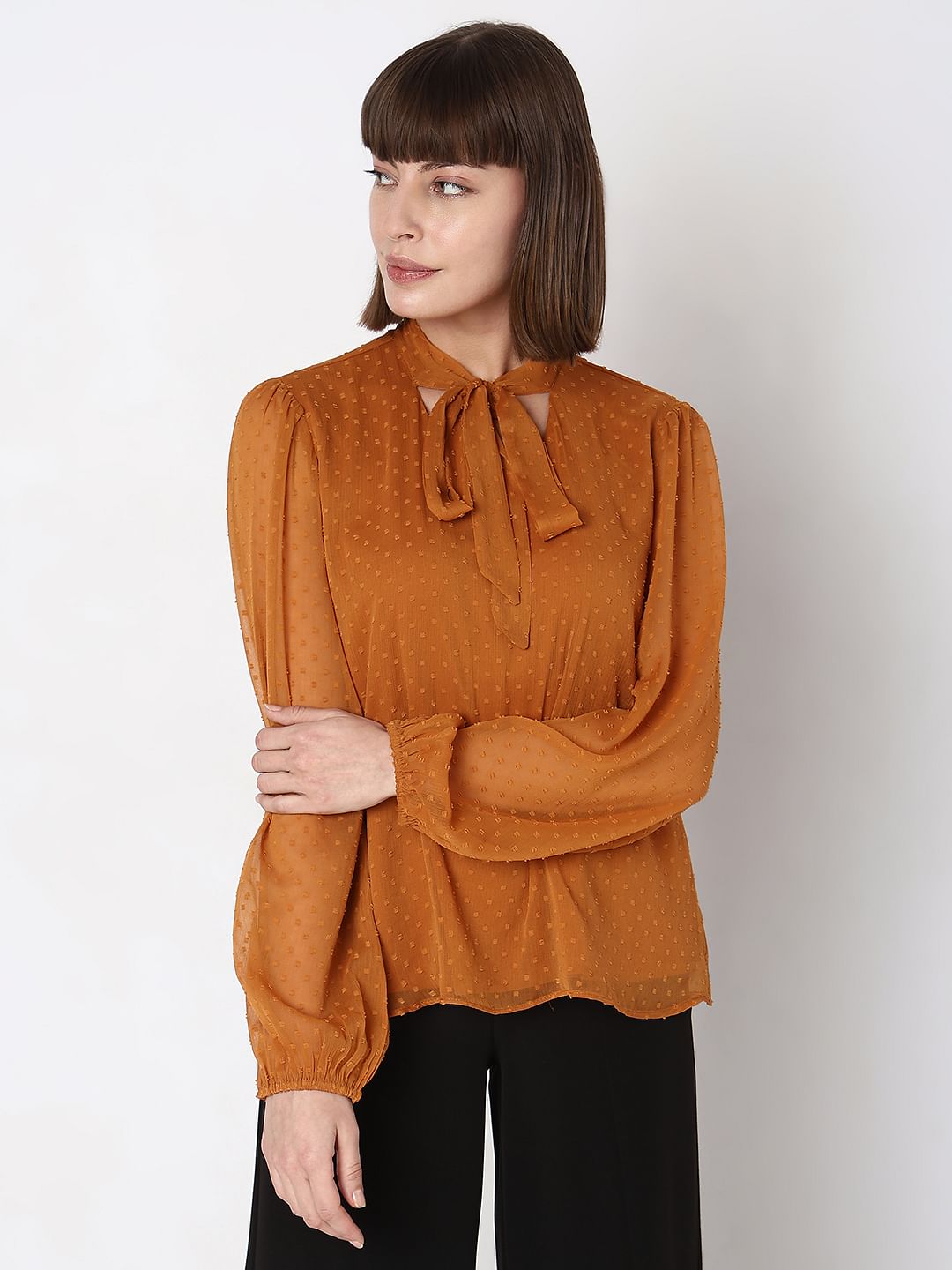 This Dark yellow solid Dobby Top from Vero Moda is the perfect versatile piece to add to your wardrobe. Featuring a full sleeve with an elasticated sleeve hem, a neck-tie-up, and a front V neckline, this top is sure to be both comfortable and stylish. The round hem and hip-length fit will flatter any figure. Style this top with high waisted trousers and wedge heels for a chic day look or dress it up for evening with a maxi skirt and statement earrings.