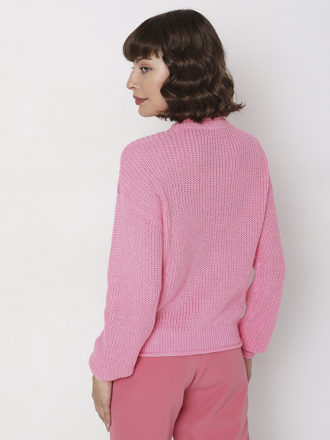 Cosy and chic pink pullover in jacquard knit fabric. Designed with a round Neck, full sleeves, drop shoulder style, and length that falls at hips. Style it with black trousers and heels for an elegant look.