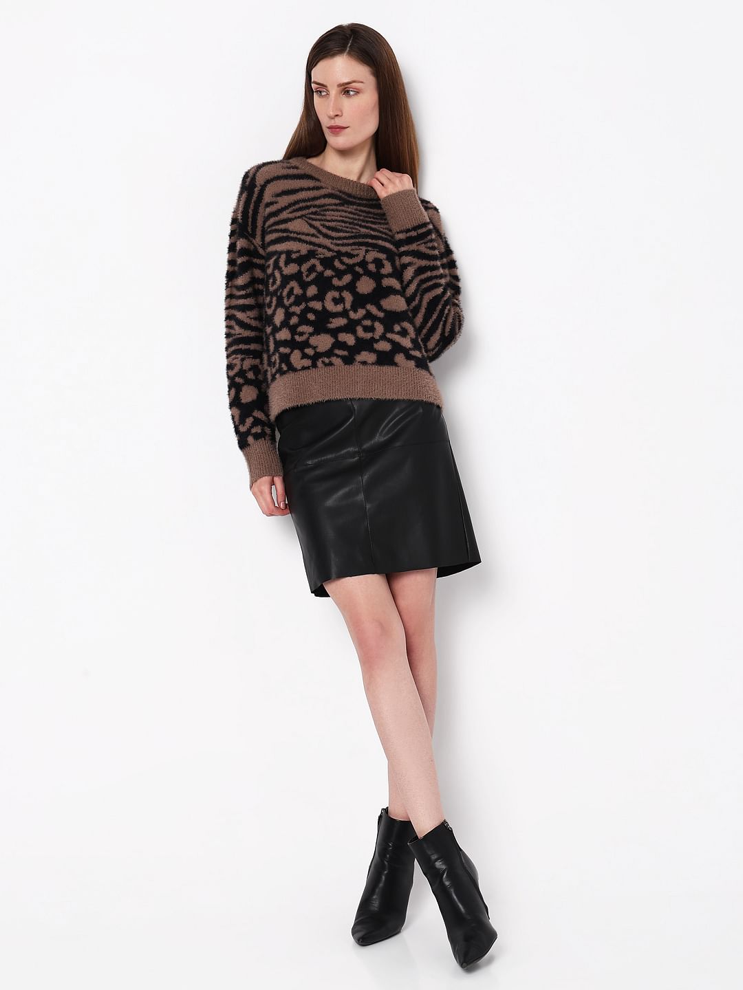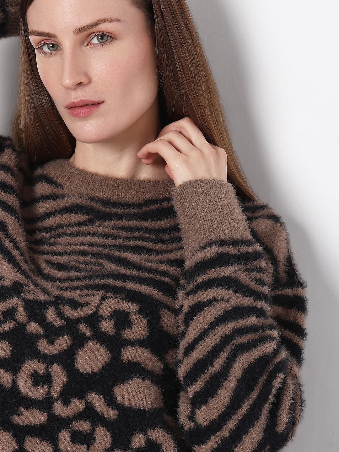 Brown animal printed pullover cut in a relax fit and long sleeves. Length falls on hip.