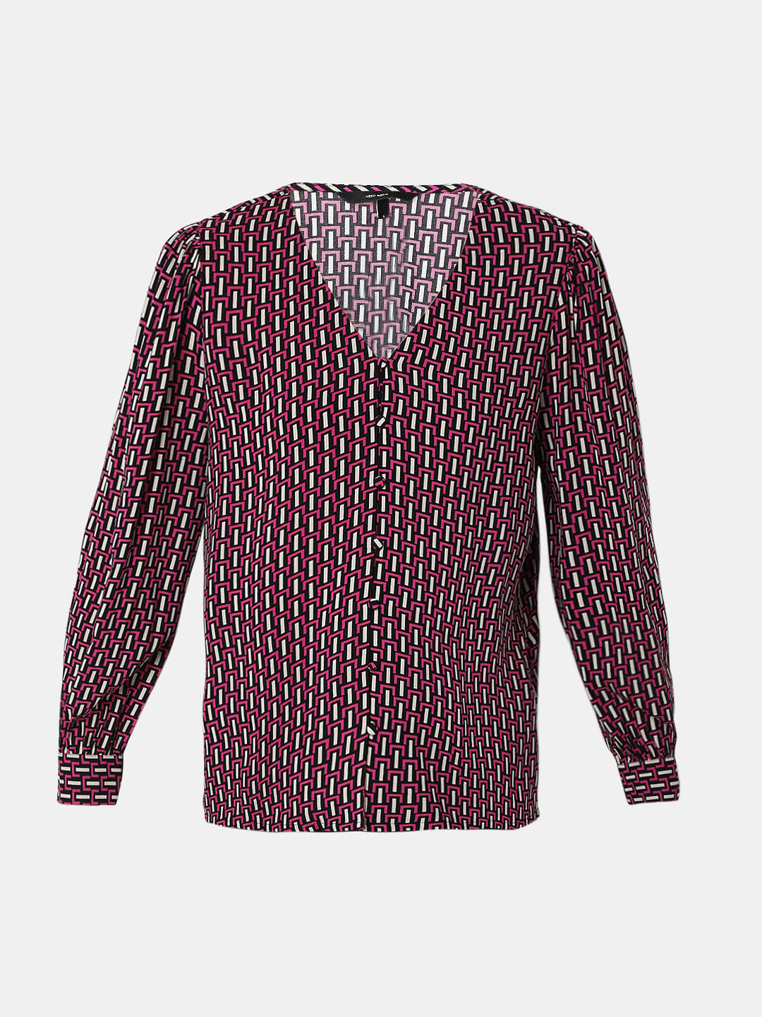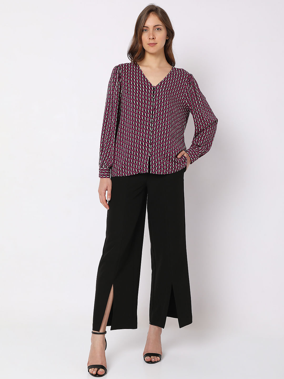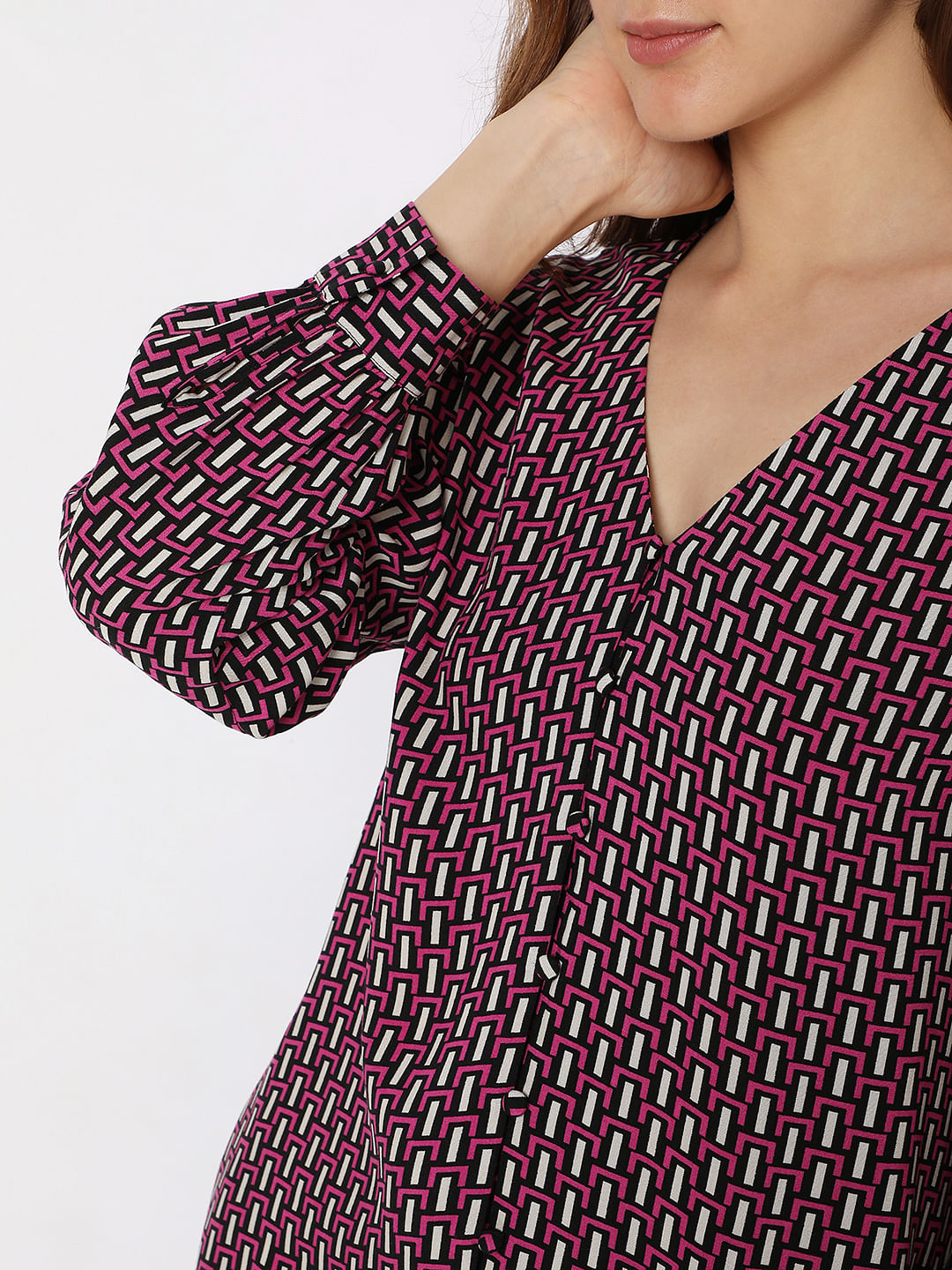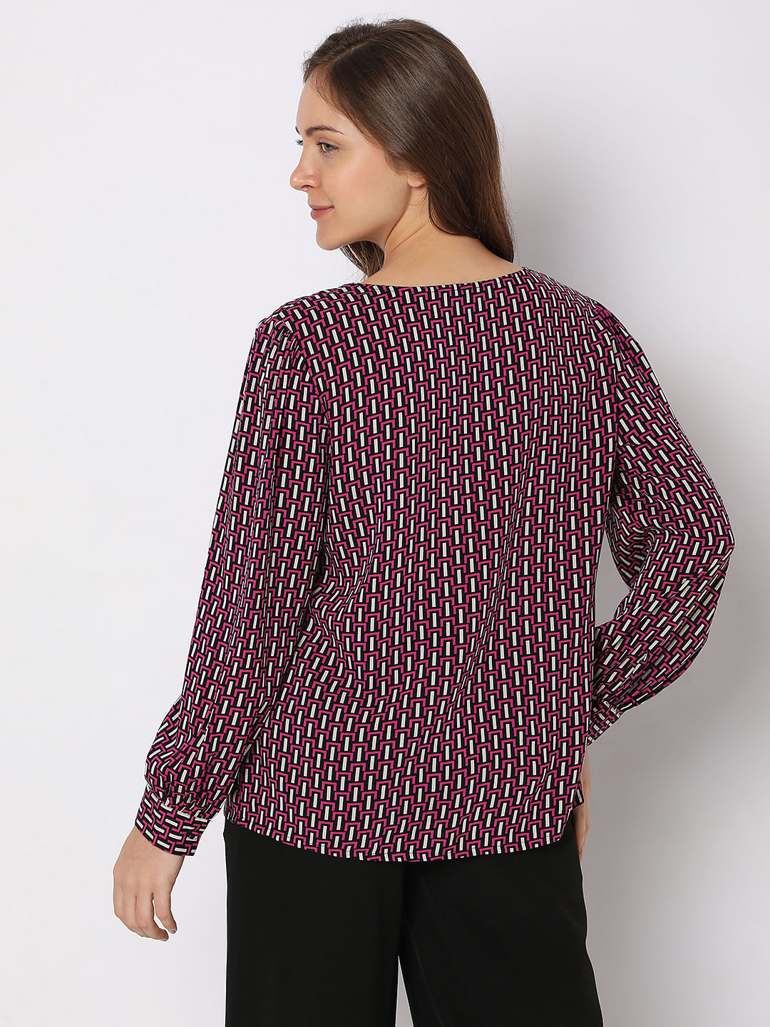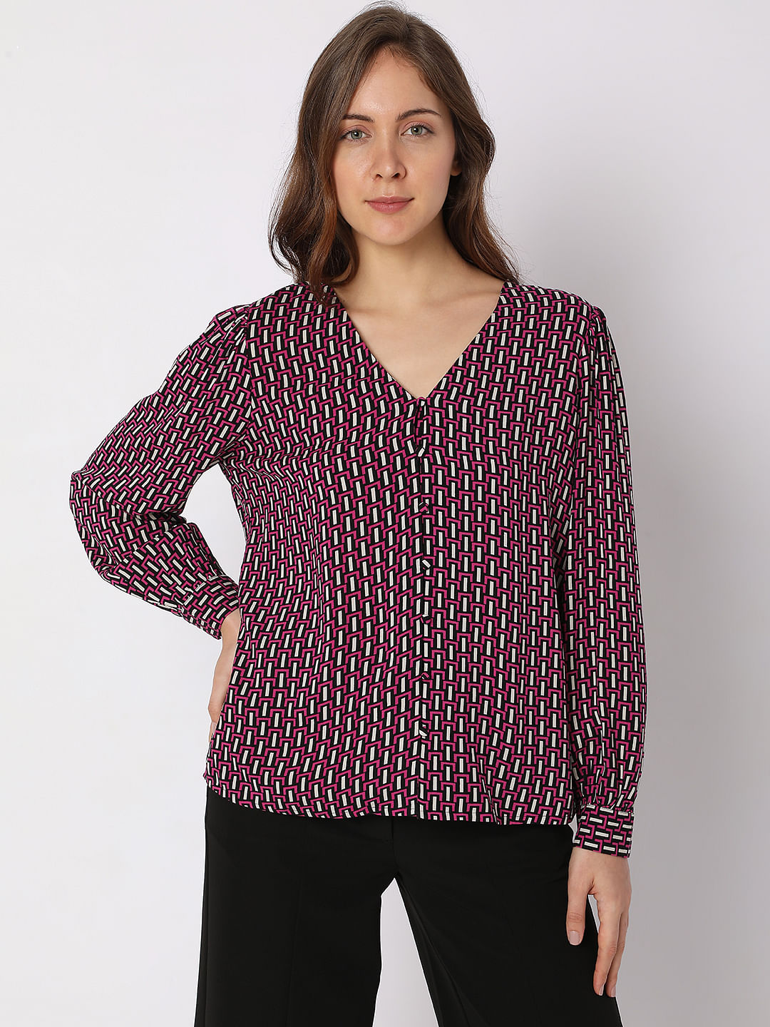 Chic pink printed V-neck top with full sleeves. Style it with black trousers and heels for a 9 to 5 and beyond outfit.