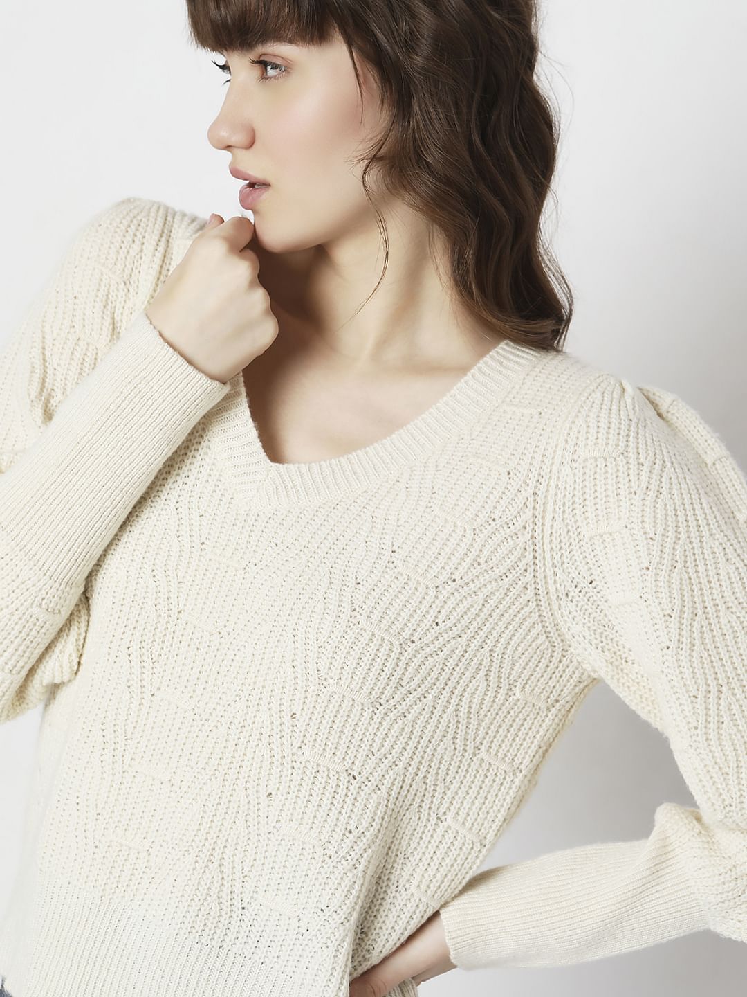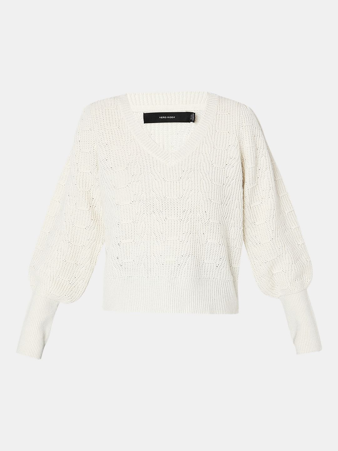 Full sleeves pointelle pullover designed with a V-neckline and falls at hips. Made from recycled polyester.
