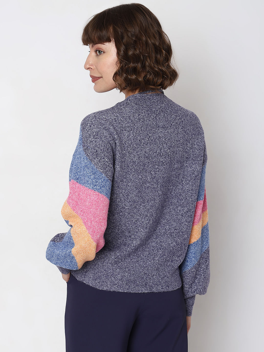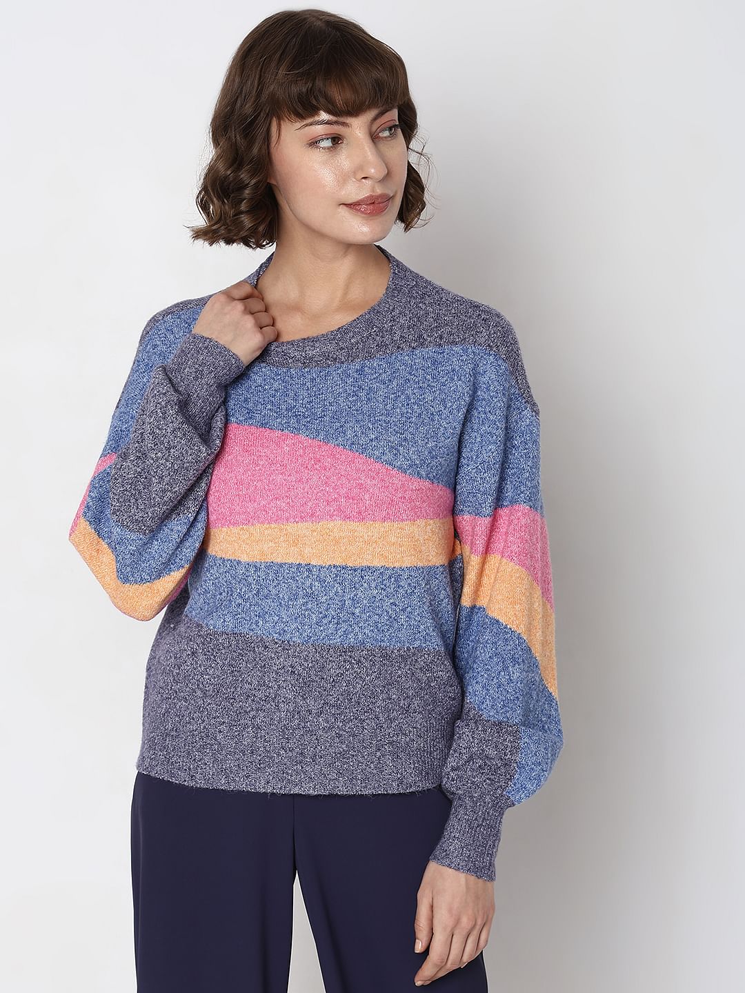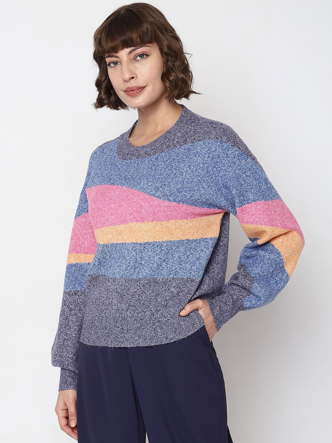 Super chic colourblocked pullover designed with volume sleeves and rib hem and ends at regular length. Style with jeans and sneakers for a cosy yet smart look!