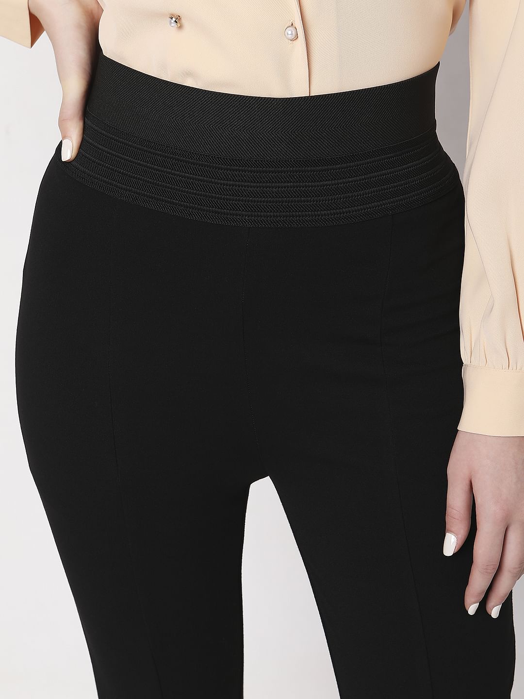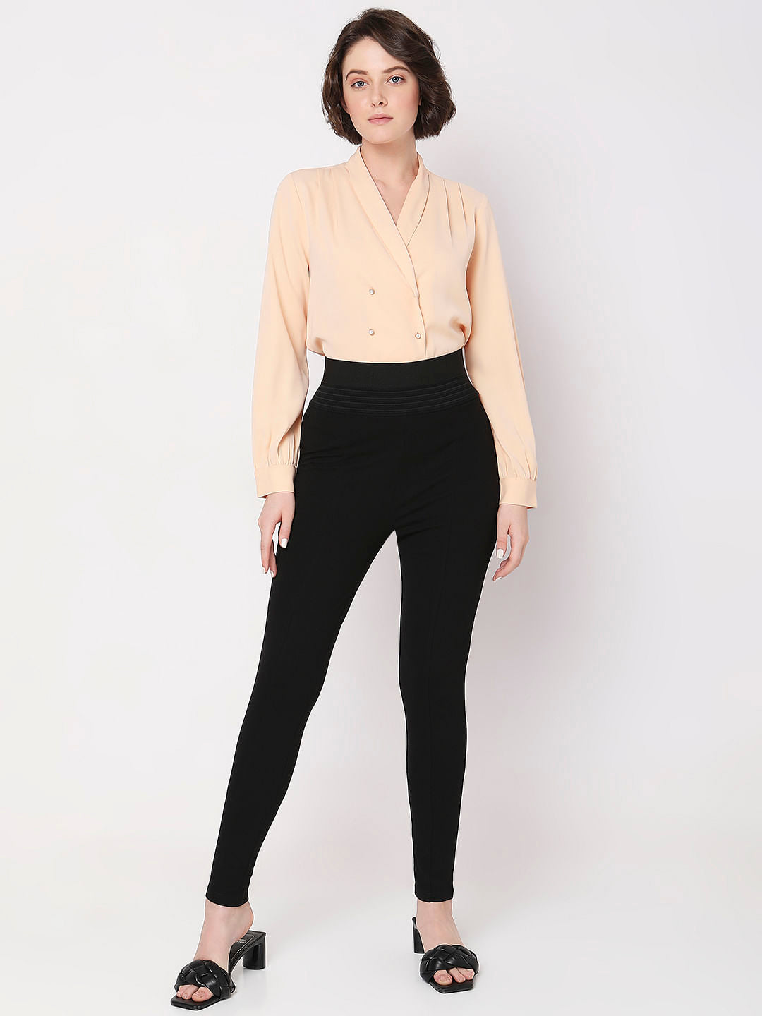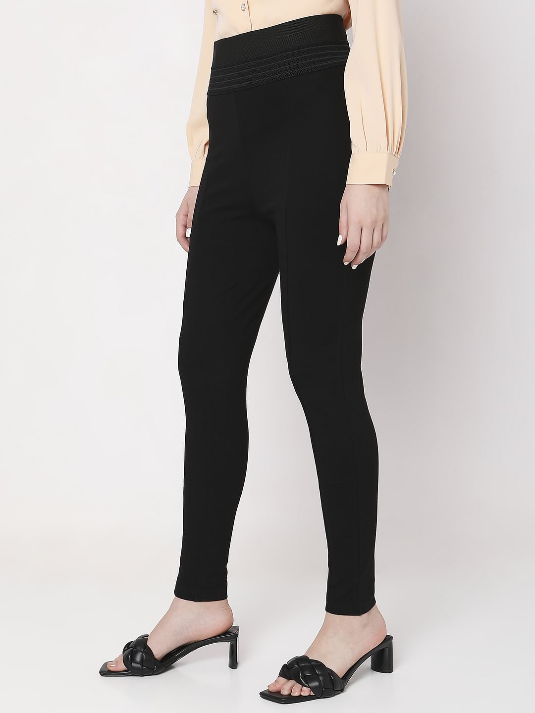 Introducing the perfect addition to your closet: the Vero Moda Solid Black High-Waisted Elastic Leggings. This sleek, skinny fit design features an elasticated waistband and princess seams along the front for a flattering silhouette and comfortable fit. Pair these ankle-length leggings with a tucked-in blouse and heels for a chic look that will take you from day to night.
