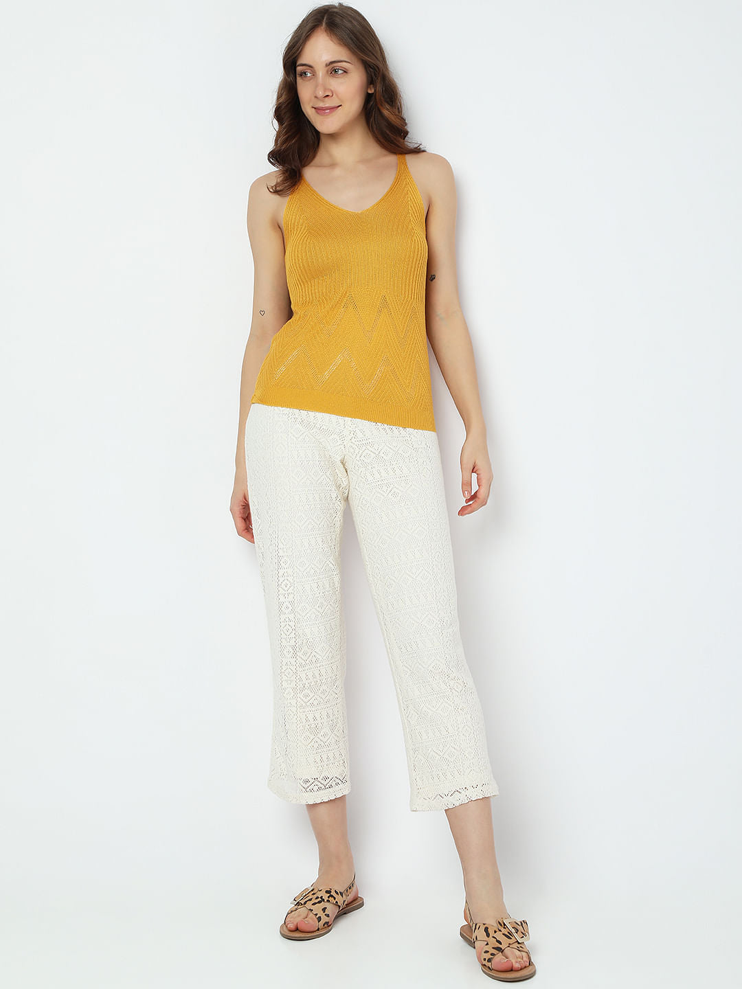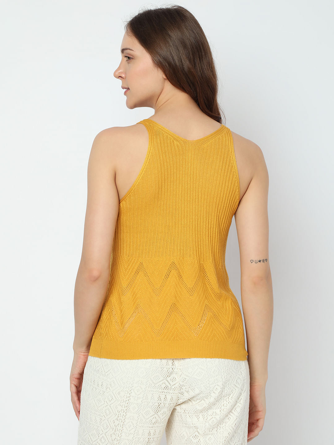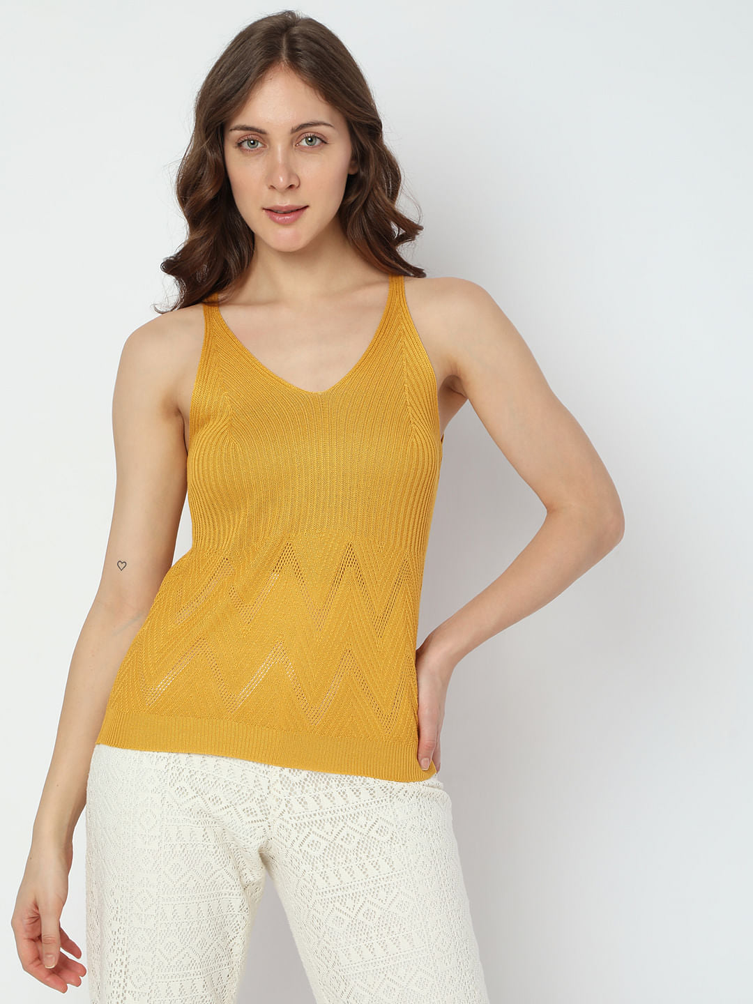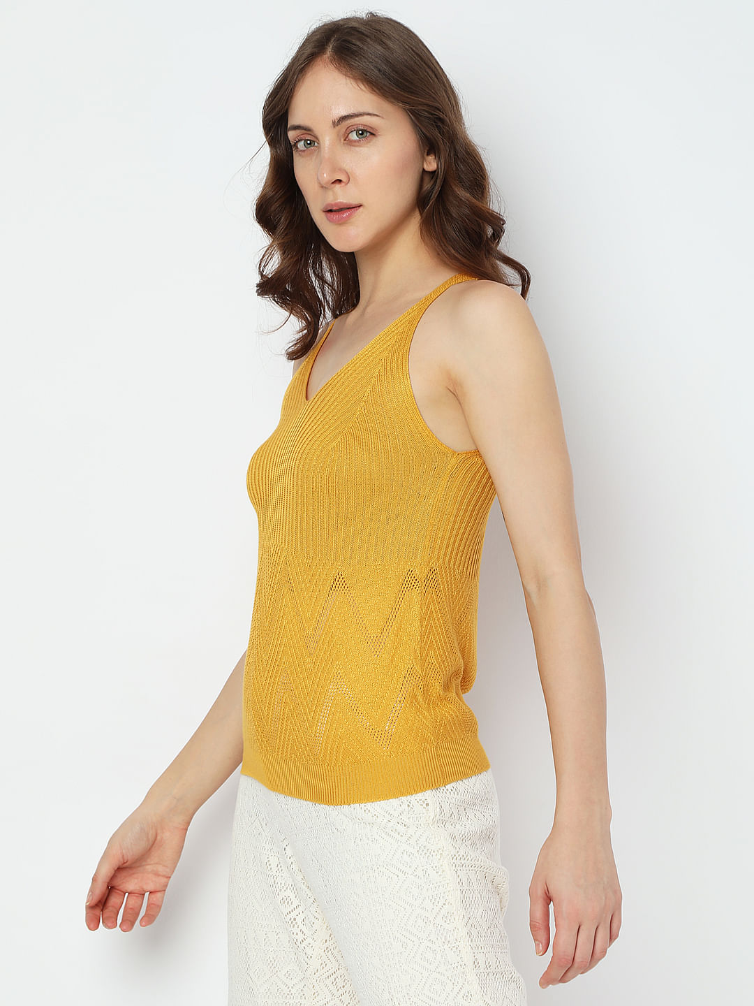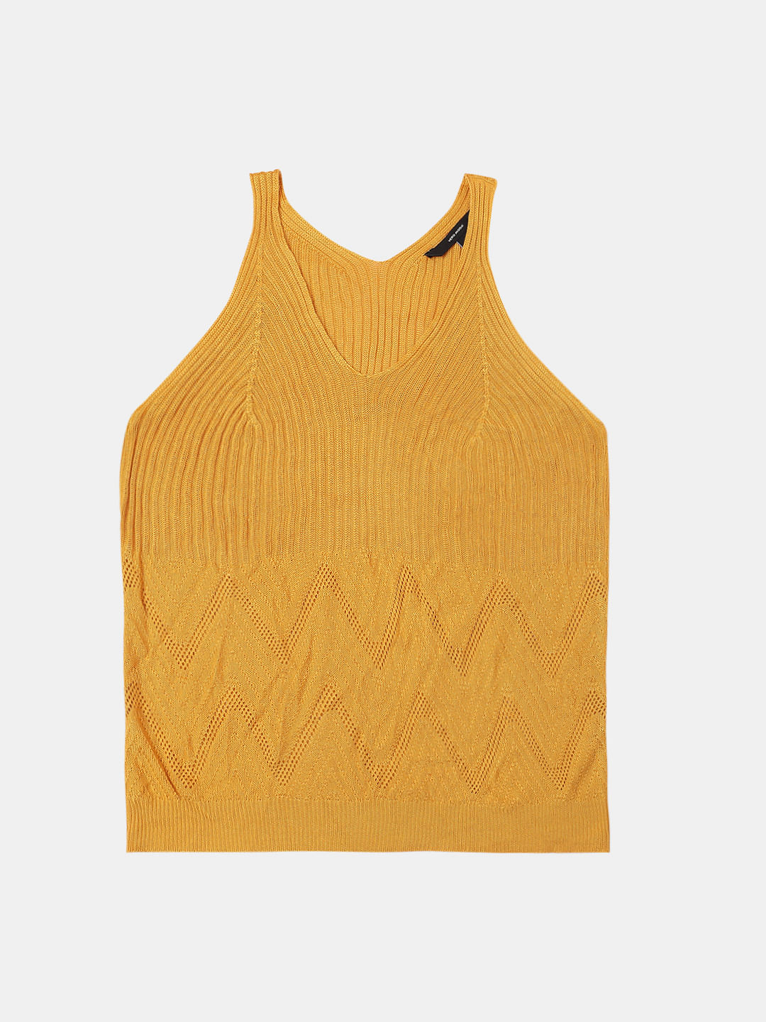 Yellow tank flatknit top made from 100% viscose. Style with white pants and heels.