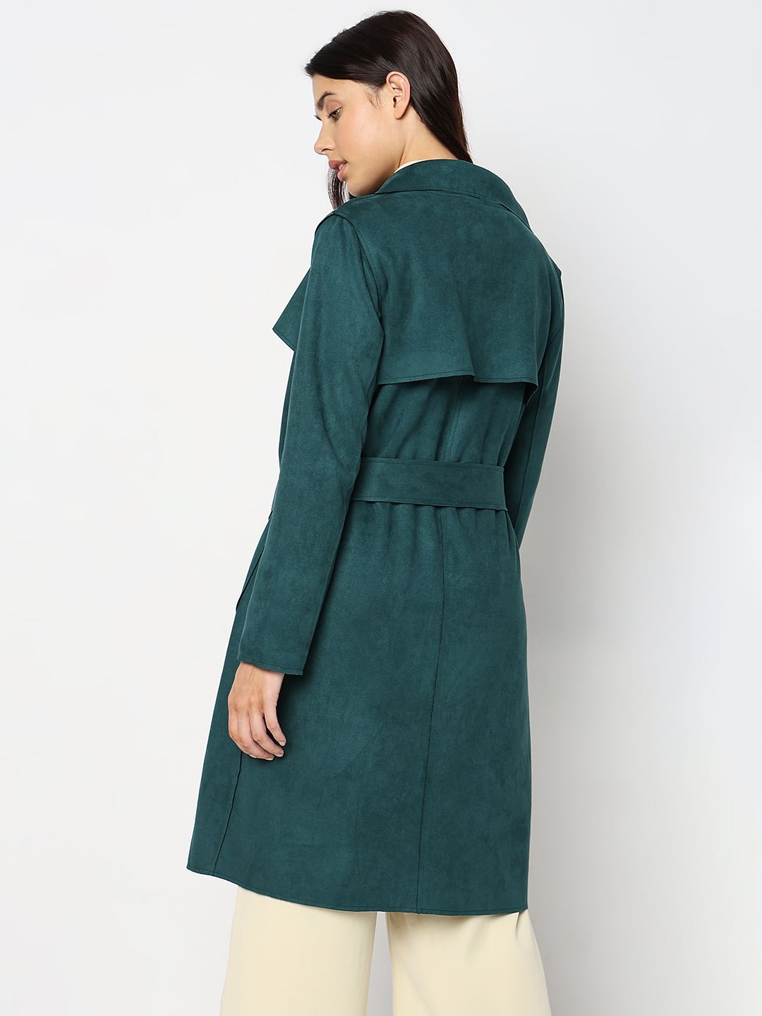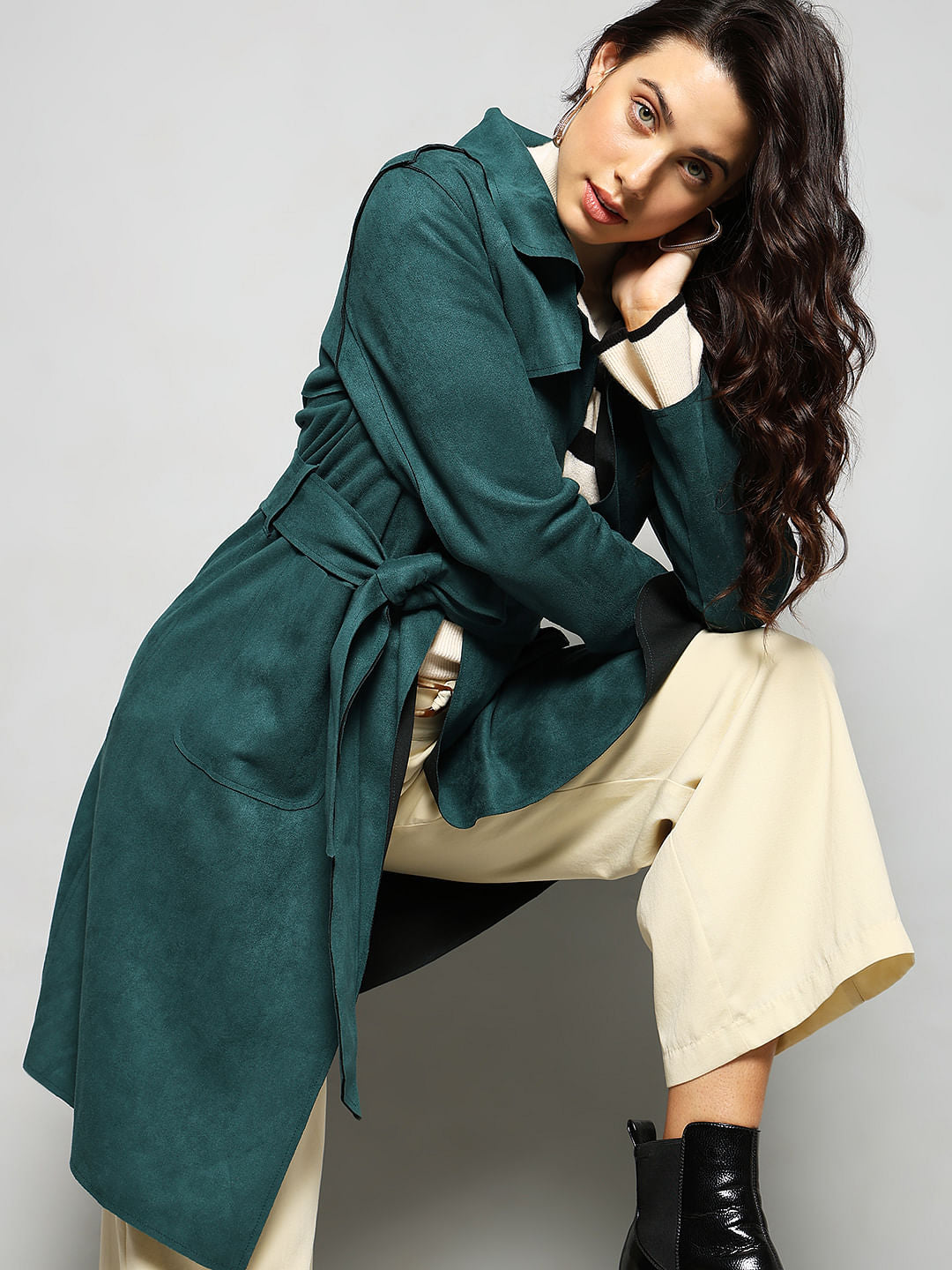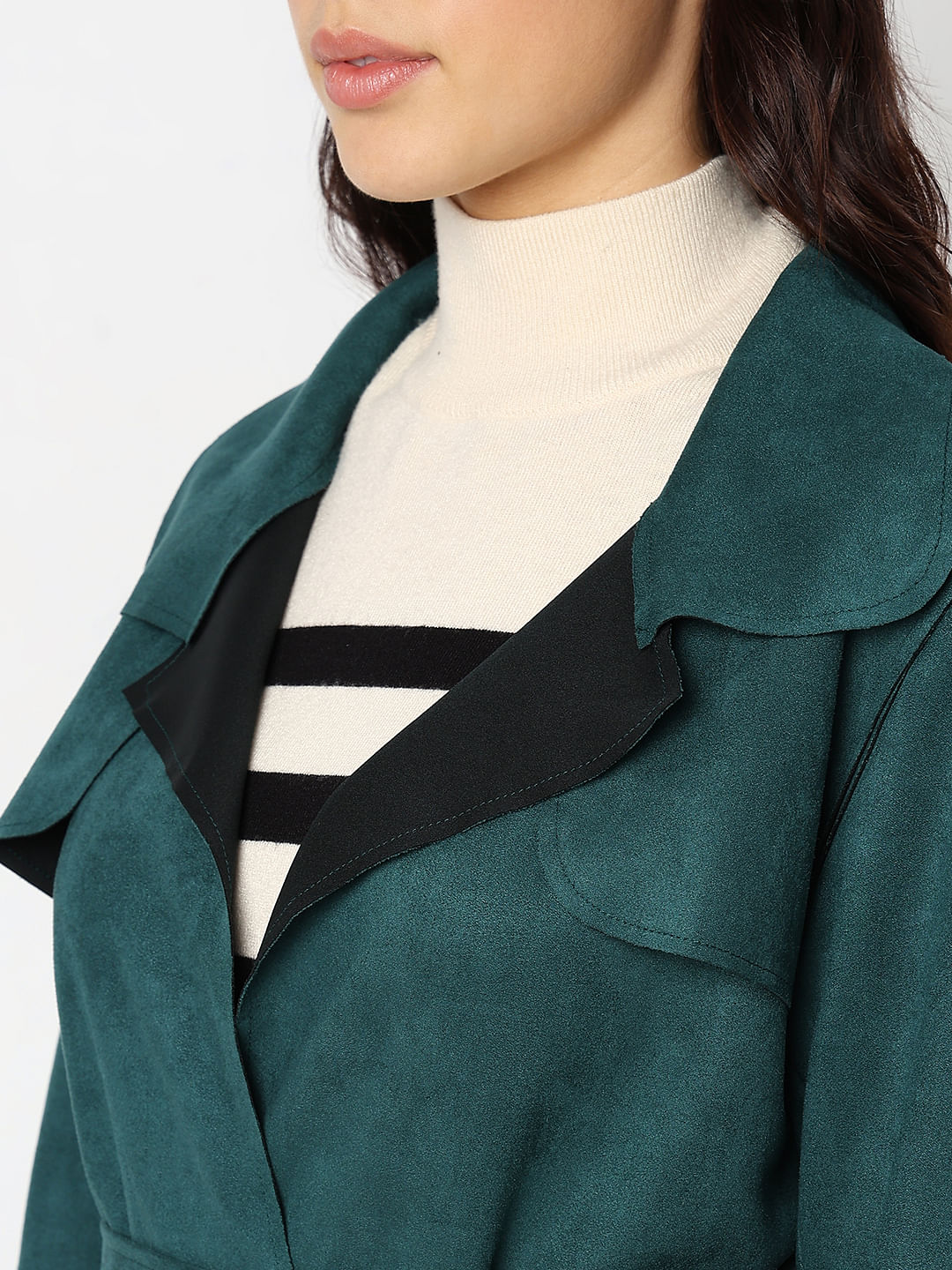 Women's green coloured jacket rendered in a premium faux suede fabric with full sleeves, self-fabric belt, notched lapel, and double front pockets.