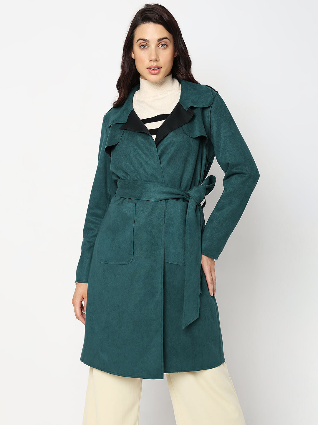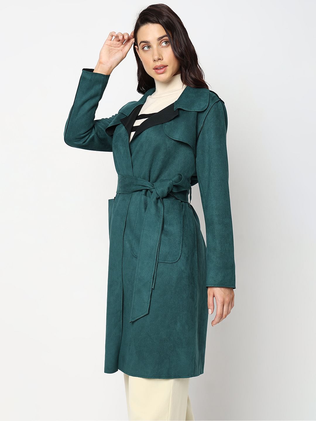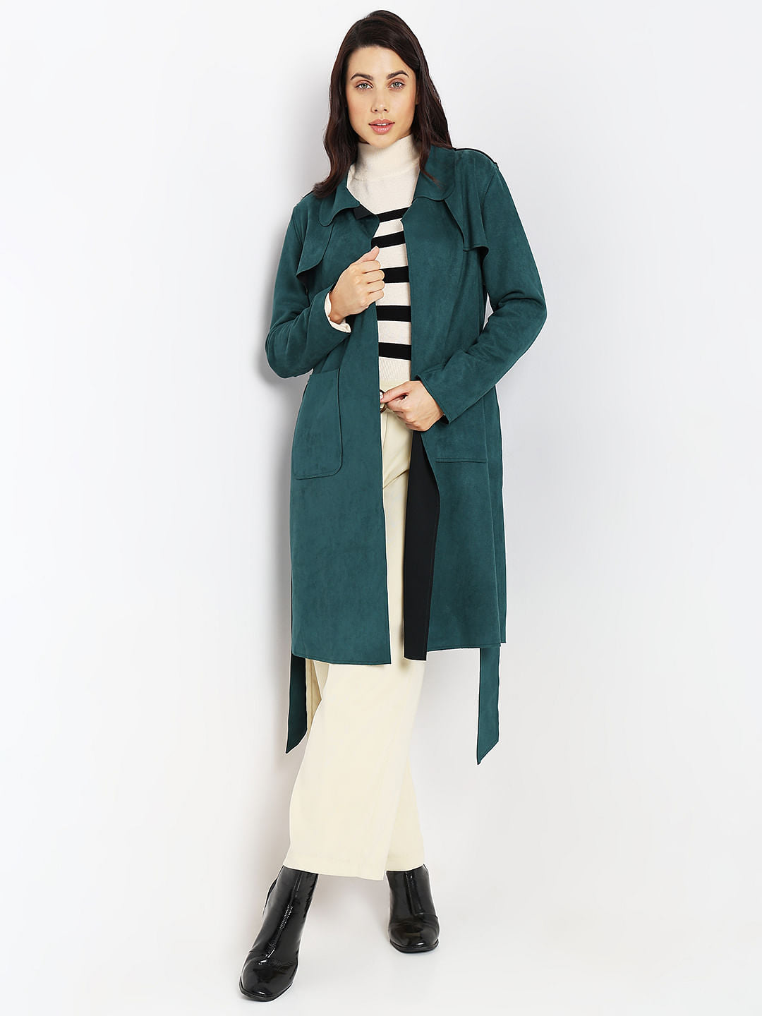 Women's green coloured jacket rendered in a premium faux suede fabric with full sleeves, self-fabric belt, notched lapel, and double front pockets.