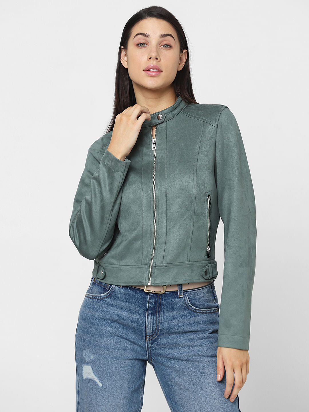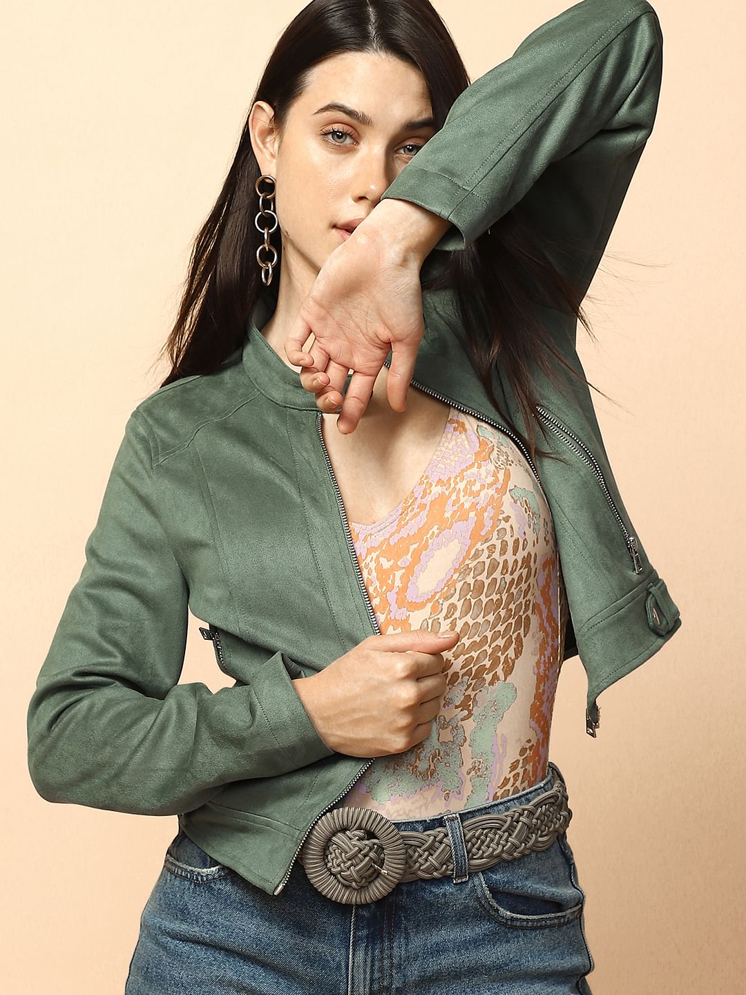 Women's biker jacket made from faux suede fabric. Designed with a high neck with a button closure, front zipper, full sleeves, side pockets with zippers, falls on waist, and offers a regular fit.