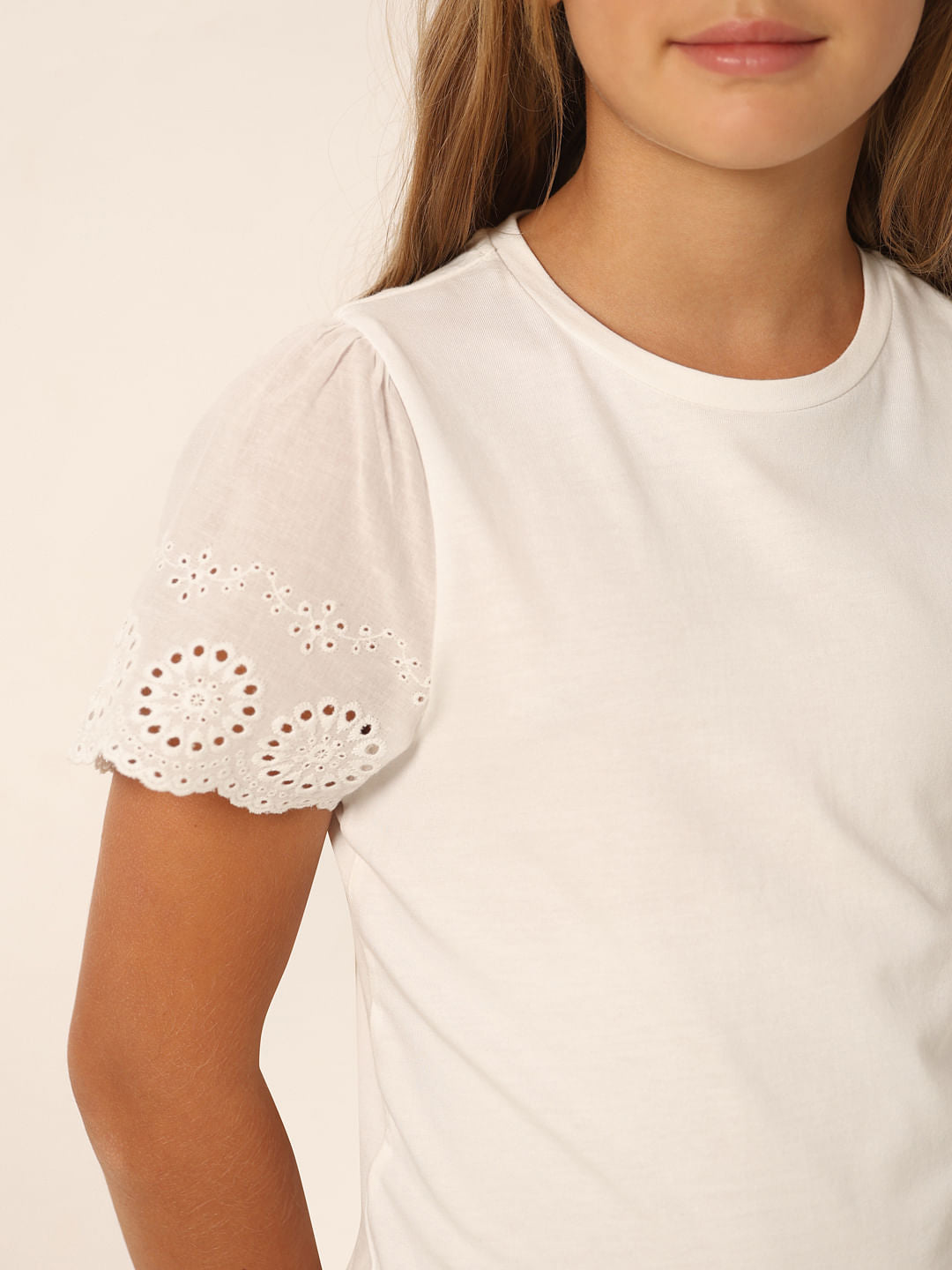 Made from the softest cotton, this top is a cuddle-friendly dream for your tiny trendsetter. The playful round neck adds a touch of sweetness, while the sleeves steal the show with intricate schiffli details – a sprinkle of magic for that extra dose of charm! Style Note: Pair it with comfy shorts or a flowy skirt for a look that's as breezy as a summer day.