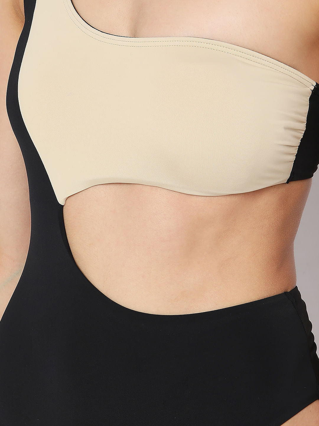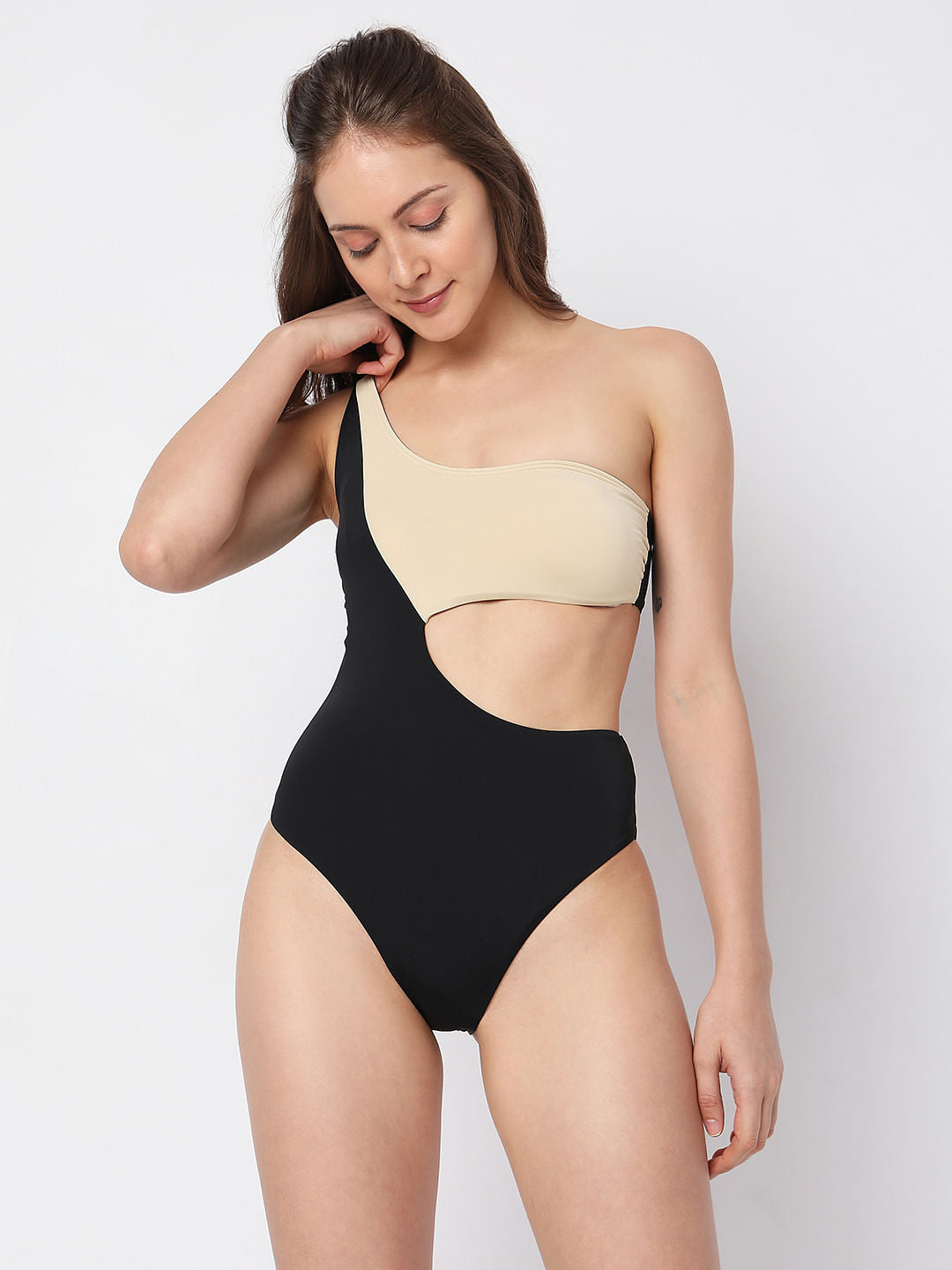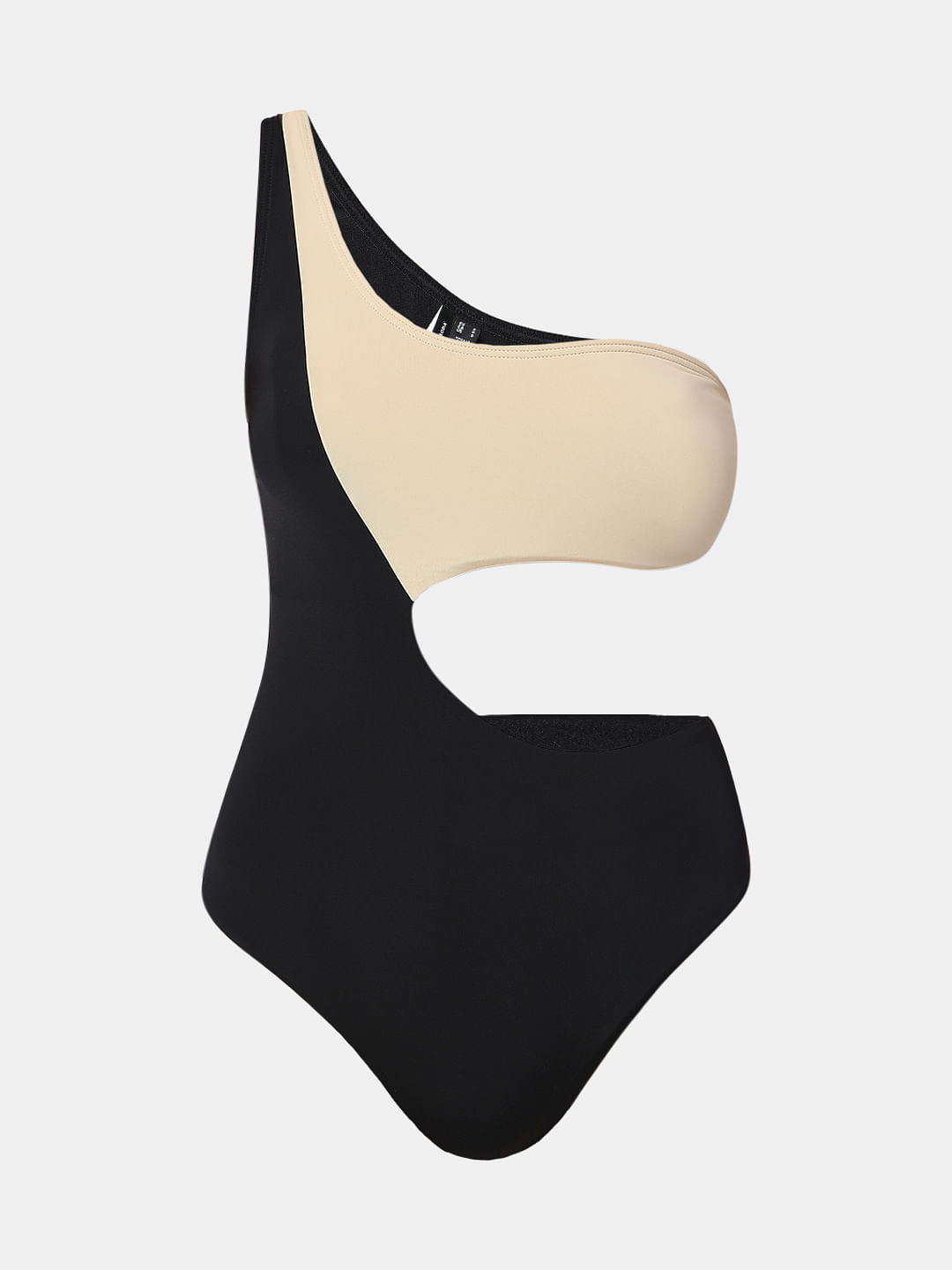 Dual toned/colourblocked one-shoulder swimsuit with a cut-out waist detail. The swimsuit is non-padded