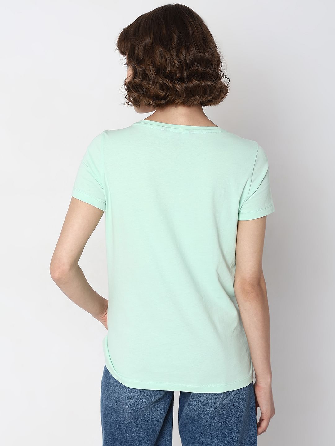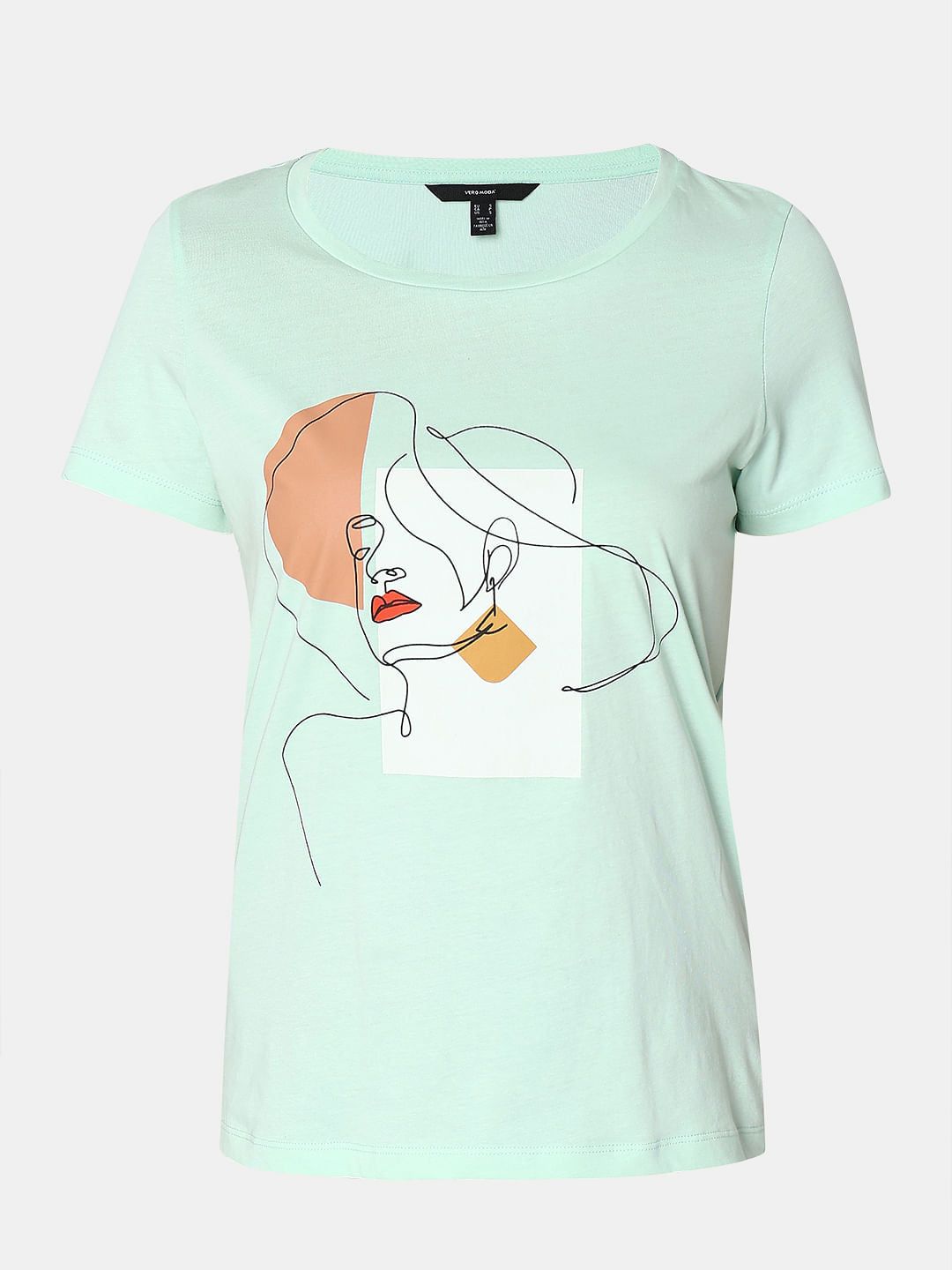 This Vero Moda T-Shirt is the perfect addition to your wardrobe. Its mint green colour and chest print will make a statement, while its short sleeves and round neck provide a classic look. This t-shirt falls on the hips for a flattering fit, and its regular fit ensures maximum comfort. Wear with high-waisted jeans or shorts for a stylish day time look, or pair with a leather skirt and strappy sandals for a more put-together evening ensemble.