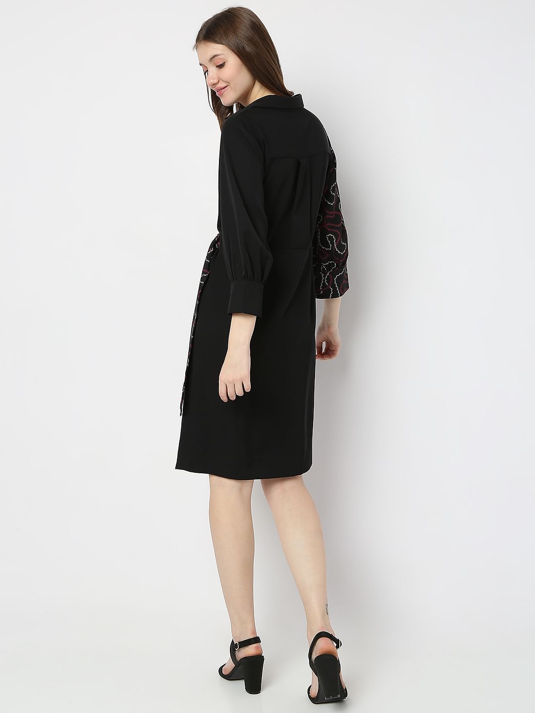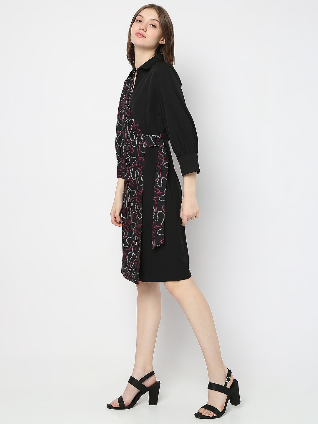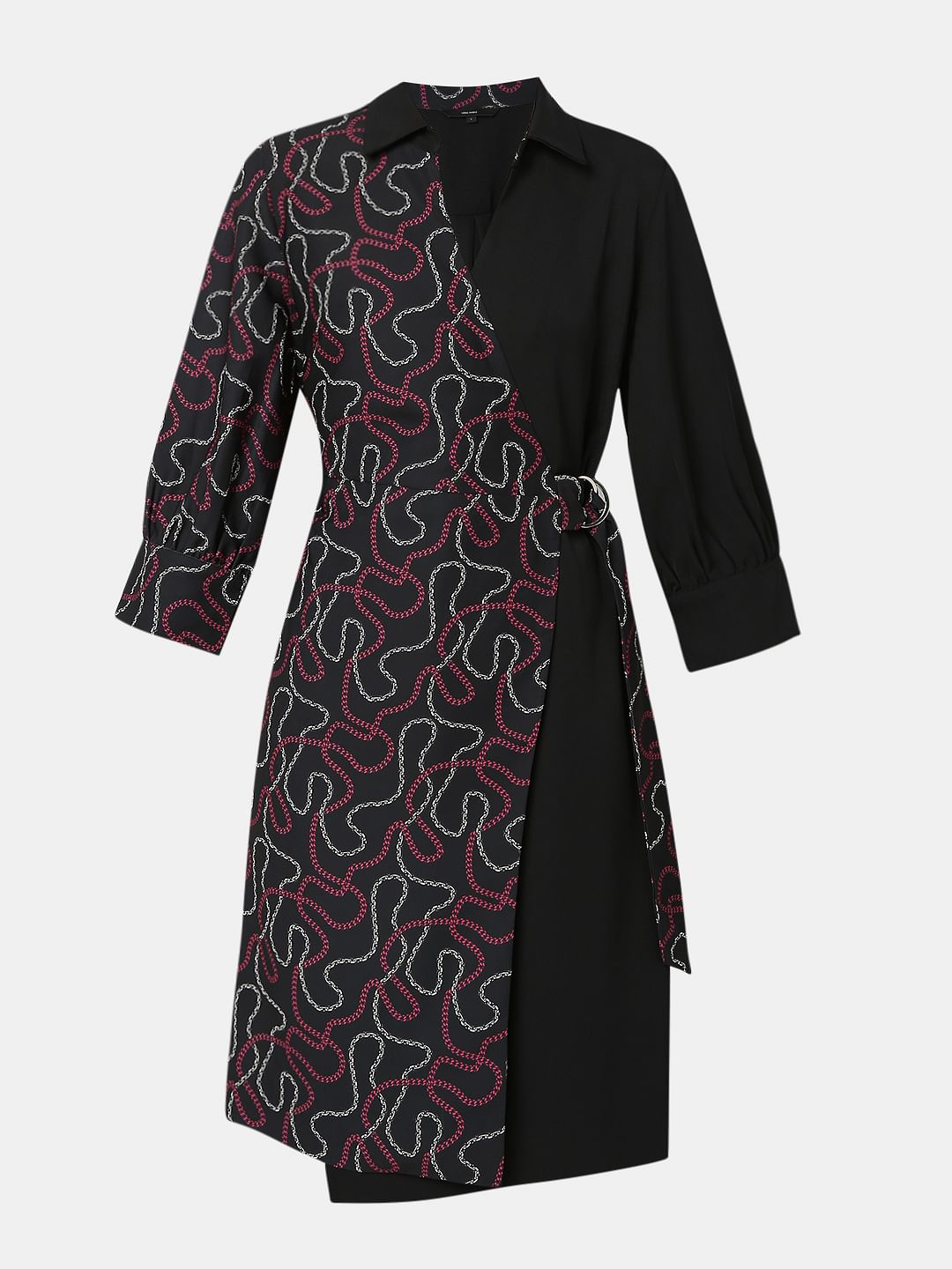 Wrap around abstract printed shirt dress in knee length and 3/4th sleeves. Perfect for a 9 to 5 look.