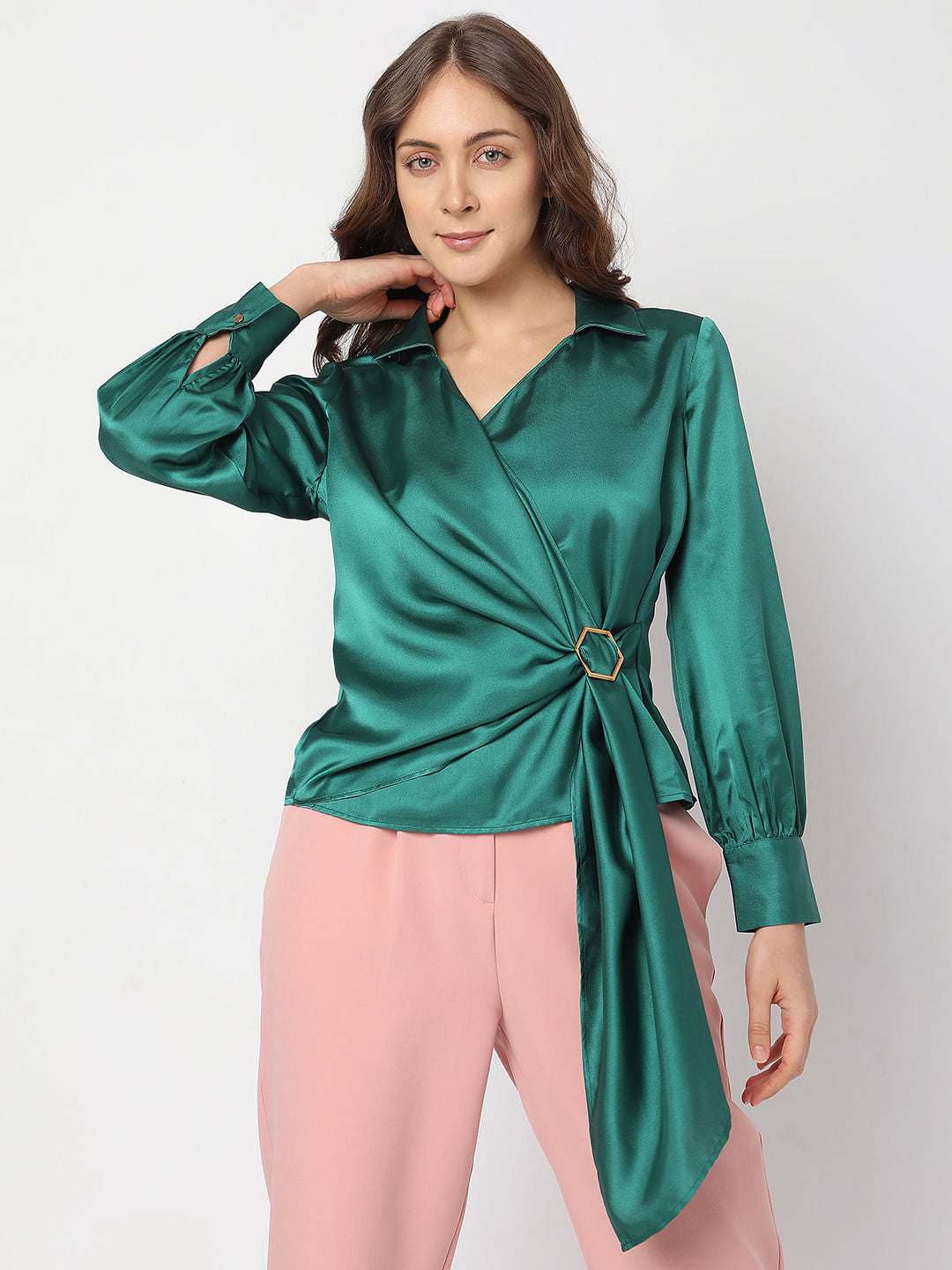 Solid satin top with a brooch detailed draped, long cuffed sleeves, regular collar, and falls at hip. Pair with beige pants and heels for a classy 9 to 5 look.