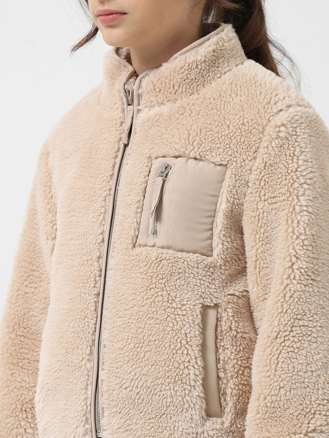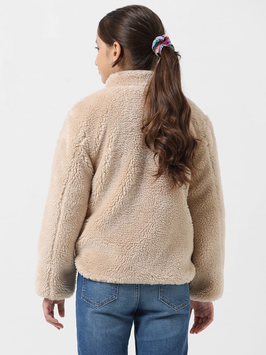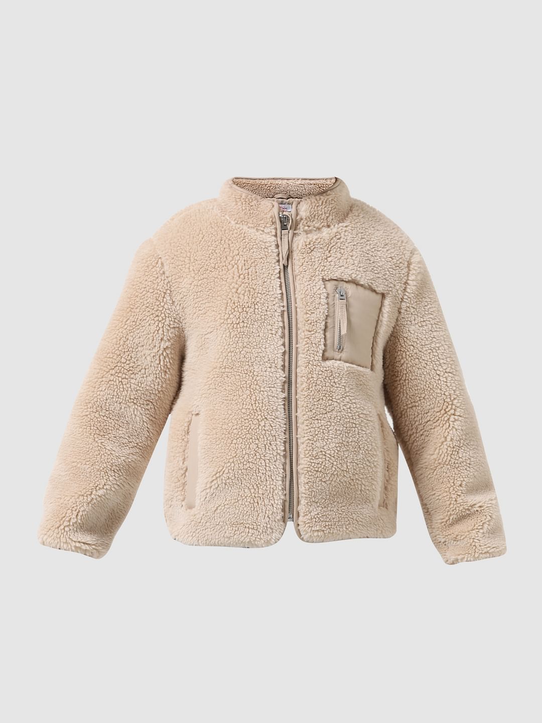 GIRL BEIGE HIGH NECK SHERPA JACKET